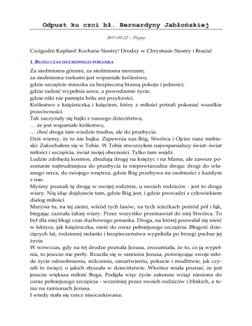 Odpust ku czci bł. Bernardyny Jabłońskiej 2011.09.22 – Pizuny Czcigodni Kapłani! Kochane Siostry! Drodzy w Chrystusie Siostry i Bracia! 1. BŁOGI CZAS DUCHOWEGO PORANKA Za siedmioma górami, za siedmioma morzami, za siedmioma rzekami jest wspaniałe królestwo, gdzie szczęście mieszka za bezpieczną bramą pokoju i jedności; gdzie radość wypełnia serce, a powodzenie życie, gdzie nikt nie pamięta bólu ani przykrości. Królestwo z księżniczką i księciem, który z miłości potrafi pokonać wszelkie przeciwności. Tak zaczynały się bajki z naszego dzieciństwa, … że jest wspaniałe królestwo, … choć droga tam wiedzie trudna, ale do przebycia. Dziś wiemy, że to nie bajka. Zapewnia nas Bóg, Stwórca i Ojciec nasz niebieski: Zakochałem się w Tobie. W Tobie stworzyłem najwspanialszy świat: świat miłości i szczęścia, świat mojej obecności. Tylko tam wejdź. Ludzie zdobędą kosmos, zbudują drogę na księżyc i na Marsa, ale zawsze pozostanie najtrudniejsza do przebycia ta niepowtarzalna droga: drogi do własnego serca, do swojego wnętrza, gdzie Bóg przebywa na osobności z każdym z nas. Myśmy poznali tę drogę w swojej rodzinie, u swoich rodziców - jest to droga wiary. Nią idąc dojdziecie tam, gdzie Bóg jest, i gdzie prowadzi z człowiekiem dialog miłości. Marysia tu, na tej ziemi, wśród tych lasów, na tych ścieżkach pośród pól i łąk, biegając zaznała takiej wiary. Przez wszystko przemawiał do niej Stwórca. To był dla niej błogi czas duchowego poranka. Droga, na której pozwalał się nieść w lektyce, jak księżniczka, nieść do coraz pełniejszego szczęścia. Błogość dziecięcych lat, rodzinnej sielanki i bezpieczeństwa wypełniła po brzegi puchar jej życia. W wówczas, gdy na tej drodze poznała Jezusa, zrozumiała, że to, co ją wypełnia, to jeszcze nie perły. Rzuciła się w ramiona Jezusa, poświęcając swoje młode życie odosobnieniu, milczeniu, umartwieniu, pokucie i modlitwie, jak czynili to święci, o jakich słyszała w dzieciństwie. Wkrótce miała poznać, że jest jeszcze większa miłość Boga. Podjęła więc życie zakonne wciąż niesiona do coraz pełniejszego szczęścia - wcześniej przez swoich rodziców i bliskich, a teraz na ramionach Jezusa. I wtedy stała się rzecz nieoczekiwana: jej wrażliwość zamiast piękna napotkała brud i wszy, jutrzenkę młodości przyćmił ludzka nędza z przeszłością przekreśloną, smutną, beznadziejną, a zamiast miłość, brak poczucia wdzięczności i wrogość. Pokój wewnętrzny zmąciło bolesne rozdacie duszy z powodu tak wielkiej moralnej nędzy. Bóg wyprowadził ją na pustynię i sam mówił do jej duszy: 216 "Dlatego oto Ja zwabię ją i wyprowadzę na pustynię, by przemówić do jej serca. 17b A ona odpowie mi jak za dni swej młodości 20 Poślubię cię sobie na wieki, poślubię cię sobie w sprawiedliwości i prawie, w dobroci i miłosierdziu. 21a Poślubię się sobie w wierności" /Oz/. Będąc pod opieką Brata Alberta, świętego człowieka obdarzonego intuicją i Bożym światłem, powierza się Jezusowi. "Oddaję Panu Jezusowi moją duszę, rozum, serce i wszystko, co mam. Ofiaruję się na wszystkie wątpliwości, oschłości wewnętrzne, udręczenia i męki duchowe - na wszystkie upokorzenia i wzgardy, na wszystkie boleści ciała i choroby. A za to nic nie chcę ani teraz, ani po śmierci, ponieważ tak czynię z miłości dla samego Pana Jezusa" /Akt osobistego oddania - Brat Albert i s. Bernardyna/ Nie rezygnuje z zakonu, lecz z lektyki i błogości, by z Jezusem dzielić to, czym stał się dla ludzi: cierpienie, radość, słabość. Wyznaje: "Pan Cię woła: Przyjdź! Gorliwość, żar, pokój, słodycz, cichość. Zwrócenie się ku Bogu: wszystko dla mnie - moim Bóg. Dopełniamy pracy Jezusa, Jego trudów, cierpień, miłości, cichości i boskich łez, a szczególniej Jego miłosierdzia nad nędzami dusz i ciała bliźnich naszych" /1916.07.13/. 2. DZIELENIE JEDNEJ MIŁOŚCI Człowiek, gdy cierpi, nie pyta o istotę cierpienia: Czy jest ono dobre, czy złe? Jest pewny, że cierpienie jest złem, które ściągnął na ludzi pierwszy grzech. Pyta o znaczenie cierpienia: Dlaczego? Dlaczego ja cierpię? Dlaczego mnie to spotyka? I dzięki wiarę w Jezusa, który przed nim cierpiał, może otrzymać niepowtarzalne doświadczenie, takie jak stało się udziałem pewnej duszy: - Gdy przyszło na mnie takie cierpienie, jakiego w życiu wcześniej nie znałem, gdy ból niszczył we mnie świadomość i myśli, gdy zaczął mieszać mi zmysły, wówczas podarowane zostało mi takie doświadczenie: 2 Ten Jezus, który z miłości przyszedł na ziemię, który wziął krzyż, który umarł na nim, a po trzech dniach zmartwychwstał, by w końcu wejść do chwały największej; dziś ten Jezus nie tylko jest z Tobą, ale On odczuwa twój ból, cierpi tak samo jak Ty. Kto doświadczył takiej miłości i uwierzył w nią, pragnie z Jezusem dzielić jedną miłość. On nie potrafi już żyć inaczej; bo wszystko wówczas zmienia się: on sam, jego życie, jego myślenie, pragnienie, jego miłość. Wszystko. "Wszystkie udręczenia, znudzenia, pokusy, cierpienia jakie przychodzą, cichutko spokojnie i cierpliwie przyjmować, nie wyrywać się z tego i nie wychodzić. Pozostawać w tym tak długo aż Pan Jezus usunie sam to cierpienie" /1906.01.21 - Zakopane/ - wyznaje nasza Błogosławiona. I odtąd już nie będzie modlił się o cierpliwość w cierpieniu, a tym bardziej o oddalenie bólu fizycznego, czy dotkliwego cierpienia psychicznego, czy udręczenia moralnego, czy też ciemnej nocy duchowej, lecz przyjmie je, by w ten sposób z Nim, ze swoim Jezusem dzielić jedną miłość - bo On jest miłością. 3. CIERPIENIE - MIŁOŚĆ - MIŁOSIERDZIE Dzielenie z Nim miłości doprowadziło Bernardynę do czynów miłosierdzia. "Cierpienie i trud ustaje a miłosierdzie idzie dalej. …. Chciałabym czynić zadość każdej p
