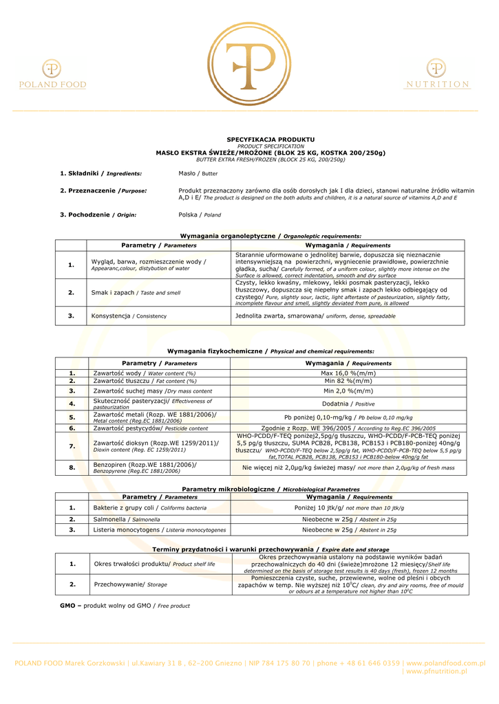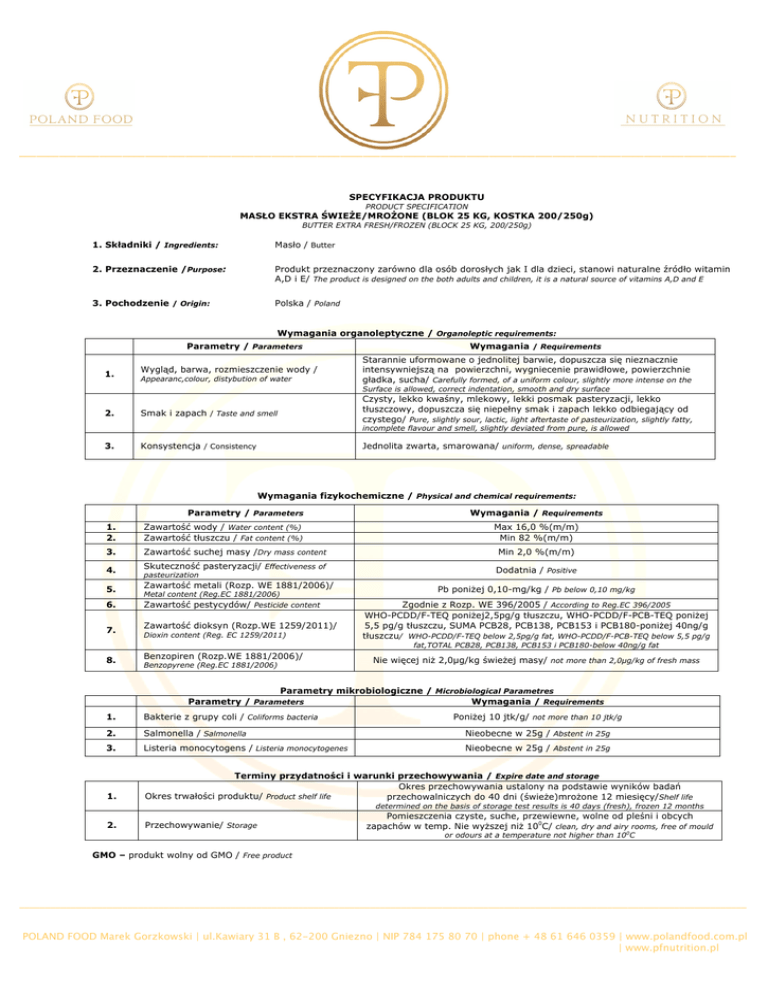_____________________________________________________________________________________________________________________________ SPECYFIKACJA PRODUKTU PRODUCT SPECIFICATION MASŁO EKSTRA ŚWIEŻE/MROŻONE (BLOK 25 KG, KOSTKA 200/250g) BUTTER EXTRA FRESH/FROZEN (BLOCK 25 KG, 200/250g) 1. Składniki / Ingredients: Masło / Butter 2. Przeznaczenie /Purpose: Produkt przeznaczony zarówno dla osób dorosłych jak I dla dzieci, stanowi naturalne źródło witamin A,D i E/ The product is designed on the both adults and children, it is a natural source of vitamins A,D and E 3. Pochodzenie / Origin: Polska / Poland Wymagania organoleptyczne / Organoleptic requirements: Parametry / Parameters 1. Wygląd, barwa, rozmieszczenie wody / Appearanc,colour, distybution of water Wymagania / Requirements Starannie uformowane o jednolitej barwie, dopuszcza się nieznacznie intensywniejszą na powierzchni, wygniecenie prawidłowe, powierzchnie gładka, sucha/ Carefully formed, of a uniform colour, slightly more intense on the Surface is allowed, correct indentation, smooth and dry surface 2. Smak i zapach / Taste and smell Czysty, lekko kwaśny, mlekowy, lekki posmak pasteryzacji, lekko tłuszczowy, dopuszcza się niepełny smak i zapach lekko odbiegający od czystego/ Pure, slightly sour, lactic, light aftertaste of pasteurization, slightly fatty, incomplete flavour and smell, slightly deviated from pure, is allowed 3. Konsystencja / Consistency Jednolita zwarta, smarowana/ uniform, dense, spreadable Wymagania fizykochemiczne / Physical and chemical requirements: Parametry / Parameters 1. 2. Zawartość wody / Water content (%) Zawartość tłuszczu / Fat content (%) 3. Zawartość suchej masy /Dry mass content 4. 5. 6. 7. Skuteczność pasteryzacji/ Effectiveness of pasteurization Zawartość metali (Rozp. WE 1881/2006)/ Metal content (Reg.EC 1881/2006) Zawartość pestycydów/ Pesticide content Zawartość dioksyn (Rozp.WE 1259/2011)/ Dioxin content (Reg. EC 1259/2011) Wymagania / Requirements Max 16,0 %(m/m) Min 82 %(m/m) Min 2,0 %(m/m) Dodatnia / Positive Pb poniżej 0,10-mg/kg / Pb below 0,10 mg/kg Zgodnie z Rozp. WE 396/2005 / According to Reg.EC 396/2005 WHO-PCDD/F-TEQ poniżej2,5pg/g tłuszczu, WHO-PCDD/F-PCB-TEQ poniżej 5,5 pg/g tłuszczu, SUMA PCB28, PCB138, PCB153 i PCB180-poniżej 40ng/g tłuszczu/ WHO-PCDD/F-TEQ below 2,5pg/g fat, WHO-PCDD/F-PCB-TEQ below 5,5 pg/g fat,TOTAL PCB28, PCB138, PCB153 i PCB180-below 40ng/g fat 8. Benzopiren (Rozp.WE 1881/2006)/ Benzopyrene (Reg.EC 1881/2006) Nie więcej niż 2,0µg/kg świeżej masy/ not more than 2,0µg/kg of fresh mass Parametry mikrobiologiczne / Microbiological Parametres Parametry / Parameters Wymagania / Requirements 1. Bakterie z grupy coli / Coliforms bacteria 2. Salmonella / Salmonella Poniżej 10 jtk/g/ not more than 10 jtk/g Nieobecne w 25g / Abstent in 25g 3. Listeria monocytogens / Listeria monocytogenes Nieobecne w 25g / Abstent in 25g 1. Terminy przydatności i warunki przechowywania / Expire date and storage Okres przechowywania ustalony na podstawie wyników badań Okres trwałości produktu/ Product shelf life przechowalniczych do 40 dni (świeże)mrożone 12 miesięcy/Shelf life determined on the basis of storage test results is 40 days (fresh), frozen 12 months 2. Przechowywanie/ Storage Pomieszczenia czyste, suche, przewiewne, wolne od pleśni i obcych zapachów w temp. Nie wyższej niż 100C/ clean, dry and airy rooms, free of mould or odours at a temperature not higher than 100C GMO – produkt wolny od GMO / Free product _____________________________________________________________________________________________________________________________________________ POLAND FOOD Marek Gorzkowski | ul.Kawiary 31 B , 62-200 Gniezno | NIP 784 175 80 70 | phone + 48 61 646 0359 | www.polandfood.com.pl | www.pfnutrition.pl