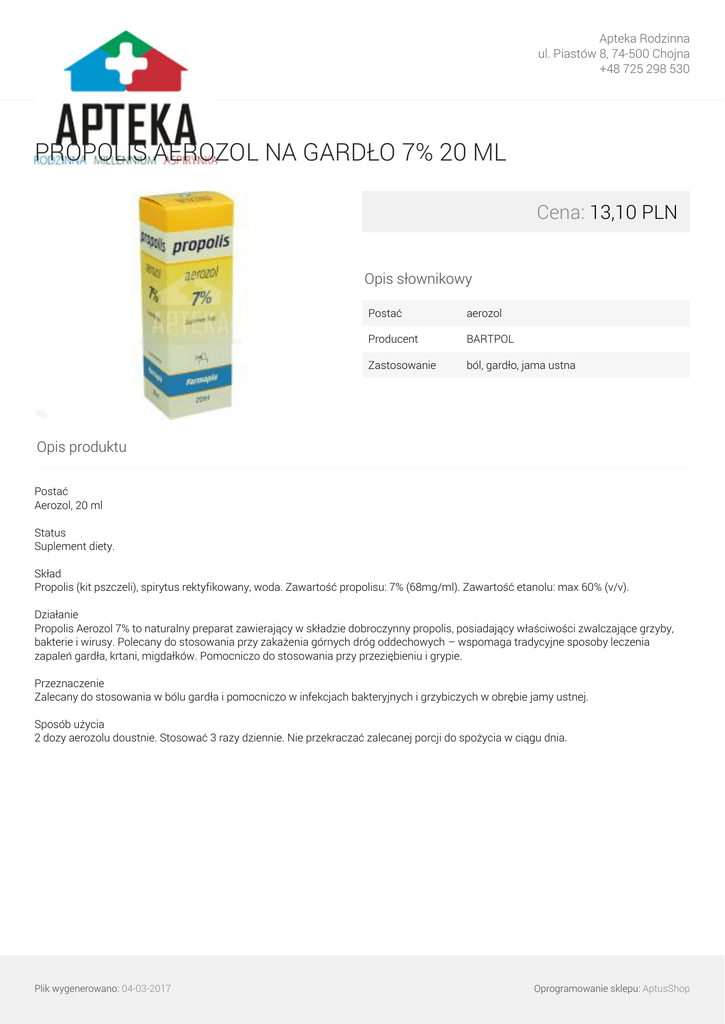 Apteka Rodzinna ul. Piastów 8, 74-500 Chojna +48 725 298 530 PROPOLIS AEROZOL NA GARDŁO 7% 20 ML Cena: 13,10 PLN Opis słownikowy Postać aerozol Producent BARTPOL Zastosowanie ból, gardło, jama ustna Opis produktu Postać Aerozol, 20 ml Status Suplement diety. Skład Propolis (kit pszczeli), spirytus rektyfikowany, woda. Zawartość propolisu: 7% (68mg/ml). Zawartość etanolu: max 60% (v/v). Działanie Propolis Aerozol 7% to naturalny preparat zawierający w składzie dobroczynny propolis, posiadający właściwości zwalczające grzyby, bakterie i wirusy. Polecany do stosowania przy zakażenia górnych dróg oddechowych – wspomaga tradycyjne sposoby leczenia zapaleń gardła, krtani, migdałków. Pomocniczo do stosowania przy przeziębieniu i grypie. Przeznaczenie Zalecany do stosowania w bólu gardła i pomocniczo w infekcjach bakteryjnych i grzybiczych w obrębie jamy ustnej. Sposób użycia 2 dozy aerozolu doustnie. Stosować 3 razy dziennie. Nie przekraczać zalecanej porcji do spożycia w ciągu dnia. Plik wygenerowano: 04-03-2017 Powered by TCPDF (www.tcpdf.org) Oprogramowanie sklepu: AptusShop