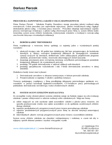 Dariusz Pierzak szkolenia projekty doradztwo PROCEDURA ZAPEWNIENIA JAKOŚCI USŁUG ROZWOJOWYCH Firma Dariusz Pierzak – Szkolenia Projekty Doradztwo stosuje procedurę jakości realizacji usług rozwojowych. Celem procedury jest zapewnienie najwyższej jakości świadczonych usług, ciągłego doskonalenia jakości usług i warsztatu pracy trenerów. Procedura obejmuje najważniejsze aspekty procesu rozwojowego świadczące o jakości usług oferowanych przez firmę tj. system doboru kadry trenerskiej, system oceny efektów kształcenia, wykorzystanie wniosków z ewaluacji w rozwoju usług oraz kwestie dotyczące ewentualnych reklamacji. I. DOBÓR KADRY TRENERSKIEJ Firma współpracuje z trenerami, którzy spełniają co najmniej jeden z wymienionych poniżej warunków: 1. ukończyli trwający min. 60 godzin kurs dydaktyczny lub kurs przygotowujący do kształcenia dorosłych, tj. służący rozwojowi kompetencji zbliżonych do następujących: rozumienie sytuacji uczących się dorosłych, definiowanie celów edukacyjnych, projektowanie programu szkolenia, prezentowanie wiedzy, stosowanie aktywizujących metod nauczania 2. dysponują przyznanym przez zewnętrzną instytucję certyfikatem potwierdzającym posiadanie kompetencji zbliżonych do wymienionych powyżej 3. posiadają 750 godzin doświadczenia w zakresie edukacji osób dorosłych 4. posiadają specjalistyczne wykształcenie i min. 5-letnie doświadczenie zawodowe w danej dziedzinie. Dodatkowo każdy trener musi wykazać: 1. Doświadczenie zawodowe w obszarze tematycznym, w którym prowadzi szkolenia. 2. Przeprowadzenie co najmniej 3 szkoleń o podobnej tematyce. Trenerzy podejmujący współpracę z firmą przedkładają dokumenty potwierdzające spełnienie ww. warunków w postaci kserokopii dyplomów/certyfikatów, CV/świadectw pracy potwierdzających podsiadanie doświadczenia zawodowego; wykaz zrealizowanych szkoleń. II. SYSTEM OCENY EFEKTÓW KSZTAŁCENIA Za szczególnie ważny element jakości systemu szkolenia uznaje się badania mające na celu ewaluację szkolenia i pomiar efektywności w zakresie realizacji celów szkoleniowych. Mają one formę: a) ankiet mających na celu uzyskanie opinii uczestników szkoleń o jakości pracy trenerów, ich sposobu przekazywania wiedzy oraz opinie uczestników co do spełnienia oczekiwanych efektów danego szkolenia b) raportów poszkoleniowych przygotowywanych przez trenera prowadzącego szkolenia c) raportów poszkoleniowych przygotowywanych przez firmę na zlecenie instytucji zamawiającej szkolenie d) indywidualnych planów rozwoju przygotowywanych przez trenera z uczestnikiem szkolenia System oceny efektów szkolenia ma charakter wielopoziomowy i rozłożony w czasie tak aby w najlepszy sposób dokonać pomiaru i uzyskać wiarygodne wyniki. www.dariuszpierzak.pl || www.trenerfinansow.pl ul. Ujejskiego 316 32-400 Myślenice Tel. 505 421 351 [email protected] Dariusz Pierzak szkolenia projekty doradztwo Wyniki badań są wykorzystywane do: 1. Ciągłego doskonalenia jakości kształcenia 2. Okresowej oceny trenerów współpracujących z firmą III. REKLAMACJE Uczestnik szkolenia/klient zamawiający szkolenie może zgłosić reklamację w ciągu 14 dni od zakończenia świadczenia usługi szkoleniowej. Reklamacje dotyczące świadczonych przez firmę usług szkoleniowych mogą być zgłaszane w formie pisemnej za pośrednictwem poczty listem poleconym, faksu, osobiście na adres firmy. Oceny zasadności reklamacji dokonuje właściciel firmy po sprawdzeniu realizacji usługi zgodnie z przyjętymi standardami i procedurami obowiązującymi w firmie oraz rozmowie z trenerem prowadzącym szkolenie. W przypadku uznania reklamacji przewiduje się następujące firmy rekompensaty: - ponowne szkolenie - dodatkowe indywidualne konsultacje tematyczne dla uczestników lub inne szkolenie - rekompensatę finansową w postaci zwrotu części lub całości kosztów szkolenia Każda reklamacja podlega rejestracji w księdze reklamacji i służy do oceny działania firmy dokonywanej corocznie przez właściciela. IV. WYSTĄPIENIE NIEPRZEWIDZIANYCH OKOLICZNOŚCI UNIEMOŻLIWIAJĄCYCH PRZEPROWADZENIE SZKOLENIA. 1. W przypadku, gdy trener wyznaczony do realizacji szkolenia nie może wykonać usługi w wyznaczonym terminie zgłasza ten fakt do biura firmy lub koordynatora organizacyjnego (w przypadku szkoleń trwających powyżej 16 h), którzy kontaktują się z Klientem i proponują zmianę trenera (Klientowi przedstawiana jest notka trenerska nowego trenera) lub ustalenie nowego terminu szkolenia z pierwotnie wyznaczonym trenerem. 2. W przypadku zaistnienia sytuacji dotyczącej braku możliwości organizacji szkolenia z powodu braku dostępności sali szkoleniowej na skutek wystąpienia zdarzenia losowego trener, który znajduje się na miejscu informuje o tym fakcie biuro firmy/ koordynatora organizacyjnego szkolenia (w przypadku szkoleń trwających powyżej 16 h). Biuro firmy lub odpowiednio koordynator organizacyjny podejmują próbę znalezienia sali rezerwowej, w której mogłyby zostać zorganizowane zajęcia. Jeżeli sala rezerwowa nie zostanie znaleziona w ciągu 30 minut od zgłoszenia problemu szkolenie jest odwoływane i ustala się nowy termin szkolenia. www.dariuszpierzak.pl || www.trenerfinansow.pl ul. Ujejskiego 316 32-400 Myślenice Tel. 505 421 351 [email protected]