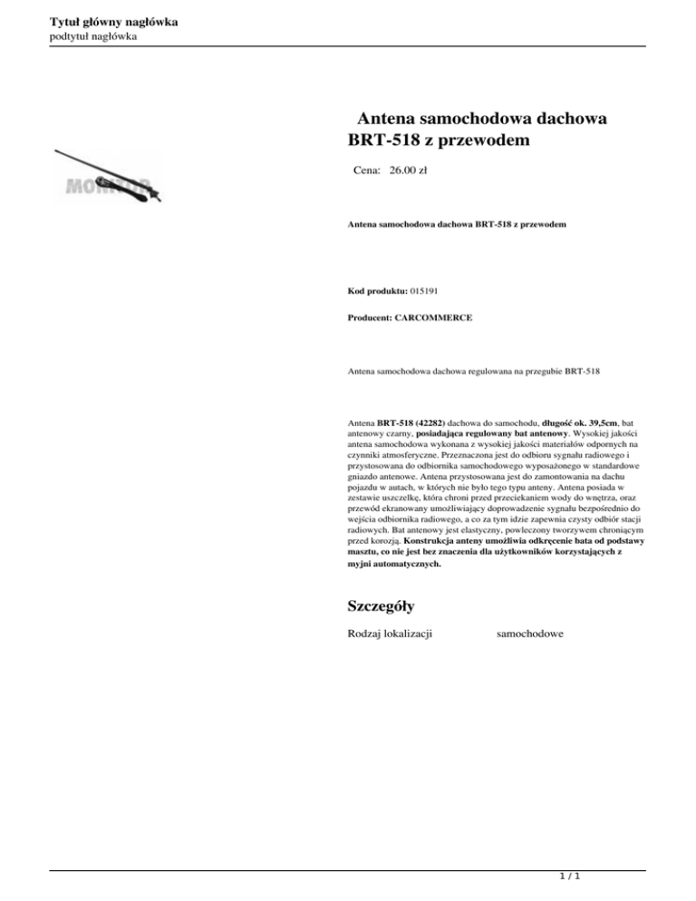Tytuł główny nagłówka podtytuł nagłówka Antena samochodowa dachowa BRT-518 z przewodem Cena: 26.00 zł Antena samochodowa dachowa BRT-518 z przewodem Kod produktu: 015191 Producent: CARCOMMERCE Antena samochodowa dachowa regulowana na przegubie BRT-518 Antena BRT-518 (42282) dachowa do samochodu, długość ok. 39,5cm, bat antenowy czarny, posiadająca regulowany bat antenowy. Wysokiej jakości antena samochodowa wykonana z wysokiej jakości materiałów odpornych na czynniki atmosferyczne. Przeznaczona jest do odbioru sygnału radiowego i przystosowana do odbiornika samochodowego wyposażonego w standardowe gniazdo antenowe. Antena przystosowana jest do zamontowania na dachu pojazdu w autach, w których nie było tego typu anteny. Antena posiada w zestawie uszczelkę, która chroni przed przeciekaniem wody do wnętrza, oraz przewód ekranowany umożliwiający doprowadzenie sygnału bezpośrednio do wejścia odbiornika radiowego, a co za tym idzie zapewnia czysty odbiór stacji radiowych. Bat antenowy jest elastyczny, powleczony tworzywem chroniącym przed korozją. Konstrukcja anteny umożliwia odkręcenie bata od podstawy masztu, co nie jest bez znaczenia dla użytkowników korzystających z myjni automatycznych. Szczegóły Rodzaj lokalizacji samochodowe 1/1 Powered by TCPDF (www.tcpdf.org)