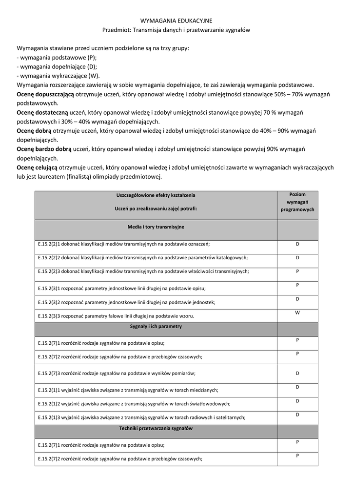 WYMAGANIA EDUKACYJNE Przedmiot: Transmisja danych i przetwarzanie sygnałów Wymagania stawiane przed uczniem podzielone są na trzy grupy: - wymagania podstawowe (P); - wymagania dopełniające (D); - wymagania wykraczające (W). Wymagania rozszerzające zawierają w sobie wymagania dopełniające, te zaś zawierają wymagania podstawowe. Ocenę dopuszczającą otrzymuje uczeń, który opanował wiedzę i zdobył umiejętności stanowiące 50% – 70% wymagań podstawowych. Ocenę dostateczną uczeń, który opanował wiedzę i zdobył umiejętności stanowiące powyżej 70 % wymagań podstawowych i 30% – 40% wymagań dopełniających. Ocenę dobrą otrzymuje uczeń, który opanował wiedzę i zdobył umiejętności stanowiące do 40% – 90% wymagań dopełniających. Ocenę bardzo dobrą uczeń, który opanował wiedzę i zdobył umiejętności stanowiące powyżej 90% wymagań dopełniających. Ocenę celującą otrzymuje uczeń, który opanował wiedzę i zdobył umiejętności zawarte w wymaganiach wykraczających lub jest laureatem (finalistą) olimpiady przedmiotowej. Uszczegółowione efekty kształcenia Uczeń po zrealizowaniu zajęć potrafi: Poziom wymagań programowych Media i tory transmisyjne E.15.2(2)1 dokonać klasyfikacji mediów transmisyjnych na podstawie oznaczeń; D E.15.2(2)2 dokonać klasyfikacji mediów transmisyjnych na podstawie parametrów katalogowych; D E.15.2(2)3 dokonać klasyfikacji mediów transmisyjnych na podstawie właściwości transmisyjnych; P E.15.2(3)1 rozpoznać parametry jednostkowe linii długiej na podstawie opisu; E.15.2(3)2 rozpoznać parametry jednostkowe linii długiej na podstawie jednostek; E.15.2(3)3 rozpoznać parametry falowe linii długiej na podstawie wzoru. P D W Sygnały i ich parametry E.15.2(7)1 rozróżnić rodzaje sygnałów na podstawie opisu; E.15.2(7)2 rozróżnić rodzaje sygnałów na podstawie przebiegów czasowych; E.15.2(7)3 rozróżnić rodzaje sygnałów na podstawie wyników pomiarów; E.15.2(1)1 wyjaśnić zjawiska związane z transmisją sygnałów w torach miedzianych; E.15.2(1)2 wyjaśnić zjawiska związane z transmisją sygnałów w torach światłowodowych; E.15.2(1)3 wyjaśnić zjawiska związane z transmisją sygnałów w torach radiowych i satelitarnych; P P D D D D Techniki przetwarzania sygnałów E.15.2(7)1 rozróżnić rodzaje sygnałów na podstawie opisu; E.15.2(7)2 rozróżnić rodzaje sygnałów na podstawie przebiegów czasowych; P P E.15.2(7)3 rozróżnić rodzaje sygnałów na podstawie wyników pomiarów; E.15.2(1)1 wyjaśnić zjawiska związane z transmisją sygnałów w torach miedzianych; E.15.2(1)2 wyjaśnić zjawiska związane z transmisją sygnałów w torach światłowodowych; E.15.2(1)3 wyjaśnić zjawiska związane z transmisją sygnałów w torach radiowych i satelitarnych; W P P P Wybrane zagadnienia komutacji i sygnalizacji E.15.3(1)1 rozróżnić rodzaje komutacji na podstawie opisu E.15.3(1)2 rozróżnić rodzaje komutacji na podstawie obszarów zastosowań E.15.3(4)1 rozróżnić rodzaje i typy sygnalizacji w łączach abonenckich na podstawie opisu E.15.3(4)2 rozróżnić rodzaje i typy sygnalizacji w łączach abonenckich na podstawie systemu transmisyjnego, w którym jest stosowana E.15.3(5)1 rozpoznać sygnały w łączu abonenckim na podstawie opisu E.15.3(5)2 rozpoznać sygnały w łączu abonenckim na podstawie przebiegu czasowego P P P P P P Pomiary w torach transmisyjnych i łączach abonenckich E.15.2(16)1 wykonać pomiary transmisyjnych parametrów toru miedzianego; E.15.2(16)2 wykonać pomiary transmisyjnych parametrów toru światłowodowego; E.15.2(16)3 wykonać pomiary transmisyjnych parametrów toru radiowego; E.15.3(6)1 wykonać pomiary linii abonenckiej za pomocą oscyloskopu; E.15.3(6)2 wykonać pomiary linii abonenckiej za pomocą multimetru cyfrowego; E.15.3(17)1 zlokalizować i usunąć zwarcia w liniach abonenckich na podstawie pomiarów reflektometrem TDR; E.15.3(17)2 zlokalizować i usunąć przerwy w liniach abonenckich na podstawie pomiarów reflektometrem TDR. D W D W W W W