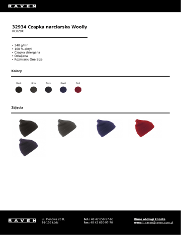 32934 Czapka narciarska Woolly RC029X • 340 g/m² • 100 % akryl • Czapka dziergana • Odwijana • Rozmiary: One Size Kolory Black Grey Navy Royal Red Zdjęcia ul. Plonowa 20 B, 91-156 Łódź tel.: 48 42 650-97-60 fax: 48 42 650-97-70 Biuro obsługi klienta e-mail: [email protected]