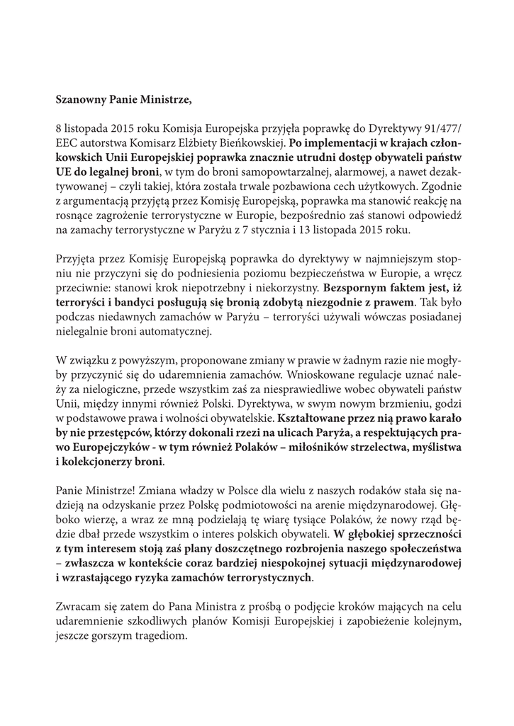 Szanowny Panie Ministrze, 8 listopada 2015 roku Komisja Europejska przyjęła poprawkę do Dyrektywy 91/477/ EEC autorstwa Komisarz Elżbiety Bieńkowskiej. Po implementacji w krajach członkowskich Unii Europejskiej poprawka znacznie utrudni dostęp obywateli państw UE do legalnej broni, w tym do broni samopowtarzalnej, alarmowej, a nawet dezaktywowanej – czyli takiej, która została trwale pozbawiona cech użytkowych. Zgodnie z argumentacją przyjętą przez Komisję Europejską, poprawka ma stanowić reakcję na rosnące zagrożenie terrorystyczne w Europie, bezpośrednio zaś stanowi odpowiedź na zamachy terrorystyczne w Paryżu z 7 stycznia i 13 listopada 2015 roku. Przyjęta przez Komisję Europejską poprawka do dyrektywy w najmniejszym stopniu nie przyczyni się do podniesienia poziomu bezpieczeństwa w Europie, a wręcz przeciwnie: stanowi krok niepotrzebny i niekorzystny. Bezspornym faktem jest, iż terroryści i bandyci posługują się bronią zdobytą niezgodnie z prawem. Tak było podczas niedawnych zamachów w Paryżu – terroryści używali wówczas posiadanej nielegalnie broni automatycznej. W związku z powyższym, proponowane zmiany w prawie w żadnym razie nie mogłyby przyczynić się do udaremnienia zamachów. Wnioskowane regulacje uznać należy za nielogiczne, przede wszystkim zaś za niesprawiedliwe wobec obywateli państw Unii, między innymi również Polski. Dyrektywa, w swym nowym brzmieniu, godzi w podstawowe prawa i wolności obywatelskie. Kształtowane przez nią prawo karało by nie przestępców, którzy dokonali rzezi na ulicach Paryża, a respektujących prawo Europejczyków - w tym również Polaków – miłośników strzelectwa, myślistwa i kolekcjonerzy broni. Panie Ministrze! Zmiana władzy w Polsce dla wielu z naszych rodaków stała się nadzieją na odzyskanie przez Polskę podmiotowości na arenie międzynarodowej. Głęboko wierzę, a wraz ze mną podzielają tę wiarę tysiące Polaków, że nowy rząd będzie dbał przede wszystkim o interes polskich obywateli. W głębokiej sprzeczności z tym interesem stoją zaś plany doszczętnego rozbrojenia naszego społeczeństwa – zwłaszcza w kontekście coraz bardziej niespokojnej sytuacji międzynarodowej i wzrastającego ryzyka zamachów terrorystycznych. Zwracam się zatem do Pana Ministra z prośbą o podjęcie kroków mających na celu udaremnienie szkodliwych planów Komisji Europejskiej i zapobieżenie kolejnym, jeszcze gorszym tragediom.