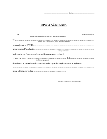 ................................................................., dnia ........................................................... UPOWAŻNIENIE Ja, ................................................................................................................., zamieszkały/a (podać imię i nazwisko oraz imię ojca osoby upoważniającej) w ................................................................................................................................................... (podać adres – miejscowość, ulica, nr domu i nr lokalu) posiadający/a nr PESEL ............................................................................................................... upoważniam Pana/Panią .............................................................................................................. (imię i nazwisko) legitymującego/ą się dowodem osobistym o numerze i serii ....................................................... wydanym przez ......................................................................... dnia .......................................... (podać nazwę organu) do odbioru w moim imieniu zaświadczenia o prawie do głosowania w wyborach ..................... ......................................................................................................................................................, które odbędą się w dniu ........................................................... ........................................................................ (czytelny podpis osoby upoważniającej)