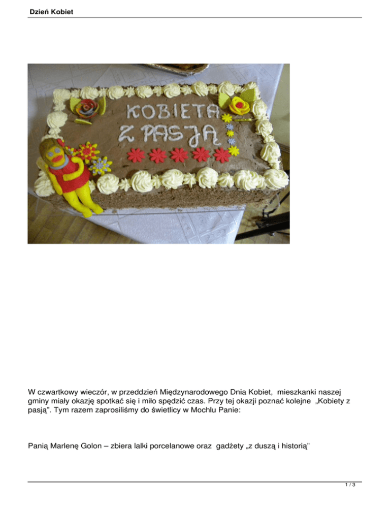 Dzień Kobiet W czwartkowy wieczór, w przeddzień Międzynarodowego Dnia Kobiet, mieszkanki naszej gminy miały okazję spotkać się i miło spędzić czas. Przy tej okazji poznać kolejne „Kobiety z pasją”. Tym razem zaprosiliśmy do świetlicy w Mochlu Panie: Panią Marlenę Golon – zbiera lalki porcelanowe oraz gadżety „z duszą i historią” 1/3 Dzień Kobiet Panią Jolanta Grygiel – zajmuje się bibułkarstwem – doszła w tym do perfekcji, wykonuje kartki okolicznościowe oraz kompozycje florystyczne. Panią Beatę Jasik – jej żywiołem są ciasta, a w szczególności ich dekorowanie – miałyśmy okazję się przekonać, że są także pyszne. Panią Grażynę Kmiecik – wykonuje witraże, biżuterię, maluje na jedwabiu, jednak największą jej pasją jest fitness. Pania Joannę Olwig – jest mistrzynią w origami przestrzennym (wykonane przez nią łabędzie zrobiły furorę), a także w hafcie matematycznym – robi kartki okolicznościowe o różnorodnej tematyce. Panią Irenę Rumińską – wyczarowywuje przepiękne szydełkowane ptaki, zachwyciło wszystkich stadko łabędzi. Panią Justynę Szychowską- jej pasją jest śpiew, powaliła na kolana uczestniczki spotkania brawurowym wykonaniem piosenek: Dworzec oraz Tańczące Eurydyki. W przerwach, między prezentacją talentów naszych specjalnych gości, występował niezawodny zespół RAJD, w skład którego wchodzą nauczyciele ze szkoły w Strzelewie oraz Barbara Niemczewska z monodramem. Zespół porwał do tańca niektóre z pań, które nie oparły się cygańskim rytmom. Czas miło płynął, były słodkości przygotowane przez panie z Gminnego Ośrodka Kultury. Najbardziej budujące dla nas organizatorów jest to, że impreza się podobała, na co dowodem były słowa podziękowania naszych przemiłych gości. GALERIA 2/3 Dzień Kobiet 3/3
