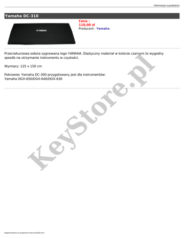 Informacje o produkcie Yamaha DC-310 Cena : 110,00 zł Producent : Yamaha Wymiary: 125 x 150 cm or e. pl Przeciwkurzowa osłona sygnowana logo YAMAHA. Elastyczny materiał w kolorze czarnym to wygodny sposób na utrzymanie instrumentu w czystości. K ey St Pokrowiec Yamaha DC-300 przygotowany jest dla instrumentów: Yamaha DGX-650/DGX-640/DGX-630 Wygenerowano w programie www.oscGold.com