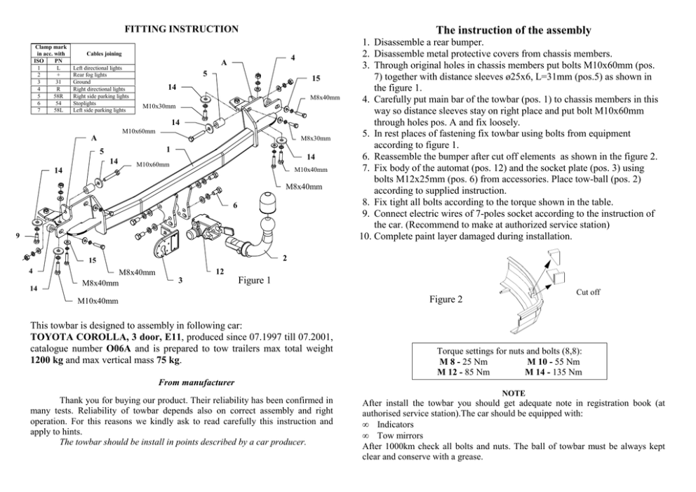 FITTING INSTRUCTION Clamp mark in acc. with ISO PN 1 L 2 + 3 31 4 R 5 58R 6 54 7 58L The instruction of the assembly Cables joining Left directional lights Rear fog lights Ground Right directional lights Right side parking lights Stoplights Left side parking lights 4 A 5 15 14 M8x40mm M10x30mm 14 M10x60mm A M8x30mm 1 5 14 14 14 M10x60mm M10x40mm M8x40mm 6 9 2 15 4 14 12 M8x40mm M8x40mm 1. Disassemble a rear bumper. 2. Disassemble metal protective covers from chassis members. 3. Through original holes in chassis members put bolts M10x60mm (pos. 7) together with distance sleeves ø25x6, L=31mm (pos.5) as shown in the figure 1. 4. Carefully put main bar of the towbar (pos. 1) to chassis members in this way so distance sleeves stay on right place and put bolt M10x60mm through holes pos. A and fix loosely. 5. In rest places of fastening fix towbar using bolts from equipment according to figure 1. 6. Reassemble the bumper after cut off elements as shown in the figure 2. 7. Fix body of the automat (pos. 12) and the socket plate (pos. 3) using bolts M12x25mm (pos. 6) from accessories. Place tow-ball (pos. 2) according to supplied instruction. 8. Fix tight all bolts according to the torque shown in the table. 9. Connect electric wires of 7-poles socket according to the instruction of the car. (Recommend to make at authorized service station) 10. Complete paint layer damaged during installation. 3 Figure 1 Cut off Figure 2 M10x40mm This towbar is designed to assembly in following car: TOYOTA COROLLA, 3 door, E11, produced since 07.1997 till 07.2001, catalogue number O06A and is prepared to tow trailers max total weight 1200 kg and max vertical mass 75 kg. Torque settings for nuts and bolts (8,8): M 8 - 25 Nm M 10 - 55 Nm M 12 - 85 Nm M 14 - 135 Nm From manufacturer Thank you for buying our product. Their reliability has been confirmed in many tests. Reliability of towbar depends also on correct assembly and right operation. For this reasons we kindly ask to read carefully this instruction and apply to hints. The towbar should be install in points described by a car producer. NOTE After install the towbar you should get adequate note in registration book (at authorised service station).The car should be equipped with: • Indicators • Tow mirrors After 1000km check all bolts and nuts. The ball of towbar must be always kept clear and conserve with a grease. PPUH AUTO-HAK S.J. Towbar equipment: Produkcja Zaczepów Kulowych Henryk & Zbigniew Nejman 76-200 SŁUPSK ul. Słoneczna 16K tel/fax (059) 8-414-414; 8-414-413 email: [email protected] www. autohak.com.pl Towing hitch (without electrical set) Class: A50-X Cat. no. O06A Technical data: D-value: 7,1 kN maximum trailer weight: 1200 kg maximum vertical cup mass: 75 kg Designed for: Manufacturer: TOYOTA Model: COROLLA Type: 3 door produced since 07.1997 till 07.2001 Approval number according to Directive 94/20/EC: e20*94/20*0628*00 Foreword This towbar is designed according to rules of safety traffic regulations. The towing hitch is a safety component and can be install only by qualified personnel. Any alteration or conversion of the towing hitch is prohibited and would lead to cancellation of design certification. Remove insulating compound and underseal from vehicle (if present) in the area of the matting surfaces of the towing hitch. The vehicle manufacturer’s specifications regarding trailer load and max. vertical cup load are decisive for driving whereat values for the towing hitch cannot be exceeded. D-value formula: Max trailer weight [kg] x Max vehicle weight [kg] Max trailer weight [kg] + Max vehicle weight [kg] X 9,81 = 1000 D [kN] INSTRUKCJA montaŜu i eksploatacji zaczepu kulowego Oznaczenie zacisku wg ISO PN 1 L 2 + 3 31 4 R 5 58R 6 54 7 58L Łączenie przewodów Kierunkowskazy lewe Tylne światła przeciwmgłowe Masa Kierunkowskazy prawe Światła pozycyjne prawe Światła hamowania Światła pozycyjne lewe Kolejność czynności przy montaŜu 4 A 5 15 14 M8x40mm M10x30mm 14 M10x60mm A M8x30mm 1 5 14 14 14 M10x60mm M10x40mm M8x40mm 6 9 2 15 4 14 12 M8x40mm M8x40mm 1. Zdemontować zderzak. 2. Odkręcić metalowe osłony zabezpieczające podłuŜnice. 3. Poprzez fabryczne otwory w podłuŜnicach wsunąć śruby M10x60mm (poz. 7) wraz z tulejką dystansową ø25x6, L=31mm (poz.5) jak pokazano na rysunku 1. 4. Delikatnie wsunąć w podłuŜnicę hak, tak aby uprzednio włoŜone tulejki dystansowe pozostały na swoim miejscu a następnie przełoŜyć śrubę M10x60mm poprzez otwory zaczepu (poz. A) i skręcić (luźno). 5. Pozostałe miejsca mocowania zaczepu skręcić śrubami z wyposaŜenia, jak pokazano na rysunku. 6. Zamontować zderzak po uprzednim wycięciu niektórych jego fragmentów jak pokazano na rysunku 2. 7. Przykręcić korpus automatu (poz. 12) śrubami M12x25mm (poz. 6) wraz z blachą pod gniazdo (poz. 3). Zamocować kulę (poz. 2) zgodnie z instrukcją dołączaną do zaczepu z końcówką szybkodemontowalną. 8. Dokręcić wszystkie śruby zaczepu z momentem jak pokazano w tabeli. 9. Podłączyć przewody gniazda 7-bieg. do instalacji elektrycznej zgodnie z instrukcją fabryczną samochodu (zaleca się wykonanie w ASO). 10. Uzupełnić ewentualne ubytki powłoki malarskiej zaczepu powstałe w trakcie montaŜu. 3 Rysunek 1 Wyciąć M10x40mm Zaczep kulowy przeznaczony jest do zamontowania w samochodzie: TOYOTA COROLLA, 3 drz., E11, numer katalogowy O06A, produkowanego od 07.1997 do 07.2001r. i słuŜy do ciągnięcia przyczep o masie całkowitej do 1200 kg i nacisku na kulę max 75 kg. OD PRODUCENTA Dziękujemy za wybór produkowanego przez naszą firmę zaczepu kulowego. Jego niezawodność została potwierdzona licznymi testami oraz opiniami zadowolonych klientów. JednakŜe niezawodność zaczepów kulowych jest zaleŜna równieŜ od prawidłowego montaŜu oraz prawidłowej eksploatacji. Z tego powodu prosimy Państwa o staranne przeczytanie niniejszej instrukcji montaŜu oraz przestrzeganie zawartych wskazówek. Zaczep