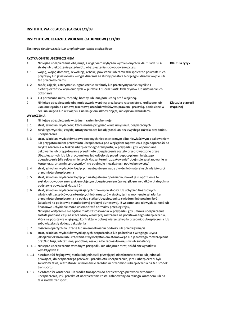 INSTITUTE WAR CLAUSES (CARGO) 1/1/09 INSTYTUTOWE KLAUZULE WOJENNE (ŁADUNKOWE) 1/1/09 Zastrzega się pierwszeństwo oryginalnego tekstu angielskiego RYZYKA OBJĘTE UBEZPIECZENIEM 1 Niniejsze ubezpieczenie obejmuje, z wyjątkiem wyłączeń wymienionych w klauzulach 3 i 4, Klauzula ryzyk stratę lub uszkodzenie przedmiotu ubezpieczenia spowodowane przez: 1. 1 wojnę, wojnę domową, rewolucję, rebelię, powstanie lub zamieszki społeczne powstałe z ich przyczyny lub jakiekolwiek wrogie działania ze strony państwa biorącego udział w wojnie lub też przeciwko niemu 1. 2 zabór, zajęcie, zatrzymanie, ograniczenie swobody lub przetrzymywanie, wynikłe z niebezpieczeństw wymienionych w punkcie 1.1. oraz skutki tych czynów lub usiłowanie ich dokonania 1. 3 1.3 porzucone miny, torpedy, bomby lub inną porzuconą broń wojenną. 2 Niniejsze ubezpieczenie obejmuje awarię wspólną oraz koszty ratownictwa, rozliczone lub Klauzula o awarii ustalone zgodnie z umową frachtową oraz/lub właściwym prawem i praktyką, poniesione w wspólnej celu uniknięcia lub w związku z uniknięciem szkody objętej niniejszymi klauzulami. WYŁĄCZENIA 3 Niniejsze ubezpieczenie w żadnym razie nie obejmuje: 3. 1 strat, szkód ani wydatków, które można przypisać winie umyślnej Ubezpieczonych 3. 2 zwykłego wycieku, zwykłej utraty na wadze lub objętości, ani też zwykłego zużycia przedmiotu ubezpieczenia 3. 3 strat, szkód ani wydatków spowodowanych niedostatecznym albo niewłaściwym opakowaniem lub przygotowaniem przedmiotu ubezpieczenia pod względem zapewnienia jego odporności na zwykłe zdarzenia w trakcie ubezpieczonego transportu, w przypadku gdy wspomniane pakowanie lub przygotowanie przedmiotu ubezpieczenia zostało przeprowadzone przez Ubezpieczonych lub ich pracowników lub odbyło się przed rozpoczęciem niniejszego ubezpieczenia (dla celów niniejszych klauzul termin „opakowanie” obejmuje zasztauowanie w kontenerze, a termin „pracownicy” nie obejmuje niezależnych podwykonawców) 3. 4 strat, szkód ani wydatków będących następstwem wady ukrytej lub naturalnych właściwości przedmiotu ubezpieczenia 3. 5 strat, szkód ani wydatków będących następstwem opóźnienia, nawet jeśli opóźnienie to zostało spowodowane ryzykiem objętym ubezpieczeniem (za wyjątkiem wydatków płatnych na podstawie powyższej klauzuli 2) 3. 6 strat, szkód ani wydatków wynikających z niewypłacalności lub uchybień finansowych właścicieli, zarządców, czarterujących lub armatorów statku, jeśli w momencie załadunku przedmiotu ubezpieczenia na pokład statku Ubezpieczeni są świadomi lub powinni być świadomi na podstawie standardowej praktyki biznesowej, iż wspomniana niewypłacalność lub finansowe uchybienie może uniemożliwić normalny przebieg rejsu, Niniejsze wyłączenie nie będzie miało zastosowania w przypadku gdy umowa ubezpieczenia została poddana cesji na rzecz osoby wnoszącej roszczenia na podstawie tego ubezpieczenia, która na podstawie wiążącego kontraktu w dobrej wierze zakupiła przedmiot ubezpieczenia lub zobowiązała się do jego zakupienia 3. 7 roszczeń opartych na utracie lub uniemożliwieniu podróży lub przedsięwzięcia 3. 8 strat, szkód ani wydatków wynikających bezpośrednio lub pośrednio z wrogiego użycia jakiejkolwiek broni lub urządzenia z wykorzystaniem atomowego lub jądrowego rozszczepienia oraz/lub fuzji, lub też innej podobnej reakcji albo radioaktywnej siły lub substancji. 4 4. 1 Niniejsze ubezpieczenie w żadnym przypadku nie obejmuje strat, szkód ani wydatków wynikających z: 4. 1.1 niezdatności żeglugowej statku lub jednostki pływającej, niezdatności statku lub jednostki pływającej do bezpiecznego przewozu przedmiotu ubezpieczenia, jeżeli Ubezpieczeni byli świadomi takiej niezdatności w momencie załadunku przedmiotu ubezpieczenia na ten środek transportu 4. 1.2 niezdatności kontenera lub środka transportu do bezpiecznego przewozu przedmiotu ubezpieczenia, jeśli przedmiot ubezpieczenia został załadowany do takiego kontenera lub na taki środek transportu • • 4. 2 przed rozpoczęciem niniejszego ubezpieczenia lub przez Ubezpieczonych lub ich pracowników, którzy byli świadomi takiej niezdatności w momencie załadunku. Wyłączenie 4.1.1. nie będzie miało zastosowania w przypadku gdy umowa ubezpieczenia została poddana cesji na rzecz osoby wnoszącej roszczenia na podstawie tego ubezpieczenia, a która zakupiła lub zobowiązała się do zakupienia przedmiotu ubezpieczenia w dobrej wierze, na podstawie wiążącego kontraktu. 4. 3 Ubezpieczyciele zrzekają się prawa do zarzutu naruszenia dorozumianych zastrzeżeń o zdatności żeglugowej statku oraz zdatności statku do przewozu przedmiotu ubezpieczenia do miejsca przeznaczenia. CZAS TRWANIA 5 5. 1 Niniejsze ubezpieczenie: Klauzula o przewozie 5. 1.1 rozpoczyna się dopiero z chwilą załadowania przedmiotu ubezpieczenia, a w odniesieniu do dowolnej jego części z chwilą załadowania takiej części, na statek morski, oraz 5. 1.2 kończy się, z zastrzeżeniem punktów 5.2 oraz 5.3, bądź to z chwilą wyładowania przedmiotu ubezpieczenia, a w odniesieniu do dowolnej jego części z chwilą wyładowania takiej części, ze statku morskiego w końcowym porcie lub miejscu wyładunku, lub z upływem 15 dni, licząc od północy dnia przybycia statku do końcowego portu lub miejsca wyładunku, w zależności od tego, która z tych okoliczności zdarzy się pierwsza; jednakże, pod warunkiem niezwłocznego powiadomienia Ubezpieczycieli oraz opłacenia dodatkowej składki wspomniane ubezpieczenie: 5. 1.3 zostanie wznowione, jeśli nie wyładowując przedmiotu ubezpieczenia w końcowym porcie lub miejscu wyładunku, statek odpłynie z takiego portu lub miejsca oraz 5. 1.4 ulegnie zakończeniu, z zastrzeżeniem punktów 5.2 oraz 5.3, bądź to z chwilą wyładowania przedmiotu ubezpieczenia, a w odniesieniu do dowolnej jego części z chwilą wy