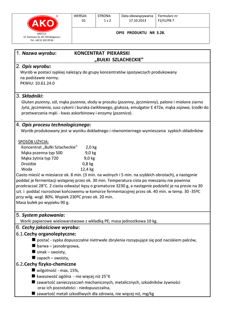 WERSJA: 01 Data obowiązywania 17.10.2013 Formularz nr F2/I1/PB 7 OPIS PRODUKTU NR 3.28. AKO S.A. Ul. Startowa 2a, 85-744 Bydgoszcz Tel. +48 52 342 09 66 1. Nazwa wyrobu: STRONA: 1z2 KONCENTRAT PIEKARSKI „BUŁKI SZLACHECKIE” 2. Opis wyrobu: Wyrób w postaci sypkiej należący do grupy koncentratów spożywczych produkowany na podstawie normy. PKWiU: 10.61.24.0 3. Składniki: Gluten pszenny, sól, mąka pszenna, słody w proszku (pszenny, jęczmienny), palone i mielone ziarno żyta, jęczmienia, susz cykorii i buraka ćwikłowego, glukoza, emulgator E 472e, mąka sojowa, środki do przetwarzania mąki - kwas askorbinowy i enzymy (pszenica). . 4. Opis procesu technologicznego: Wyrób produkowany jest w wyniku dokładnego i równomiernego wymieszania sypkich składników SPOSÓB UŻYCIA: Koncentrat „Bułki Szlacheckie” 2,0 kg Mąka pszenna typ 500 9,0 kg Mąka żytnia typ 720 9,0 kg Drożdże 0,8 kg Woda 12,4 kg Ciasto miesić w miesiarce ok. 8 min. (3 min. na wolnych i 5 min. na szybkich obrotach), a następnie poddać je fermentacji wstępnej przez ok. 30 min. Temperatura cista po mieszaniu nie powinna przekraczać 28°C. Z ciasta odważyć kęsy o gramaturze 3230 g, a następnie podzielić je na presie na 30 szt. i poddać rozrostowi końcowemu w komorze fermentacyjnej przez ok. 40 min. w temp. 30 -35ºC przy wilg. wzgl. 80%. Wypiek 230ºC przez ok. 20 min. Masa bułek po wypieku 90 g. 5. System pakowania: Worki papierowe wielowarstwowe z wkładką PE; masa jednostkowa 10 kg. 6. Cechy jakościowe wyrobu: 6.1.Cechy organoleptyczne: postać - sypka dopuszczalne nietrwałe zbrylenia rozsypujące się pod naciskiem palców, barwa – jasnobrązowa, smak – swoisty, zapach – swoisty, 6.2.Cechy fizyko-chemiczne wilgotność - max. 15%, kwasowość ogólna - nie więcej niż 25K zawartość zanieczyszczeń mechanicznych, metalicznych, szkodników żywności oraz ich pozostałości - niedopuszczalna, zawartość metali szkodliwych dla zdrowia, nie więcej niż, mg/kg WERSJA: 01 AKO S.A. Ul. Startowa 2a, 85-744 Bydgoszcz Tel. +48 52 342 09 66 - STRONA: 2z2 Data obowiązywania 17.10.2013 Formularz nr F2/I1/PB 7 OPIS PRODUKTU NR 3.28. kadm – 0,1 ołów – 0,3 7. Składniki alergenne: Gluten pszenny, mąka pszenna, słód pszenny, słód jęczmienny, ziarna żyta, ziarna jęczmienia, mąka sojowa, enzymy (pszenica). Koncentrat może zawierać śladowe ilości: nasion sezamu i łubinu, mleka w proszku, jaj w proszku. 8. Deklaracja GMO: Produkt nie zawiera organizmów modyfikowanych genetycznie. 9. Trwałość wyrobu i warunki jego przechowywania: Opakowany produkt przechowywać w suchym i chłodnym magazynie, na czystych drewnianych podestach w odległości min. 10 cm od ściany. Okres przechowywania do 6 m-cy od daty produkcji. 10. Dystrybucja wyrobu: Produkt jest dostarczany do odbiorcy w opakowaniu jednostkowym lub zbiorczym na ofoliowanych lub nieofoliowanych paletach transportem kołowym firmy zewnętrznej przeznaczonym do przewozu środków spożywczych. 11.Przeznaczenie wyrobu: Koncentrat służy do produkcji atrakcyjnego w smaku pieczywa mieszanego. Opracował Sprawdził Imię i nazwisko Beata Romel Dorota Palpuchowska Stanowisko Laborant Technolog Data 28.10.2013 28.10.2013 Zatwierdził K. Laure-Lewnadowska Gł. Technolog 28.10.2013 Podpis