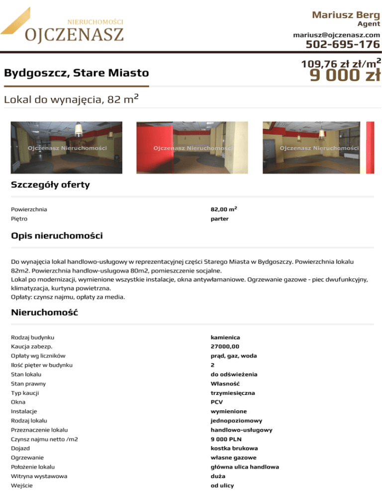 Mariusz Berg Agent [email protected] 502-695-176 109,76 zł zł/m2 9 000 zł Bydgoszcz, Stare Miasto Lokal do wynajęcia, 82 m2 Szczegóły oferty Powierzchnia 82,00 m2 Piętro parter Opis nieruchomości Do wynajęcia lokal handlowo-usługowy w reprezentacyjnej części Starego Miasta w Bydgoszczy. Powierzchnia lokalu 82m2. Powierzchnia handlow-uslugowa 80m2, pomieszczenie socjalne. Lokal po modernizacji, wymienione wszystkie instalacje, okna antywłamaniowe. Ogrzewanie gazowe - piec dwufunkcyjny, klimatyzacja, kurtyna powietrzna. Opłaty: czynsz najmu, opłaty za media. Nieruchomość Rodzaj budynku kamienica Kaucja zabezp. 27000,00 Opłaty wg liczników prąd, gaz, woda Ilość pięter w budynku 2 Stan lokalu do odświeżenia Stan prawny Własność Typ kaucji trzymiesięczna Okna PCV Instalacje wymienione Rodzaj lokalu jednopoziomowy Przeznaczenie lokalu handlowo-usługowy Czynsz najmu netto /m2 9 000 PLN Dojazd kostka brukowa Ogrzewanie własne gazowe Położenie lokalu główna ulica handlowa Witryna wystawowa duża Wejście od ulicy Podłogi kafle
