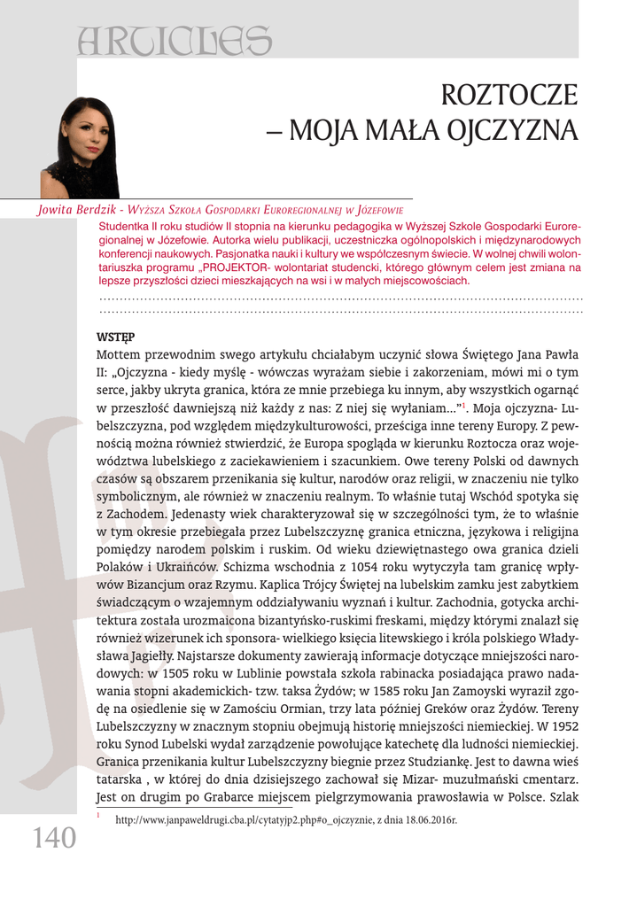 ARTICLES ROZTOCZE – MOJA MAŁA OJCZYZNA Jowita Berdzik - W yższa Szkoł a G ospodarki Euroregionalnej w Józefowie Studentka II roku studiów II stopnia na kierunku pedagogika w Wyższej Szkole Gospodarki Euroregionalnej w Józefowie. Autorka wielu publikacji, uczestniczka ogólnopolskich i międzynarodowych konferencji naukowych. Pasjonatka nauki i kultury we współczesnym świecie. W wolnej chwili wolontariuszka programu „PROJEKTOR- wolontariat studencki, którego głównym celem jest zmiana na lepsze przyszłości dzieci mieszkających na wsi i w małych miejscowościach. WSTĘP Mottem przewodnim swego artykułu chciałabym uczynić słowa Świętego Jana Pawła II: „Ojczyzna - kiedy myślę - wówczas wyrażam siebie i zakorzeniam, mówi mi o tym serce, jakby ukryta granica, która ze mnie przebiega ku innym, aby wszystkich ogarnąć w przeszłość dawniejszą niż każdy z nas: Z niej się wyłaniam...”1. Moja ojczyzna- Lubelszczyzna, pod względem międzykulturowości, prześciga inne tereny Europy. Z pewnością można również stwierdzić, że Europa spogląda w kierunku Roztocza oraz województwa lubelskiego z zaciekawieniem i szacunkiem. Owe tereny Polski od dawnych czasów są obszarem przenikania się kultur, narodów oraz religii, w znaczeniu nie tylko symbolicznym, ale również w znaczeniu realnym. To właśnie tutaj Wschód spotyka się z Zachodem. Jedenasty wiek charakteryzował się w szczególności tym, że to właśnie w tym okresie przebiegała przez Lubelszczyznę granica etniczna, językowa i religijna pomiędzy narodem polskim i ruskim. Od wieku dziewiętnastego owa granica dzieli Polaków i Ukraińców. Schizma wschodnia z 1054 roku wytyczyła tam granicę wpływów Bizancjum oraz Rzymu. Kaplica Trójcy Świętej na lubelskim zamku jest zabytkiem świadczącym o wzajemnym oddziaływaniu wyznań i kultur. Zachodnia, gotycka architektura została urozmaicona bizantyńsko-ruskimi freskami, między którymi znalazł się również wizerunek ich sponsora- wielkiego księcia litewskiego i króla polskiego Władysława Jagiełły. Najstarsze dokumenty zawierają informacje dotyczące mniejszości narodowych: w 1505 roku w Lublinie powstała szkoła rabinacka posiadająca prawo nadawania stopni akademickich- tzw. taksa Żydów; w 1585 roku Jan Zamoyski wyraził zgodę na osiedlenie się w Zamościu Ormian, trzy lata później Greków oraz Żydów. Tereny Lubelszczyzny w znacznym stopniu obejmują historię mniejszości niemieckiej. W 1952 roku Synod Lubelski wydał zarządzenie powołujące katechetę dla ludności niemieckiej. Granica przenikania kultur Lubelszczyzny biegnie przez Studziankę. Jest to dawna wieś tatarska , w której do dnia dzisiejszego zachował się Mizar- muzułmański cmentarz. Jest on drugim po Grabarce miejscem pielgrzymowania prawosławia w Polsce. Szlak 140 1 http://www.janpaweldrugi.cba.pl/cytatyjp2.php#o_ojczyznie, z dnia 18.06.2016r. ARTYKUŁY kulturowy prowadzi również przez Chełm- byłą siedzibę książąt ruskich z trzema biskupstwami, a mianowicie prawosławnym, rzymskokatolickim oraz grekokatolickim. Kolejnym punktem przez, który przebiega granica przenikania się kultur jest Włodawa. Niewielkie tereny zapełnione są zabytkami świadczącymi o mozaice wyznaniowej. Kolejno Biała Podlaska, na terenie której znajdują się kościoły łacińskie i greckokatolickie cerkwie. Dokumenty historyczne zawierają wzmianki o otwartości Zamościa na różnorodne kultury Wschodu i Zachodu. Zamość określany był wręcz „miastem otwartym”, które w szczególności przyciągało Hiszpanów, Anglików, Holendrów, Turków oraz Presów. Zabytki Zamościa są dzisiaj żywym dowodem na jego wielokulturowość i świadkiem ukształtowanego przez wieki zróżnicowania pod względem kulturowym. Szeroko pojęta kultura jest na Lubelszczyźnie trwale zakorzeniona, posiada własną specyfikę i indywidualną dynamikę rozwojową. Przywiązanie do tradycji oraz aktywność twórców ludowych przyczyniły się do większych szans przetrwania wartości kulturowych w swoim naturalnym środowisku. To idealny fundament do nauki wielokulturowości poprzez pryzmat regionalizmu2 EDUKACJA WIELOKULTUROWA I PEDAGOGIKA KULTURY U podstaw licznych koncepcji pedagogicznych leży pojęcie wielokulturowego wymiaru życia ludzi żyjących we współczesnym świecie. Mowa tu o dialogu, komunikacji, tolerancji i szacunku dla odmienności. Myślenie i działanie pedagogiczne mające związek z międzykulturowością bliskie jest pedagogice kultury. Fundamentalnym elementem owej pedagogiki jest kształcenie w duchu następujących wartości: dialog, godność, tolerancja oraz wspólnota. Za priorytetowe uważa się także nacisk na potrzebę przygotowania jednostki do krytycznej analizy wartości obecnej cywilizacji. Według pedagogiki kultury poznawanie dziedzictwa oraz rozumienie sensu i wartości różnorodnych kultur są podstawą nauki twórczego uczestnictwa w życiu społeczeństwa. Podstawową koncepcją, na której gównie opierają się teoretycy pedagogiki kultury jest humanistyczna koncepcja człowieka. W obecnych czasach jest ona inspiracją do konstrukcji modelu edukacji ukierunkowanego na rozwój samodzielnego myślenia i wsparcie postaw wybitnie twórczych. Znajdująca źródło w kartezjańskim modelu dyskursu racjonalna debata jako fundament edukacji wielokulturowej i międzykulturowego dialogu przyjmuje, że kultury są przystawalne i mogą uzgadniać istniejące różnice wspólnym racjonalnym wysiłkiem. Należy jednak zauważyć, ze większa część konfliktów na tle kulturowym jest zaprzeczeniem racjonalności i odbywa się w warunkach nieredukowalnej ambiwalencji. Po przekroczeniu owej granicy niezbędne jest wprowadzenie do międzykulturowego dialogu elementów pozaracjonalnych, które są nieodłączną częścią ekspresji twórczej. Prace Herberta Reada są swoistym skarbcem informacji na temat koncepcji wychowania przez sztu
