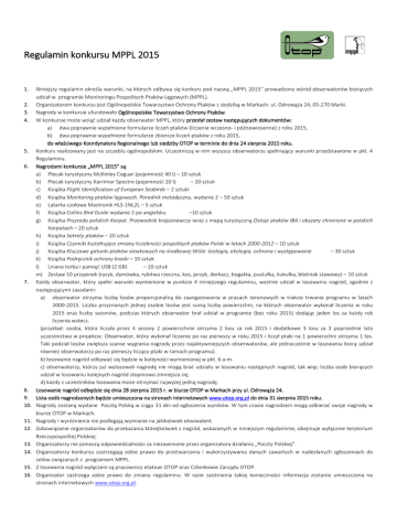 Regulamin konkursu MPPL 2015 1. 2. 3. 4. 5. 6. 7. 8. 9. 10. 11. 12. 13. 14. 15. 16. Niniejszy regulamin określa warunki, na których odbywa się konkurs pod nazwą „MPPL 2015” prowadzony wśród obserwatorów biorących udział w programie Monitoringu Pospolitych Ptaków Lęgowych (MPPL). Organizatorem konkursu jest Ogólnopolskie Towarzystwo Ochrony Ptaków z siedzibą w Markach: ul. Odrowąża 24, 05-270 Marki. Nagrody w konkursie ufundowało Ogólnopolskie Towarzystwo Ochrony Ptaków. W konkursie może wziąć udział każdy obserwator MPPL, który przesłał zestaw następujących dokumentów: a) dwa poprawnie wypełnione formularze liczeń ptaków (liczenie wczesno- i późnowiosenne) z roku 2015, b) dwa poprawnie wypełnione formularze zbiorcze liczeń ptaków z roku 2015, do właściwego Koordynatora Regionalnego lub siedziby OTOP w terminie do dnia 24 sierpnia 2015 roku. Konkurs realizowany jest na szczeblu ogólnopolskim. Uczestniczą w nim wszyscy obserwatorzy spełniający warunki przedstawione w pkt. 4 Regulaminu. Nagrodami konkursie „MPPL 2015” są: a) Plecak turystyczny McKinley Coguar (pojemność 40 l) – 10 sztuk b) Plecak turystyczny Karrimor Spectre (pojemność 20 l) – 20 sztuk c) Książka Flight Identification of European Seabirds – 2 sztuki d) Książka Monitoring ptaków lęgowych. Poradnik metodyczny, wydanie 2 – 50 sztuk e) Latarka czołowa Mactronik HLS-1NL2L – 5 sztuk f) Książka Collins Bird Guide wydanie 2 po angielsku –10 sztuk g) Książka Przyroda polskich Karpat. Przewodnik krajoznawczy wraz z mapą turystyczną Ostoje ptaków IBA i obszary chronione w polskich Karpatach – 20 sztuk h) Książka Sekrety ptaków – 20 sztuk i) Książka Czynniki kształtujące zmiany liczebności pospolitych ptaków Polski w latach 2000-2012 – 10 sztuk j) Książka Kluczowe gatunki ptaków siewkowych na środkowej Wiśle: biologia, ekologia, ochrona i występowanie – 30 sztuk k) Książka Podręcznik ochrony kraski – 10 sztuk l) Lniana torba i pamięć USB (2 GB) – 20 sztuk m) Zestaw 10 przypinek (rycyk, dymówka, rybitwa rzeczna, kos, jerzyk, derkacz, bogatka, pustułka, kukułka, błotniak stawowy) – 10 sztuk Każdy obserwator, który spełni warunki wymienione w punkcie 4 niniejszego regulaminu, weźmie udział w losowaniu nagród, zgodnie z następującymi zasadami: a) obserwator otrzyma liczbę losów proporcjonalną do zaangażowania w pracach terenowych w trakcie trwania programu w latach 2000-2015. Liczba przyznanych jednej osobie losów jest sumą liczby powierzchni, na których obserwator wykonał liczenia w roku 2015 oraz liczby sezonów, podczas których obserwator brał udział w programie (bez roku 2015) dodając jeden los za każdy rok liczenia wstecz. (przykład: osoba, która liczyła przez 4 sezony 2 powierzchnie otrzyma 2 losy za rok 2015 i dodatkowe 3 losy za 3 poprzednie lata uczestnictwa w projekcie. Obserwator, który wykonał liczenie po raz pierwszy w roku 2015 i liczył ptaki na 1 powierzchni otrzyma 1 los. Taki podział losów zwiększa szanse wygrania nagrody przez najaktywniejszych obserwatorów, ale jednocześnie w losowaniu biorą udział również obserwatorzy po raz pierwszy liczący ptaki w ramach programu). b) losowanie nagród odbywać się będzie w kolejności wymienionej w pkt. 6 a-m. c) obserwatorzy, którzy już wylosowali nagrodę nie mogą brać udziału w losowaniu następnych nagród, tak więc liczba osób biorących udział w losowaniu kolejnych nagród stopniowo zmniejsza się. d) każdy z uczestników losowania może otrzymać najwyżej jedną nagrodę. Losowanie nagród odbędzie się dnia 28 sierpnia 2015 r. w biurze OTOP w Markach przy ul. Odrowąża 24. Lista osób nagrodzonych będzie umieszczona na stronach internetowych www.otop.org.pl do dnia 31 sierpnia 2015 roku. Nagrody zostaną wysłane Pocztą Polską w ciągu 31 dni od ogłoszenia wyników. W tym czasie nagrodzeni mogą odbierać swoje nagrody w biurze OTOP w Markach. Nagrody i wyróżnienia nie podlegają wymianie na jakikolwiek ekwiwalent. Zobowiązanie organizatorów do przekazania którejkolwiek z nagród, wskazanych w niniejszym regulaminie, obejmuje wyłącznie terytorium Rzeczypospolitej Polskiej. Organizatorzy nie ponoszą odpowiedzialności za niezawinione przez organizatora działania „Poczty Polskiej”. Organizatorzy konkursu zastrzegają sobie prawo do przetwarzania i wykorzystywania danych zawartych w nadesłanych zgłoszeniach do celów związanych z programem MPPL. Z losowania nagród wyłączeni są pracownicy etatowi OTOP oraz Członkowie Zarządu OTOP. Organizator zastrzega sobie prawo do zmiany regulaminu. W razie zaistnienia takiej konieczności informacja zostanie umieszczona na stronach internetowych www.otop.org.pl.