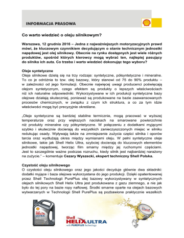 Co warto wiedzieć o oleju silnikowym? Warszawa, 12 grudnia 2016 – Jedna z najważniejszych motoryzacyjnych prawd mówi, że kluczowym czynnikiem decydującym o stanie technicznym jednostki napędowej jest olej silnikowy. Obecnie na rynku dostępnych jest wiele różnych produktów, spośród których kierowcy mogą wybrać ten, najlepiej pasujący do silnika ich auta. Co trzeba i warto wiedzieć dokonując tego wyboru? Oleje syntetyczne Oleje silnikowe dzielą się na trzy rodzaje: syntetyczne, półsyntetyczne i mineralne. To co je odróżnia to tzw. olej bazowy, który stanowi od 75 do 90% produktu – w zależności od jego formulacji. Obecnie najwięcej uwagi producenci poświęcają olejom syntetycznym, czego efektem są produkty o lepszych właściwościach niż ich naturalne odpowiedniki. Wykorzystywane w ich produkcji syntetyczne bazy olejowe działają skuteczniej, ponieważ są produkowane na bazie zaawansowanych procesów chemicznych, w związku z czym ich struktura, a co za tym idzie właściwości mogą być precyzyjnie określane. „Oleje syntetyczne są bardziej stabilne termicznie, mogą pracować w wyższej temperaturze oraz przy większych naciskach na smarowane powierzchnie niż produkty mineralne czy półsyntetyczne. W połączeniu z dodatkami myjącymi szybko i skutecznie docierają do wszystkich zanieczyszczonych miejsc w silniku redukując osady. Wpływają także na zmniejszenie zużycia części silnika i oporów tarcia oraz wydłużają okres między wymianami oleju. W pełni syntetyczne oleje silnikowe, takie jak Shell Helix Ultra, szybciej docierają do kluczowych elementów jednostki napędowej, tworząc film smarny między jej ruchomymi częściami. Jest to szczególnie ważne podczas rozruchu, kiedy silnik jest najbardziej narażony na zużycie.” – komentuje Cezary Wyszecki, ekspert techniczny Shell Polska. Czystość oleju silnikowego O czystości oleju silnikowego oraz jego jakości decyduje głównie dwa składniki: dodatki myjące i baza olejowa wykorzystana do jego produkcji. Dzięki opatentowanej przez Shell Technologii PurePlus olej bazowy wykorzystywany w syntetycznych olejach silnikowych Shell Helix Ultra jest produkowana z gazu ziemnego, a nie jak było do tej pory na bazie ropy naftowej. Środki smarne oparte na olejach bazowych wytwarzanych w Technologii Shell PurePlus są pozbawione praktycznie wszelkich zanieczyszczeń znajdujących się w ropie naftowej. Oleje Shell Helix Ultra zapewniają optymalną czystość silnika w stopniu zbliżonym do fabrycznej1, a także wysoką stabilność lepkości w wysokich temperaturach pracy, co pozwala utrzymać najwyższe parametry eksploatacyjne silnika. Niezwykła moc dodatków Choć kluczowe znaczenie w produkcji oleju ma zastosowanie najwyższej jakości bazy olejowej, dopiero w połączeniu z odpowiednimi dodatkami uszlachetniającymi tworzy ona produkt o pożądanych właściwościach. Szczególne znaczenie dla silnika mają: detergenty, antyoksydanty, środki dyspersyjne, modyfikatory tarcia i dodatki przeciwkorozyjne. Detergenty dbają o czystość silnika oraz neutralizują zagrażające mu kwasy. Antyoksydanty pomagają dłużej zachować odpowiednie właściwości oleju, zaś środki dyspersyjne usuwają szkodliwą sadzę i szlamy. Modyfikatory tarcia ułatwiają pracę ruchomych części, co z kolei ma bezpośredni wpływ na ograniczenie zużycia paliwa. Natomiast dodatki przeciwkorozyjne zabezpieczają silnik przed korozją. Lepkość oleju Niezwykle istotnym parametrem jest lepkość, która określa łatwość z jaką olej przepływa przy określonej temperaturze. Jeśli temperatura rośnie naturalnie lepkość oleju zmniejsza się i olej staje się rzadki, im jest zimniej, tym olej zaczyna bardziej gęstnieć. Wyróżnia się 6 klas olejów letnich i tyle samo zimowych, choć obecnie najpopularniejsze stają się wielosezonowe środki smarne. Produkty tego typu opisywane są przez dwie wartości podzielone myślnikiem, np.: 5W-40. Pierwsza cyfra pozwala określi w jakim zakresie niskich temperatur może pracować olej im niższa jest wartość, tym niższa jest temperatura pracy środka smarnego. Druga cyfra określa parametry dla temperatur maksymalnych. Przykładem środka smarnego, który rzucił wyzwanie konkurencji w tym parametrze jest Shell Helix Ultra ECT C2/C3 0W-30. Olej zachowuje płynność w temperaturach sięgających nawet -51ºC. Niska temperatura płynięcia oraz ograniczenie do minimum czasu dotarcia oleju do najdalszych elementów jednostki napędowej, ułatwia uruchomienie silnika nawet w bardzo niskich temperaturach. Właściwy dobór oraz wysoka jakość oleju silnikowego mają kluczowy wpływ na stan techniczny silnika każdego samochodu. Dlatego tak istotne jest, abyśmy 1 Na podstawie testu tworzenia się szlamu Sequence VG przeprowadzonego na oleju SAE 0W-40. posiadali podstawową wiedzę na temat produktów olejowych, by sięgać po te, które pomagają dbać o kondycję silników w naszych samochodach. O Shell Shell jest wiodącym globalnym dostawcą środków smarnych dla samochodów osobowych, ciężarowych, motocykli i maszyn przemysłowych. Najnowocześniejsze rozwiązania technologiczne powstają w trzech głównych centrach badawczorozwojowych w Hamburgu, Szanghaju i Houston. Shell produkuje oleje w 50 blendowniach, a smary w 17 zakładach produkcyjnych na świecie, na bazie oleju powstałego z gazu naturalnego, w największej instalacji petrochemicznej zlokalizowanej w Katarze. Niezmiennie od 10 lat Shell zajmuje pierwsze miejsce wśród dostawców środków smarnych na świecie (źródło: Kline&Company). Dodatkowe informacje: Justyna Goraj, [email protected], tel. 606-670-064 Natalia Szymczak, [email protected], tel. 530-442-233