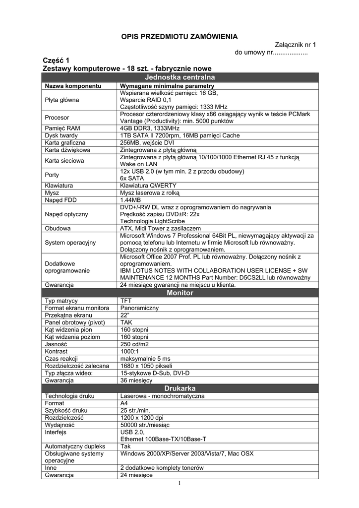OPIS PRZEDMIOTU ZAMÓWIENIA Załącznik nr 1 do umowy nr................... Część 1 Zestawy komputerowe - 18 szt. - fabrycznie nowe Jednostka centralna Nazwa komponentu Gwarancja Wymagane minimalne parametry Wspierana wielkość pamięci: 16 GB, Wsparcie RAID 0,1 Częstotliwość szyny pamięci: 1333 MHz Procesor czterordzeniowy klasy x86 osiągający wynik w teście PCMark Vantage (Productivity): min. 5000 punktów 4GB DDR3, 1333MHz 1TB SATA II 7200rpm, 16MB pamięci Cache 256MB, wejście DVI Zintegrowana z płytą główną Zintegrowana z płytą główną 10/100/1000 Ethernet RJ 45 z funkcją Wake on LAN 12x USB 2.0 (w tym min. 2 z przodu obudowy) 6x SATA Klawiatura QWERTY Mysz laserowa z rolką 1.44MB DVD+/-RW DL wraz z oprogramowaniem do nagrywania Prędkość zapisu DVD±R: 22x Technologia LightScribe ATX, Midi Tower z zasilaczem Microsoft Windows 7 Professional 64Bit PL, niewymagający aktywacji za pomocą telefonu lub Internetu w firmie Microsoft lub równoważny. Dołączony nośnik z oprogramowaniem. Microsoft Office 2007 Prof. PL lub równoważny. Dołączony nośnik z oprogramowaniem. IBM LOTUS NOTES WITH COLLABORATION USER LICENSE + SW MAINTENANCE 12 MONTHS Part Number: D5CS2LL lub równoważny 24 miesiące gwarancji na miejscu u klienta. Typ matrycy Format ekranu monitora Przekątna ekranu Panel obrotowy (pivot) Kąt widzenia pion Kąt widzenia poziom Jasność Kontrast Czas reakcji Rozdzielczość zalecana Typ złącza wideo: Gwarancja TFT Panoramiczny 22” TAK 160 stopni 160 stopni 250 cd/m2 1000:1 maksymalnie 5 ms 1680 x 1050 pikseli 15-stykowe D-Sub, DVI-D 36 miesięcy Technologia druku Format Szybkość druku Rozdzielczość Wydajność Interfejs Laserowa - monochromatyczna A4 25 str./min. 1200 x 1200 dpi 50000 str./miesiąc USB 2.0, Ethernet 100Base-TX/10Base-T Tak Windows 2000/XP/Server 2003/Vista/7, Mac OSX Płyta główna Procesor Pamięć RAM Dysk twardy Karta graficzna Karta dźwiękowa Karta sieciowa Porty Klawiatura Mysz Napęd FDD Napęd optyczny Obudowa System operacyjny Dodatkowe oprogramowanie Monitor Drukarka Automatyczny dupleks Obsługiwane systemy operacyjne Inne Gwarancja 2 dodatkowe komplety tonerów 24 miesięce 1 Część 2 Zestawy komputerowe - 2 szt. - fabrycznie nowe Jednostka centralna Nazwa komponentu Wymagane minimalne parametry Płyta główna Procesor Pamięć RAM Dysk twardy Karta graficzna Karta dźwiękowa Karta sieciowa Porty Klawiatura Mysz Napęd FDD Napęd optyczny Obudowa Inne Głośniki System operacyjny Dodatkowe oprogramowanie Gwarancja Wspierana wielkość pamięci: 16 GB, Wsparcie RAID 0,1 Częstotliwość szyny pamięci: 1600 MHz Procesor czterordzeniowy klasy x86 osiągający wynik w teście PCMark Vantage (Productivity): min. 5000 punktów 8GB DDR3, 1600MHz 1x SSD 60GB (szybkość odczytu: 220 MB/s, szybkość zapisu: 135 MB/s) 2x 1TB SATA II 7200rpm, 16MB pamięci Cache, RAID1 Wielkość zainstalowanej pamięci: 512 MB Złącze zewnętrzne: 2 x DVI-I, HDMI Obsługiwane standardy: DirectX 10 Zintegrowana z płytą główną 2x 10/100/1000 Mbit/s - zintegrowana z płytą główną 6x SATA 1x eSATA II 14x USB 2.0 (w tym min. 2 z przodu obudowy) Klawiatura QWERTY Mysz laserowa z rolką 1.44MB DVD+/-RW DL wraz z oprogramowaniem do nagrywania Prędkość zapisu DVD±R: 22x Technologia LightScribe ATX, Midi Tower z zasilaczem 500W Zewnętrzny dysk twardy: Interfejs USB2.0/eSATA/FireWire, 1 TB, 7200 obr./min., cache 16 MB 2+1, wyjście słuchawkowe Microsoft Windows 7 Professional 64Bit PL, niewymagający aktywacji za pomocą telefonu lub Internetu w firmie Microsoft lub równoważny. Dołączony nośnik z oprogramowaniem. Microsoft Office 2007 Prof. PL lub równoważny. Dołączony nośnik z oprogramowaniem. 24 miesiące gwarancji na miejscu u klienta. Monitor Typ matrycy Przekątna Nominalna rozdzielczość Kąt widzenia pion Kąt widzenia poziom Jasność Kontrast Czas reakcji Typ złącza wideo: Gwarancja S-PVA lub PVA lub MVA 24 cale 1920 x 1200 168 stopni 168 stopni 400 cd/m2 1000:1 maksymalnie 6 ms 1x DVI-D, 1x HDMI 36 miesięcy 2 Część 3 Drukarki - 2 szt. - fabrycznie nowe Drukarka wielofunkcyjna Nazwa Technologia druku Druk w kolorze Format Szybkość druku (mono) Rozdzielczość Interfejs Automatyczny dupleks Liczba podajników papieru Podajnik wielofunkcyjny Standardowe wymiary nośników Wydajność Dysk twardy Zainstalowana pamięć Skanowanie Dodatkowe opcje Obsługiwane systemy operacyjne Dołączone oprogramowanie Gwarancja Wymagane minimalne parametry techniczne Laserowa Tak A3 A4: tryb czarno-biały 35 str./min, tryb kolorowy 30 str./min; A3: tryb czarno-biały 15 str./min, tryb kolorowy 15 str./min Skanowanie 600dpi x 600dpi Kopiowanie 600dpi x 600dpi Drukowanie 1200dpi x 1200dpi USB 2.0, Ethernet 100Base-TX/10Base-T Tak 2 Tak A3, A4, A5, B5 Komplet tonerów czarnych wystarczający na wydrukowanie 200 tys stron przy 5% pokryciu Komplet tonerów wystarczający na wydrukowanie w kolorze 50 tys stron przy 5% pokryciu 40GB 1GB wysyłanie za pomocą SMTP, FTP, skanowanie do PDF Sorter z zszywaczem, umożliwiający zszywanie do 50 akruszy Dziurkacz Sterowanie za pomocą panelu dotykowego Windows 2000/XP/Server 2003/Vista/7, Mac OSX Tak 24 miesięce – naprawa u klienta Część 4 Projektor multimedialny - 4 szt. - fabrycznie nowe Projektor multimedialny Nazwa komponentu Rozdzielczość rzeczywista Kontrast (tryb normalny) Jasność (tryb normalny) Złącza (wejścia) Inne Gwarancja Wymagane minimalne parametry 1280 x 800 pikseli 2000:1 3000 ANSI Lum. 1 x D-sub 15-pin 1 x DVI-D 1 x HDMI 1 x USB Pilot zdalnego sterowania, torba, wskaźnik laserowy, komplet elementów do montażu sufitowego, dodatkowy przewód VGA przeznaczony do łączenia komputera z projektorem o długości 15m. 24 miesiące 3 Część 5 Laptop ze stacją dokującą - 15 szt. - fabrycznie nowe Laptop Nazwa komponentu Procesor Pamięć RAM Dyski Ekran Waga Napęd optyczny Czas pracy na bateriach Komunikacja Interfejsy Wymagany minimalny parametr 