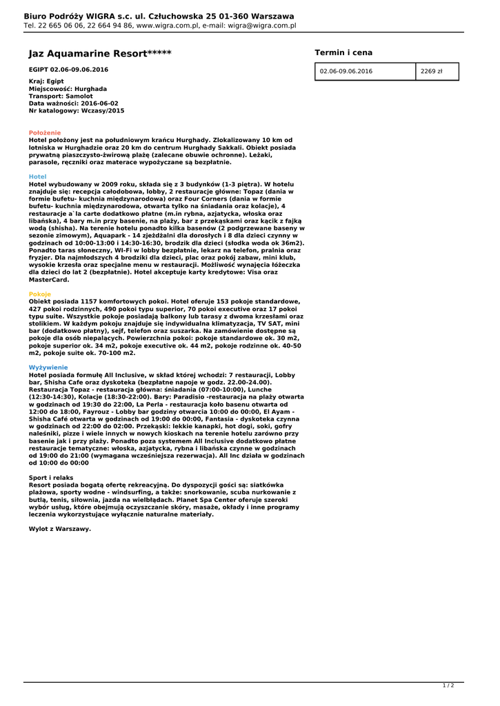 Biuro Podróży WIGRA s.c. ul. Człuchowska 25 01-360 Warszawa Tel. 22 665 06 06, 22 664 94 86, www.wigra.com.pl, e-mail: [email protected] Jaz Aquamarine Resort***** EGIPT 02.06-09.06.2016 Termin i cena 02.06-09.06.2016 2269 zł Kraj: Egipt Miejscowość: Hurghada Transport: Samolot Data ważności: 2016-06-02 Nr katalogowy: Wczasy/2015 Położenie Hotel położony jest na południowym krańcu Hurghady. Zlokalizowany 10 km od lotniska w Hurghadzie oraz 20 km do centrum Hurghady Sakkali. Obiekt posiada prywatną piaszczysto-żwirową plażę (zalecane obuwie ochronne). Leżaki, parasole, ręczniki oraz materace wypożyczane są bezpłatnie. Hotel Hotel wybudowany w 2009 roku, składa się z 3 budynków (1-3 piętra). W hotelu znajduje się: recepcja całodobowa, lobby, 2 restauracje główne: Topaz (dania w formie bufetu- kuchnia międzynarodowa) oraz Four Corners (dania w formie bufetu- kuchnia międzynarodowa, otwarta tylko na śniadania oraz kolacje), 4 restauracje a`la carte dodatkowo płatne (m.in rybna, azjatycka, włoska oraz libańska), 4 bary m.in przy basenie, na plaży, bar z przekąskami oraz kącik z fajką wodą (shisha). Na terenie hotelu ponadto kilka basenów (2 podgrzewane baseny w sezonie zimowym), Aquapark - 14 zjeżdżalni dla dorosłych i 8 dla dzieci czynny w godzinach od 10:00-13:00 i 14:30-16:30, brodzik dla dzieci (słodka woda ok 36m2). Ponadto taras słoneczny, WI-Fi w lobby bezpłatnie, lekarz na telefon, pralnia oraz fryzjer. Dla najmłodszych 4 brodziki dla dzieci, plac oraz pokój zabaw, mini klub, wysokie krzesła oraz specjalne menu w restauracji. Możliwość wynajęcia łóżeczka dla dzieci do lat 2 (bezpłatnie). Hotel akceptuje karty kredytowe: Visa oraz MasterCard. Pokoje Obiekt posiada 1157 komfortowych pokoi. Hotel oferuje 153 pokoje standardowe, 427 pokoi rodzinnych, 490 pokoi typu superior, 70 pokoi executive oraz 17 pokoi typu suite. Wszystkie pokoje posiadają balkony lub tarasy z dwoma krzesłami oraz stolikiem. W każdym pokoju znajduje się indywidualna klimatyzacja, TV SAT, mini bar (dodatkowo płatny), sejf, telefon oraz suszarka. Na zamówienie dostępne są pokoje dla osób niepalących. Powierzchnia pokoi: pokoje standardowe ok. 30 m2, pokoje superior ok. 34 m2, pokoje executive ok. 44 m2, pokoje rodzinne ok. 40-50 m2, pokoje suite ok. 70-100 m2. Wyżywienie Hotel posiada formułę All Inclusive, w skład której wchodzi: 7 restauracji, Lobby bar, Shisha Cafe oraz dyskoteka (bezpłatne napoje w godz. 22.00-24.00). Restauracja Topaz - restauracja główna: śniadania (07:00-10:00), Lunche (12:30-14:30), Kolacje (18:30-22:00). Bary: Paradisio -restauracja na plaży otwarta w godzinach od 19:30 do 22:00, La Perla - restauracja koło basenu otwarta od 12:00 do 18:00, Fayrouz - Lobby bar godziny otwarcia 10:00 do 00:00, El Ayam Shisha Café otwarta w godzinach od 19:00 do 00:00, Fantasia - dyskoteka czynna w godzinach od 22:00 do 02:00. Przekąski: lekkie kanapki, hot dogi, soki, gofry naleśniki, pizze i wiele innych w nowych kioskach na terenie hotelu zarówno przy basenie jak i przy plaży. Ponadto poza systemem All Inclusive dodatkowo płatne restauracje tematyczne: włoska, azjatycka, rybna i libańska czynne w godzinach od 19:00 do 21:00 (wymagana wcześniejsza rezerwacja). All Inc działa w godzinach od 10:00 do 00:00 Sport i relaks Resort posiada bogatą ofertę rekreacyjną. Do dyspozycji gości są: siatkówka plażowa, sporty wodne - windsurfing, a także: snorkowanie, scuba nurkowanie z butlą, tenis, siłownia, jazda na wielbłądach. Planet Spa Center oferuje szeroki wybór usług, które obejmują oczyszczanie skóry, masaże, okłady i inne programy leczenia wykorzystujące wyłącznie naturalne materiały. Wylot z Warszawy. 1/2 Biuro Podróży WIGRA s.c. ul. Człuchowska 25 01-360 Warszawa Tel. 22 665 06 06, 22 664 94 86, www.wigra.com.pl, e-mail: [email protected] 2/2 Powered by TCPDF (www.tcpdf.org)
