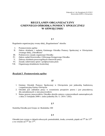 Załącznik nr 1 do Zarządzenia Nr 9/2015 Kierownika GOPS w Oświęcimiu REGULAMIN ORGANIZACYJNY GMINNEGO OŚRODKA POMOCY SPOŁECZNEJ W OŚWIĘCIMIU §1 Regulamin organizacyjny zwany dalej „Regulaminem” określa: I. II. III. IV. V. VI. VII. Postanowienia ogólne Zakres działania i zadania Gminnego Ośrodka Pomocy Społecznej w Oświęcimiu zwanego dalej „Ośrodkiem” Podstawowe zasady organizacji Ośrodka Zakres zadań Kierownika i Głównego Księgowego Ośrodka Zakresy działania poszczególnych stanowisk pracy Zasady załatwiania spraw i podpisywania pism Organizację działalności kontrolnej Rozdział I Postanowienia ogólne §2 1. Gminny Ośrodek Pomocy Społecznej w Oświęcimiu jest jednostką budżetową i organizacyjną Gminy Oświęcim 2. Ośrodek jest zakładem pracy w rozumieniu przepisów prawa i jest pracodawcą dla zatrudnionych w nim pracowników 3. Status prawny pracowników Ośrodka określa ustawa o pracownikach samorządowych z dnia 21 listopada 2008 r. (tekst jednolity Dz. U. 2014. 1202). §3 Siedzibą Ośrodka jest Grojec ul. Beskidzka 100 §4 Ośrodek jest czynny w dniach roboczych: poniedziałek, środa, czwartek, piątek od 700 do 1500 a we wtorek od 700 do 1700. Rozdział II Zakres działania i zadania Ośrodka §5 Przedmiotem działania Ośrodka jest wykonywanie w imieniu Gminy Oświęcim zadań ustawowych własnych i zleconych z zakresu: 1. pomocy społecznej 2. świadczeń rodzinnych oraz innych zadań powierzonych uchwałami Rady Gminy Oświęcim lub Zarządzeniami Wójta Gminy Oświęcim. Rozdział III Podstawowe zasady organizacji Ośrodka §6 1. Na czele Ośrodka stoi Kierownik, którego zatrudnia i zwalnia Wójt Gminy Oświęcim. 2. Kierownik jednoosobowo zarządza i kieruje Ośrodkiem na podstawie udzielonego pełnomocnictwa. 3. Kierownik reprezentuje Ośrodek na zewnątrz i jest przełożonym służbowym dla zatrudnionych w Ośrodku pracowników. Uprawnienia zwierzchnika służbowego w stosunku do Kierownika Ośrodka wykonuje Wójt Gminy Oświęcim. §7 Działalnością Ośrodka podczas nieobecności Kierownika kieruje Główny Księgowy Ośrodka lub wyznaczony prze Kierownika pracownik. Rozdział IV Zakres zadań Kierownika i Głównego Księgowego Ośrodka §8 Do podstawowych obowiązków i uprawnień Kierownika należy w szczególności: 1. Zarządzanie, nadzorowanie i kierowanie pracą Ośrodka i podległych pracowników. 2. Dokonywanie wszelkich czynności prawnych związanych z prowadzeniem jednostki w granicach zwykłego zarządu. 3. Reprezentowanie Ośrodka na zewnątrz. 4. Wydawanie decyzji w indywidualnych sprawach z zakresu administracji publicznej zgodnie z delegacjami ustawowymi oraz upoważnieniami Rady Gminy Oświęcim i Wójta Gminy Oświęcim. 5. Nadzór nad realizacją zadań z zakresu administracji publicznej zgodnie z delegacjami ustawowymi oraz upoważnieniami Rady Gminy Oświęcim i Wójta Gminy Oświęcim. 6. Wydawanie zarządzeń wewnętrznych i poleceń służbowych w sprawach dotyczących pracy i funkcjonowania Ośrodka. 7. Nadzorowanie realizacji budżetu oraz prowadzenia rachunkowości przy uwzględnieniu przepisów ustawy o rachunkowości z dnia 29 września 1994 r. (tekst jednolity: Dz. U. z 2013 r. poz. 330 z późn. zm.) oraz ustawy o finansach publicznych z dnia 27 sierpnia 2009 r. (tekst jednolity: Dz. U. z 2013 r. poz. 885 z późn. zm.) 8. Nadzór nad realizacją zamówień publicznych w podległej jednostce zgodnie z ustawą prawo zamówień publicznych z dnia 29 stycznia 2004 r. (tekst jednolity: Dz. U. z 2013 r. poz. 907 z późn. zm.). 9. Nadzór nad przestrzeganiem przepisów przeciwpożarowych zgodnie z ustawą z dnia 24 sierpnia 1991 r. o ochronie przeciwpożarowej (tekst jednolity: Dz. U. 2009 r. Nr 178 poz. 1380 z późn. zm.) oraz bezpieczeństwa i higieny pracy zgodnie z ustawą z dnia 26 czerwca 1974 r. Kodeks pracy (tekst jednolity: Dz. U. z 2014 r. poz. 1502 z późn. zm.). 10. Przygotowywanie projektów aktów prawnych wydawanych przez Radę Gminy Oświęcim oraz Wójta Gminy Oświęcim dotyczących funkcjonowania i realizacji zadań przez Ośrodek. 11. Składanie Radzie Gminy Oświęcim corocznych sprawozdań z działalności Ośrodka oraz przedstawienie potrzeb w zakresie pomocy społecznej. 12. Nadzór nad przestrzeganiem dyscypliny finansów publicznych w kierowanej jednostce. 13. Prowadzenie kontroli wewnętrznej Ośrodka. §9 Do obowiązków i uprawnień Głównego Księgowego należy: 1. 2. 3. 4. Kierowanie Ośrodkiem w przypadku nieobecności Kierownika. Zarządzanie i kierowanie pracą pracowników sekcji księgowości. Dokonywanie bieżącej oceny i analizy realizacji budżetu Ośrodka. Opracowywanie projektów budżetu i układu wykonawczego budżetu Ośrodka oraz harmonogramów dochodów i wydatków budżetowych. 5. Prowadzenie rachunkowości jednostki zgodnie z obowiązującymi przepisami. 6. Wykonywanie dyspozycji środkami pieniężnymi. 7. Dokonywanie wstępnej kontroli zgodności operacji gospodarczych i finansowych z planem finansowym oraz blokowanie planowanych wydatków w przypadku stwierdzenia niegospodarności, opóźnień w realizacji zadań i niezgodności z planem finansowym. 8. Dokonywania wstępnej kontroli kompletności i rzetelności dokumentów dotyczących operacji gospodarczych i finansowych. 9. Opracowywanie projektów planów i sprawozdań z wykonania budżetu. 10. Nadzór nad przestrzeganiem dyscypliny finansów publicznych. 11. Nadzorowanie właściwego i terminowego rozliczenia inwentaryzacji. 12. Opracowywanie projektów przepisów wewnętrznych Kierownika Ośrodka dotyczących spraw finansowych tj. inwentaryzacji, kontroli obiegu dokumentów księgowych, obrotu drukami ścisłego zarachowania, obsługi kasowej, zakładowego planu kont i innych. 13. Dokonywanie kontroli finansowej Ośrodka. 14. Nadzór nad prawidłowym prowadzeniem księgowości w sposób umożliwiający: • terminowe przekazywanie rzetelnych informacji ekonomicznych, • ochronę mienia