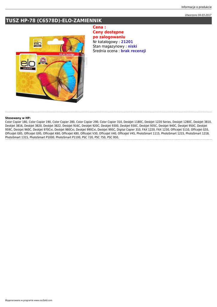 Informacje o produkcie Utworzono 04-03-2017 TUSZ HP-78 (C6578D)-ELO-ZAMIENNIK Cena : Ceny dostępne po zalogowaniu Nr katalogowy : 21201 Stan magazynowy : niski Średnia ocena : brak recenzji Stosowany w HP: Color Copier 180, Color Copier 190, Color Copier 280, Color Copier 290, Color Copier 310, DeskJet 1180C, DeskJet 1220 Series, DeskJet 1280C, DeskJet 3810, DeskJet 3816, DeskJet 3820, DeskJet 3822, DeskJet 916C, DeskJet 920C, DeskJet 9300, DeskJet 930C, DeskJet 935C, DeskJet 940C, DeskJet 950C, DeskJet 959C, DeskJet 960C, DeskJet 970Cxi, DeskJet 980Cxi, DeskJet 990Cxi, DeskJet 995C, Digital Copier 310, FAX 1220, FAX 1230, OfficeJet 5110, OfficeJet G55, OfficeJet G85, OfficeJet G95, OfficeJet K60, OfficeJet K80, OfficeJet V30, OfficeJet V40, OfficeJet V45, PhotoSmart 1115, PhotoSmart 1215, PhotoSmart 1218, PhotoSmart 1315, PhotoSmart P1000, PhotoSmart P1100, PSC 720, PSC 750, PSC 950, Wygenerowano w programie www.oscGold.com