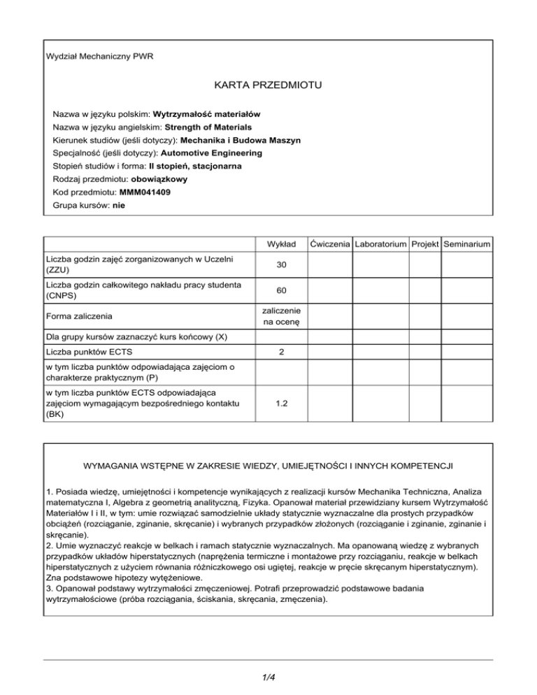 Wydział Mechaniczny PWR KARTA PRZEDMIOTU Nazwa w języku polskim: Wytrzymałość materiałów Nazwa w języku angielskim: Strength of Materials Kierunek studiów (jeśli dotyczy): Mechanika i Budowa Maszyn Specjalność (jeśli dotyczy): Automotive Engineering Stopień studiów i forma: II stopień, stacjonarna Rodzaj przedmiotu: obowiązkowy Kod przedmiotu: MMM041409 Grupa kursów: nie Wykład Liczba godzin zajęć zorganizowanych w Uczelni (ZZU) 30 Liczba godzin całkowitego nakładu pracy studenta (CNPS) 60 Forma zaliczenia Ćwiczenia Laboratorium Projekt Seminarium zaliczenie na ocenę Dla grupy kursów zaznaczyć kurs końcowy (X) Liczba punktów ECTS 2 w tym liczba punktów odpowiadająca zajęciom o charakterze praktycznym (P) w tym liczba punktów ECTS odpowiadająca zajęciom wymagającym bezpośredniego kontaktu (BK) 1.2 WYMAGANIA WSTĘPNE W ZAKRESIE WIEDZY, UMIEJĘTNOŚCI I INNYCH KOMPETENCJI 1. Posiada wiedzę, umiejętności i kompetencje wynikających z realizacji kursów Mechanika Techniczna, Analiza matematyczna I, Algebra z geometrią analityczną, Fizyka. Opanował materiał przewidziany kursem Wytrzymałość Materiałów I i II, w tym: umie rozwiązać samodzielnie układy statycznie wyznaczalne dla prostych przypadków obciążeń (rozciąganie, zginanie, skręcanie) i wybranych przypadków złożonych (rozciąganie i zginanie, zginanie i skręcanie). 2. Umie wyznaczyć reakcje w belkach i ramach statycznie wyznaczalnych. Ma opanowaną wiedzę z wybranych przypadków układów hiperstatycznych (naprężenia termiczne i montażowe przy rozciąganiu, reakcje w belkach hiperstatycznych z użyciem równania różniczkowego osi ugiętej, reakcje w pręcie skręcanym hiperstatycznym). Zna podstawowe hipotezy wytężeniowe. 3. Opanował podstawy wytrzymałości zmęczeniowej. Potrafi przeprowadzić podstawowe badania wytrzymałościowe (próba rozciągania, ściskania, skręcania, zmęczenia). 1/4 CELE PRZEDMIOTU C1. Nabycie wiedzy z zakresu wybranych zagadnień wytrzymałości materiałów przydatnych w ramach kształcenia Automotive Engineering. C2. Zdobycie wiedzy z zakresu przeprowadzenia obliczeń układów hiperstatycznych z wykorzystaniem metod energetycznych. C3. Zdobycie wiedzy w zakresie podstaw fizykalnych i przeprowadzenia badań eksperymentalnych stosowanych do wyznaczenia właściwości materiałów na konstrukcje samochodowe i lotnicze. PRZEDMIOTOWE EFEKTY KSZTAŁCENIA, osoby która zaliczyła kurs I. Z zakresu wiedzy: PEK_W01 - zna sposoby rozwiązywania układów hiperstatycznych z wykorzystaniem metod energetycznych, PEK_W02 - zna wybrane współczesne metody eksperymentalne wyznaczania właściwości wytrzymałościowych materiałów na konstrukcje pojazdów lądowych i lotniczych, PEK_W03 - posiada wiedzę z podstaw i zastosowań wybranych metod obliczeniowych i eksperymentalnych wytrzymałości materiałów. II. Z zakresu umiejętności: III. Z zakresu kompetencji społecznych: TREŚCI PROGRAMOWE Forma zajęć – wykład Liczba godzin Wy1 Układy hiperstatyczne w układach mechanicznych. Przypadki zewnętrznie i wewnętrznie hiperstatyczne. Twierdzenie Menabrea-Castigliano. 3 Wy2 Metoda Maxwella-Mohra, w tym sposób Wereszczagina w zastosowaniu do zagadnień hiperstatycznych. 3 Wy3 Metoda sił w zastosowaniu do zagadnień hiperstatycznych. 4 Wy4 Metody badania wysokociśnieniowych zbiorników kompozytowych na paliwa gazowe 2 Wy5 Podstawy metody monitorowania konstrukcji mechanicznych w procesie wytwarzania i eksploatacji z wykorzystaniem systemów światłowodowych. 2 Wy6 Wykorzystanie termowizji w badaniu elementów konstrukcji mechanicznych: metalicznych i kompozytowych (polimerowych). 2 Wy7 Aplikacja efektów krzyżowych w badaniach wytrzymałościowych 3 Wy8 Metody odzysku energii z pojazdów z użyciem materiałów, w których występują efekty krzyżowe (Energy Harvesting). 3 Wy9 Hipotezy energetyczne procesu zmęczenia. Metodyka wyznaczania energii odkształcenia w warunkach obciążeń cyklicznych. Kumulacja energii. 2 Wy10 Przemiana martenzytyczna na zimno w metalach z pamięcią kształtu. Możliwości aplikacji w badaniach wytrzymałości materiałów. 2 Wy11 Właściwości fizykalne materiałów do tłumienia semiaktywnego 2 2/4 Wy12 Metodyka badania materiałów kompozytowych (długowłóknistych) z wykorzystaniem specjalnych próbek (rurowych, pierścieniowych typu NOL) 2 Suma: 30 STOSOWANE NARZĘDZIA DYDAKTYCZNE N1. wykład tradycyjny z wykorzystaniem transparencji i slajdów N2. konsultacje N3. praca własna – samodzielne studia i przygotowanie do egzaminu OCENA OSIĄGNIĘCIA PRZEDMIOTOWYCH EFEKTÓW KSZTAŁCENIA (W) Oceny (F – formująca (w trakcie semestru), P – podsumowująca (na koniec semestru) F1 Numer efektu kształcenia PEK_W01 - PEK_W03, Sposób oceny osiągnięcia efektu kształcenia kolokwium P = F1 LITERATURA PODSTAWOWA I UZUPEŁNIAJĄCA LITERATURA PODSTAWOWA 1. Dyląg Z., Jakubowicz A., Orłoś A., Wytrzymałość materiałów. Tom I i II. WNT. Warszawa 1996. 2. Niezgodziński M.E., Niezgodziński T., Wytrzymałość materiałów. PWN. Warszawa 2009. 3. Timoshenko S., Strength of Materials,Part 1 and Part 2. D. van Nostrand Company (wyd. arch.). 4. Da Silva, V.D., Mechanics and Strength of Materials, Springer. 2005. LITERATURA UZUPEŁNIAJĄCA 1. Jastrzębski P., Mutermilch J., Orłowski W., Wytrzymałość materiałów, t. 1 i 2, Arkady 1986. 2. Surya Patnaik & Dale Hopkins, “Strength Of Materials”, Elsevier. Amsterdam 2012. 3/4 MACIERZ POWIĄZANIA EFEKTÓW KSZTAŁCENIA DLA PRZEDMIOTU Wytrzymałość materiałów Z EFEKTAMI KSZTAŁCENIA NA KIERUNKU Mechanika i Budowa Maszyn Odniesienie przedmiotowego efektu do efektów Przedmiotowy kształcenia zdefiniowanych dla kierunku studiów i efekt kształcenia specjalności Numer Cele Treści narzędzia przedmiotu programowe dydaktycznego PEK_W01, PEK_W02, PEK_W03 C1,C2,C3 K2MBM_AE_W08 OPIEKUN PRZEDMIOTU dr hab. inż., prof. PWr Jerzy Kaleta tel.: 27-66 email: [email pro