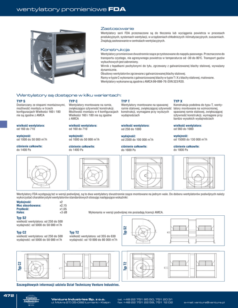 wentylatory promieniowe FDA Zastosowanie Wentylatory serii FDA przeznaczone s¹ do t³oczenia lub wyci¹gania powietrza w procesach produkcyjnych, systemach wentylacji, w urz¹dzeniach ch³odniczych i klimatyzacyjnych, suszarniach. Znajduj¹ zastosowanie w centralach wentylacyjnych. Konstrukcja Wentylatory promieniowe dwustronnie ss¹ce przystosowane do napêdu pasowego. Przeznaczone do transportu czystego, nie agresywnego powietrza w temperaturze od -30 do 80oC. Transport gazów wybuchowych jest zabroniony. Wirnik z ³opatkami pochylonymi do ty³u, zgrzewany z galwanizowanej blachy stalowej, wywa¿any dynamicznie. Obudowy wentylatorów zgrzewane z galwanizowanej blachy stalowej. Ramy w typie C wykonanie z galwanizowanej blachy w typie T i X z blachy stalowej, malowane. Wentylatory wykonane s¹ zgodnie z AMCA 99-098-76 i DIN 323 R20. TYP S TYP C TYP T TYP X Dostarczany ze stopami monta¿owymi, mo¿liwoœæ monta¿u w trzech konfiguracjach Wielkoœci 160 i 180 nie s¹ zgodne z AMCA Wentylatory montowane na ramie, zwiêkszaj¹ce sztywnoœæ konstrukcji. Mo¿liwoœæ monta¿u w 4 konfiguracjach Wielkoœci 160 i 180 nie s¹ zgodne z AMCA Wentylatory montowane na spawanej ramie stalowej, zwiêkszaj¹cej sztywnoœæ konstrukcji, wymagane przy wy¿szych wydajnoœciach Konstrukcja podobna do typu T, wentylatory montowane na wzmocnionej, spawanej ramie stalowej, zwiêkszaj¹cej sztywnoœæ konstrukcji, wymagane przy bardzo wysokich wydajnoœciach wielkoœæ wentylatora: od 160 do 710 wielkoœæ wentylatora: od 160 do 710 wielkoœæ wentylatora: od 250 do 1000 wielkoœæ wentylatora: od 560 do 1000 wydajnoœæ: od 1000 do 50 000 m3/h wydajnoœæ: od 1000 do 50 000 m3/h wydajnoœæ: od 2500 do 100 000 m3/h wydajnoœæ: od 15000 do 130 000 m3/h ciœnienie ca³kowite: do 1400 Pa ciœnienie ca³kowite: do 1400 Pa ciœnienie ca³kowite: do 1600 Pa ciœnienie ca³kowite: do 1800 Pa Wentylatory FDA wystêpuj¹ te¿ w wersji podwójnej, s¹ to dwa wentylatory dwustronnie ss¹ce montowane na jednym wale. Do doboru wentylatorów podwójnych nale¿y wykorzystaæ charakterystyki wentylatorów standardowych stosuj¹c nastêpuj¹ce wskaŸniki: Wydajnoœæ: Moc absorbowana: Prêdkoœæ: Ha³as: x2 x2,15 x1,05 +3 dB Wykonania w wersji podwójnej nie posiadaj¹ licencji AMCA. Typ S2 Typ T2 wielkoœæ wentylatora: od 250 do 500 wydajnoœæ: od 5000 do 50 000 m3/h wielkoœæ wentylatora: od 355 do 630 wydajnoœæ: od 10 000 do 80 000 m3/h Typ T2 Typ C2 Typ C2 Typ S2 wielkoœæ wentylatora: od 250 do 500 wydajnoœæ: od 5000 do 50 000 m3/h Szczegó³owych informacji udziela Dzia³ Techniczny Venture Industries. 472 Venture Industries Sp. z o.o. ul. Mokra 27, 05-092 £omianki - Kie³pin tel. +48 22 751 95 50, 751 20 31 fax +48 22 751 22 59, 751 12 02 e-mail: [email protected]