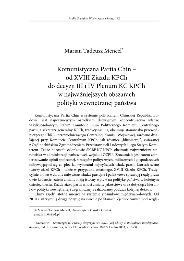 Studia Gdańskie. Wizje i rzeczywistość, t. XI Marian Tadeusz Mencel∗ Komunistyczna Partia Chin – od XVIII Zjazdu KPCh do decyzji III i IV Plenum KC KPCh w najważniejszych obszarach polityki wewnętrznej państwa Komunistyczna Partia Chin w systemie politycznym Chińskiej Republiki Ludowej jest najważniejszym ośrodkiem decyzyjnym koncentrującym władzę w kilkuosobowym Stałym Komitecie Biura Politycznego Komitetu Centralnego partii, a sekretarz generalny KPCh, tradycyjnie już, obejmuje stanowisko przewodniczącego ChRL i przewodniczącego Centralnej Komisji Wojskowej, zarówno działającej przy Komitecie Centralnym KPCh, jak również „bliźniaczej”, związanej z Ogólnochińskim Zgromadzeniem Przedstawicieli Ludowych i jego Stałym Komitetem. Także pozostali członkowie SK BP KC KPCh obejmują najważniejsze stanowiska w administracji państwowej, wojsku i OZPL1. Zrozumiałe jest zatem zainteresowanie opinii społecznej, strategów politycznych, militarnych i gospodarczych odbywającymi się co pięć lat wyborami najwyższych władz partii, których scenę tworzy zjazd KPCh – także w przypadku ostatniego, XVIII Zjazdu KPCh. Tradycyjnie, nowo wybrane najwyższe władze partyjne i państwowe sprawują rządy przez dwie kadencje, zatem zmiany mają istotny wpływ na politykę państwa w kolejnym dziesięcioleciu. Każdy zjazd partii wnosi zmiany jakościowe oraz dotyczące kierunków polityki wewnętrznej i zagranicznej, realizowanej podczas kolejnej dekady. Chiny zajęły istotne miejsce w systemie stosunków międzynarodowych. Od 2010 r. utrzymują drugą pozycję na świecie po Stanach Zjednoczonych pod wzglę∗ Dr Marian Tadeusz Mencel, Uniwersytet Gdański, Gdańsk e-mail: [email protected] 1 Szerzej w: I. Słomczyńska, Procesy decyzyjne w ChRL, [w:] Chiny w stosunkach międzynarodowych, red. K. Iwańczuk, A. Ziętek, Wydawnictwo UMCS, Lublin 2003, s. 18–34. Marian Tadeusz Mencel dem PKB i są także największym światowym eksporterem. Pozycję Państwa Środka sankcjonuje 30-letni, stały wzrost gospodarczy o bezprecedensowej skali, którego osiągane wskaźniki uprawniają Chiny, jak żaden inny kraj, do roli mocarstwa równoważącego pozycję USA. XVIII Zjazd KPCh rozpoczął swoje obrady 8.11.2012 r. w warunkach tradycyjnie już podwyższonego reżimu bezpieczeństwa. Termin nie został wcześniej zapowiedziany, a chińskie władze podjęły szereg działań prewencyjnych, w tym ograniczenie dostępu do zachodnich stron internetowych. Z powszechnej sprzedaży wycofano nawet zabawkowe modele zdalnie sterowanych helikopterów i zakazano w stolicy lotowania gołębi oraz wydano nakaz stosowania w miejskich taksówkach blokad zabezpieczających przed otwarciem okien przez pasażerów, którzy mogliby rozpowszechniać tą drogą ulotki krytykujące partię2. Zabroniono także puszczania latawców. Podobnie jak w przeszłości – przed rozpoczęciem zjazdu oraz w jego trakcie, chińskie władze podjęły szereg zabiegów mających podnieść poziom bezpieczeństwa i zapewnić niezakłócone obrady najwyższych władz partii. Do stolicy wprowadzono dodatkowe jednostki milicji i innych służb bezpieczeństwa oraz 1,4 mln ochotników3. Zjazd KPCh obradował w całkowitej tajemnicy, bez dostępu mediów i obserwatorów zagranicznych. Jedynie pierwszy dzień obrad był otwarty dla akredytowanych dziennikarzy, a referat sprawozdawczy wygłoszony przez ustępującego Hu Jintao transmitowała chińska telewizja. Kolejne dni kongresu odbyły się za zamkniętymi drzwiami4. Wprowadzono ograniczenia w komunikowaniu się za pośrednictwem Internetu oraz w dostępie do wielu programów i stron internetowych uznanych przez chińskie władze za nielegalne. Internet w Chinach podlega permanentnej cenzurze, która zintensyfikowała działalność w okresie przed zjazdem i w jego trakcie. Ograniczenia dostępu do serwisów umożliwiających anonimowe łączenie się z Internetem znacznie utrudniły pracę zagranicznych dziennikarzy obserwujących bieżący rozwój sytuacji w kraju. Chińskie władze zaostrzyły represje wobec dysydentów, spośród których około 130 zatrzymano, ukarano aresztem domowym lub wydalono z Pekinu. W stolicy ograniczono ruch pojazdów, wyłączając szereg ulic z ruchu samochodowego. Niektóre ulice stały się niedostępne nawet dla ruchu pieszego. Zabroniono prowadzenia handlu obwoźnego w stolicy, a rozpoczęcie kongresu partii poprzedziła rezygnacja z wielu większych imprez o charakterze masowym, skierowanych do szerokiego grona odbiorców. Dotyczyło to m.in. międzynarodo- 2 http://polish.ruvr.ru/2012_11_08/9396283/ (dostęp: 8.11.2012). http://www.naszdziennik.pl/wp/14564,zjazd-skorumpowanej-partii-chin.html (dostęp: 9.11.2012). 4 http://polish.ruvr.ru/2012_11_09/9408529/ (dostęp: 12.11.2012). 3 208 Komunistyczna Partia Chin – od XVIII Zjazdu KPCh do decyzji III i IV Plenum KC KPCh… wych targów branży bezpieczeństwa, targów energetyki wiatrowej czy międzynarodowego maratonu pekińskiego5. W obradach XVIII Zjazdu uczestniczyło 2270 delegatów6 reprezentujących 83 mln członków partii rządzącej Chinami od 63 lat7, którzy ostatniego dnia kongresu, czyli 14.11.2012 r.8 dokonali wyboru nowego składu Komitetu Centralnego KPCh oraz członków Centralnej Komisji Dyscypliny9 – organu, któremu przyjdzie zmierzyć się z kolejnym wyzwaniem, czyli korupcją rozwijającą się powszechnie na wszystkich szczeblach organizacji partyjnej i administracji państwowej. 30% delegatów to szeregowi członkowie partii, starannie wyselekcjonowani przez lokalne władze partyjne jako najlojalniejsi, godni stanowić wzór do naśladowania: rolnicy, robotnicy, nauczyciele, lekarze, naukowcy. Wśród nich miejsce znaleźli także złota medalistka igrzysk olimpijskich w badmintonie Zhao Yunlei oraz wnuk Wielkiego Sternika Mao Xinyu10. W Zjeździe udział wzięło siedmiu spośród najbogatszych ludzi w Chinach – państwie, w którym liczba mi