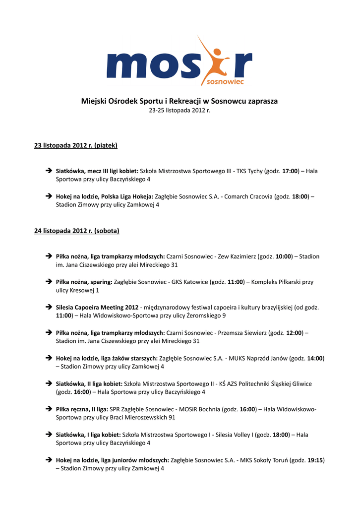 Miejski Ośrodek Sportu i Rekreacji w Sosnowcu zaprasza 23-25 listopada 2012 r. 23 listopada 2012 r. (piątek) ➔ Siatkówka, mecz III ligi kobiet: Szkoła Mistrzostwa Sportowego III - TKS Tychy (godz. 17:00) – Hala Sportowa przy ulicy Baczyńskiego 4 ➔ Hokej na lodzie, Polska Liga Hokeja: Zagłębie Sosnowiec S.A. - Comarch Cracovia (godz. 18:00) – Stadion Zimowy przy ulicy Zamkowej 4 24 listopada 2012 r. (sobota) ➔ Piłka nożna, liga trampkarzy młodszych: Czarni Sosnowiec - Zew Kazimierz (godz. 10:00) – Stadion im. Jana Ciszewskiego przy alei Mireckiego 31 ➔ Piłka nożna, sparing: Zagłębie Sosnowiec - GKS Katowice (godz. 11:00) – Kompleks Piłkarski przy ulicy Kresowej 1 ➔ Silesia Capoeira Meeting 2012 - międzynarodowy festiwal capoeira i kultury brazylijskiej (od godz. 11:00) – Hala Widowiskowo-Sportowa przy ulicy Żeromskiego 9 ➔ Piłka nożna, liga trampkarzy młodszych: Czarni Sosnowiec - Przemsza Siewierz (godz. 12:00) – Stadion im. Jana Ciszewskiego przy alei Mireckiego 31 ➔ Hokej na lodzie, liga żaków starszych: Zagłębie Sosnowiec S.A. - MUKS Naprzód Janów (godz. 14:00) – Stadion Zimowy przy ulicy Zamkowej 4 ➔ Siatkówka, II liga kobiet: Szkoła Mistrzostwa Sportowego II - KŚ AZS Politechniki Śląskiej Gliwice (godz. 16:00) – Hala Sportowa przy ulicy Baczyńskiego 4 ➔ Piłka ręczna, II liga: SPR Zagłębie Sosnowiec - MOSiR Bochnia (godz. 16:00) – Hala WidowiskowoSportowa przy ulicy Braci Mieroszewskich 91 ➔ Siatkówka, I liga kobiet: Szkoła Mistrzostwa Sportowego I - Silesia Volley I (godz. 18:00) – Hala Sportowa przy ulicy Baczyńskiego 4 ➔ Hokej na lodzie, liga juniorów młodszych: Zagłębie Sosnowiec S.A. - MKS Sokoły Toruń (godz. 19:15) – Stadion Zimowy przy ulicy Zamkowej 4 25 listopada 2012 r. (niedziela) ➔ Amatorska Liga Piłki Nożnej: Lechia - Anioły (godz. 8:30), CaboSteel - Politechnika (godz. 10:30) – Stadion im. Jana Ciszewskiego przy alei Mireckiego 31 ➔ Judo, turniej dzieci i młodzieży (rozpoczęcie godz. 9:00) – Kompleks Sportowy przy ulicy Orląt Lwowskich 70 ➔ Silesia Capoeira Meeting 2012 - międzynarodowy festiwal capoeira i kultury brazylijskiej (od godz. 11:00) – Hala Widowiskowo-Sportowa przy ulicy Żeromskiego 9 ➔ Piłka nożna, liga orlików: Czarni Sosnowiec - Górnik 09 Mysłowice (godz. 13:30) – Stadion im. Jana Ciszewskiego przy alei Mireckiego 31 ➔ Hokej na lodzie, liga juniorów młodszych: Zagłębie Sosnowiec S.A. - MKS Sokoły Toruń (godz. 14:00) – Stadion Zimowy przy ulicy Zamkowej 4 ➔ Hokej na lodzie, Polska Liga Hokeja: Zagłębie Sosnowiec S.A. - Aksam Unia Oświęcim (godz. 17:00) – Stadion Zimowy przy ulicy Zamkowej 4 ➔ Hokej na lodzie, liga amatorów: Sielec Sosnowiec - Niedźwiadki Bełchatów (godz. 21:00) – Stadion Zimowy przy ulicy Zamkowej 4
