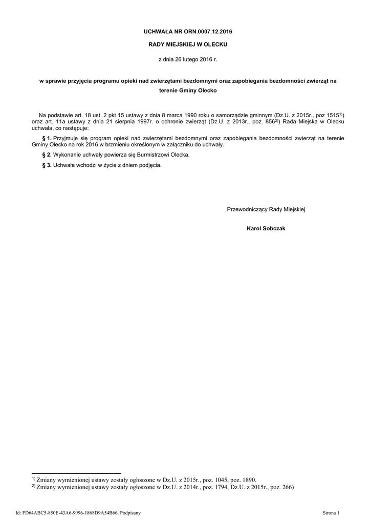 UCHWAŁA NR ORN.0007.12.2016 RADY MIEJSKIEJ W OLECKU z dnia 26 lutego 2016 r. w sprawie przyjęcia programu opieki nad zwierzętami bezdomnymi oraz zapobiegania bezdomności zwierząt na terenie Gminy Olecko Na podstawie art. 18 ust. 2 pkt 15 ustawy z dnia 8 marca 1990 roku o samorządzie gminnym (Dz.U. z 2015r., poz 15151)) oraz art. 11a ustawy z dnia 21 sierpnia 1997r. o ochronie zwierząt (Dz.U. z 2013r., poz. 8562)) Rada Miejska w Olecku uchwala, co następuje: § 1. Przyjmuje się program opieki nad zwierzętami bezdomnymi oraz zapobiegania bezdomności zwierząt na terenie Gminy Olecko na rok 2016 w brzmieniu określonym w załączniku do uchwały. § 2. Wykonanie uchwały powierza się Burmistrzowi Olecka. § 3. Uchwała wchodzi w życie z dniem podjęcia. Przewodniczący Rady Miejskiej Karol Sobczak 1) Zmiany 2) Zmiany wymienionej ustawy zostały ogłoszone w Dz.U. z 2015r., poz. 1045, poz. 1890. wymienionej ustawy zostały ogłoszone w Dz.U. z 2014r., poz. 1794, Dz.U. z 2015r., poz. 266) Id: FD64ABC5-850E-43A6-9996-1868D9A54B66. Podpisany Strona 1 Załącznik do uchwały Nr ORN.0007.12.2016 Rady Miejskiej w Olecku z dnia 26 lutego 2016 r. Program opieki nad zwierzętami bezdomnymi oraz zapobieganie bezdomności zwierząt na terenie Gminy Olecko w 2016 roku. Wstęp. § 1. 1. Program określa zasady postępowania z bezdomnymi zwierzętami oraz zapobiegania bezdomności zwierząt na terenie Gminy Olecko. 2. O ile w Programie mowa o: 1) zwierzętach bezdomnych- należy przez to rozumieć zwierzęta domowe lub gospodarskie, które uciekły, zabłąkały się lub zostały porzucone przez człowieka, a nie ma możliwości ustalenia ich właściciela lub innej osoby, pod której opieką trwale dotąd pozostawały; 2) zwierzętach domowych- należy przez to rozumieć zwierzęta tradycyjnie przebywające wraz z człowiekiem w jego domu lub innym odpowiednim pomieszczeniu, utrzymywane przez człowieka w charakterze jego towarzysza; 3) zwierzętach gospodarskich- należy przez to rozumieć zwierzęta gospodarskie w rozumieniu przepisów o organizacji hodowli i rozrodzie zwierząt gospodarskich; 4) schronisku - należy przez to rozumieć miejsce przeznaczone do opieki nad zwierzętami domowymi spełniające warunki określone w ustawie o ochronie zdrowia zwierząt oraz zwalczaniu chorób zakaźnych zwierząt; 5) programie- należy przez to rozumieć Program opieki nad zwierzętami bezdomnymi oraz zapobiegania bezdomności zwierząt na terenie Gminy Olecko w 2016 roku. 3. Program realizowany będzie zgodnie z obowiązującymi przepisami, w szczególności: 1) ustawą o ochronie zwierząt z dnia 21 sierpnia 1997r. o ochronie zwierząt (tekst jednolity: Dz. U. z 2013r., poz. 856 z późń. zm.); 2) ustawą o utrzymaniu czystości i porządku w gminach z dnia 13 września 1996r. (tekst jednolity: Dz. U. z 2013r., poz. 1399 z późń. zm.); 3) regulaminem utrzymania czystości i porządku na terenie gminy Olecko; 4) Rozporządzeniem Ministra Spraw Wewnętrznych i Administracji z dnia 26 sierpnia 1998r. w sprawie zasad i warunków wyłapywania bezdomnych zwierząt (Dz.U. Nr 116, poz. 753); 5) Rozporządzeniem Ministra Rolnictwa i Rozwoju Wsi z dnia 23 czerwca 2004r. w sprawie szczegółowych wymagań weterynaryjnych dla prowadzenia schronisk dla zwierząt (Dz.U. Nr 158, poz. 1657). 4. Realizatorami programu są: 1) Urząd Miejski w Olecku, Wydział Gospodarki Komunalnej i Ochrony Środowiska, jako koordynator Programu; 2) schronisko dla bezdomnych zwierząt, 3) podmioty, z którymi Gmina Olecko podpisze stosowne umowy. Założenia programu. § 2. 1. Celem wprowadzenia programu jest zapobieganie bezdomności zwierząt na terenie Gminy Olecko, w tym zmniejszenie populacji bezdomnych zwierząt oraz zapewnienie bezpieczeństwa i ochrony sanitarnej mieszkańców, oraz opieka nad zwierzętami bezdomnymi. 2. Realizacja celów określonych w ust. 1 odbywać się będzie poprzez: 1) odławianie bezdomnych zwierząt i zapewnienie im miejsca i opieki w schronisku dla zwierząt; 2) prowadzenie obligatoryjnej kastracji i sterylizacji zwierząt przebywających w schronisku; 3) elektroniczną identyfikację (chipowanie) zwierząt z terenu Gminy Olecko; 4) poszukiwanie nowych właścicieli dla bezdomnych zwierząt; 5) możliwość usypiania ślepych miotów; 6) opiekę nad wolno żyjącymi kotami; Id: FD64ABC5-850E-43A6-9996-1868D9A54B66. Podpisany Strona 1 7) zapewnienie miejsca dla zwierząt gospodarskich poprzez wskazanie gospodarstwa rolnego; 8) zapewnienie całodobowej opieki weterynaryjnej w przypadkach zdarzeń drogowych z udziałem zwierząt; 9) edukację mieszkańców. Odławianie i zapewnienie bezdomnym zwierzętom miejsca i opieki w schronisku. § 3. 1. Bezdomne zwierzęta z terenu Gminy Olecko będą wyłapywane i umieszczone w schronisku - Przedsiębiorstwie Prowadzenia Schronisk dla Bezdomnych Zwierząt, Bystry 26, 11-500 Giżycko. 2. Wyłapywanie bezdomnych zwierząt będzie odbywało się w sposób ciągły i realizowane jest na podstawie umowy zawartej ze schroniskiem. 3. Przewiduje się ciągłe utrzymanie w schronisku co najmniej 40 zwierząt. Wprowadzenie obligatoryjnej kastracji i sterylizacji zwierząt przebywających w schronisku. § 4. Każde odłowione i umieszczone w schronisku dla bezdomnych zwierząt zwierzę zostanie poddane zabiegowi kastracji bądź sterylizacji. Identyfikacja psów z terenu Gminy Olecko. § 5. 1. Elektronicznej identyfikacji (chipowaniu) poddane zostaną wszystkie zwierzęta trafiające do schroniska. Prowadzący schronisko obowiązany jest dokonywać identyfikacji zwierzęcia poprzez wszczepienie mikrochipa. 2. Właściciele psów z Gminy Olecko mogą bezpłatnie dokonać identyfikacji psa. 3. Bezpłatną identyfikację prowadzą następujące lecznice weterynaryjne: 1) Przychodnia Weterynaryjna VET-OL, 19-400 Olecko, ul. 11-go Listopada 24C, 2) Gabinet Weterynaryjny „Perro § Gato”, 19-400 Olecko, Al. Zwycięstwa 29/2a. 4. Każdy zachipowany pies zostanie wpr