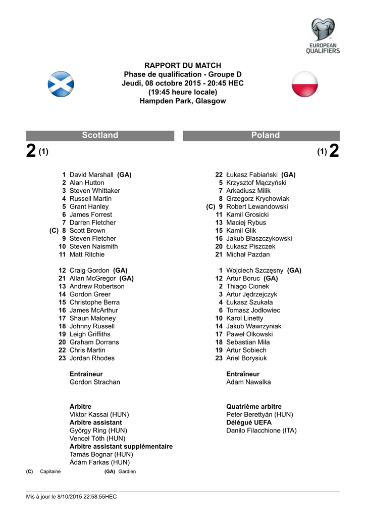RAPPORT DU MATCH Phase de qualification - Groupe D Jeudi, 08 octobre 2015 - 20:45 HEC (19:45 heure locale) Hampden Park, Glasgow Scotland Poland 2 (1) (1) 1 2 3 4 5 6 7 (C) 8 9 10 11 12 21 13 14 15 16 17 18 19 20 22 23 (C) Capitaine David Marshall (GA) Alan Hutton Steven Whittaker Russell Martin Grant Hanley James Forrest Darren Fletcher Scott Brown Steven Fletcher Steven Naismith Matt Ritchie Craig Gordon (GA) Allan McGregor (GA) Andrew Robertson Gordon Greer Christophe Berra James McArthur Shaun Maloney Johnny Russell Leigh Griffiths Graham Dorrans Chris Martin Jordan Rhodes 22 5 7 8 (C) 9 11 13 15 16 20 21 1 12 2 3 4 6 10 14 17 18 19 23 Łukasz Fabiański (GA) Krzysztof Mączyński Arkadiusz Milik Grzegorz Krychowiak Robert Lewandowski Kamil Grosicki Maciej Rybus Kamil Glik Jakub Błaszczykowski Łukasz Piszczek Michał Pazdan Wojciech Szczęsny (GA) Artur Boruc (GA) Thiago Cionek Artur Jędrzejczyk Łukasz Szukała Tomasz Jodłowiec Karol Linetty Jakub Wawrzyniak Paweł Olkowski Sebastian Mila Artur Sobiech Ariel Borysiuk Entraîneur Gordon Strachan Entraîneur Adam Nawalka Arbitre Viktor Kassai (HUN) Arbitre assistant György Ring (HUN) Vencel Tóth (HUN) Arbitre assistant supplémentaire Tamás Bognar (HUN) Ádám Farkas (HUN) Quatrième arbitre Peter Berettyán (HUN) Délégué UEFA Danilo Filacchione (ITA) (GA) Gardien Mis à jour le 8/10/2015 22:58:55HEC 2 Thursday 8 October 2015 - 20:45HEC (19:45 heure locale) Écosse - Pologne Hampden Park, Glasgow RAPPORT DU MATCH Scotland Poland 2 (1) (1) 3' 9 Robert Lewandowski 22' 13 Maciej Rybus 11 Matt Ritchie 45' 8 Scott Brown 56' 9 Steven Fletcher 62' 63' 2 Alan Hutton 68' 17 Shaun Maloney (entre) 10 Steven Naismith (sort) 69' 6 Tomasz Jodlowiec (entre) 7 Arkadiusz Milik (sort) 71' 16 James McArthur (entre) 7 Darren Fletcher (sort) 14 Jakub Wawrzyniak (entre) 13 Maciej Rybus (sort) 74' 83' 17 Pawel Olkowski (entre) 16 Jakub Blaszczykowski (sort) 8 Grzegorz Krychowiak 84' 20 Graham Dorrans (entre) 6 James Forrest (sort) 84' 90' + 4' But Penalty Carton(s) jaune(s) Carton(s) rouge(s) 2 9 Robert Lewandowski But contre son camp Double avertissement (C) Remplacement Capitaine Penalty manqué (GA) Gardien