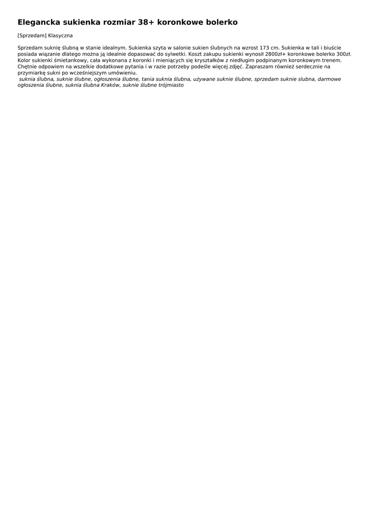 Elegancka sukienka rozmiar 38+ koronkowe bolerko [Sprzedam] Klasyczna Sprzedam suknię ślubną w stanie idealnym. Sukienka szyta w salonie sukien ślubnych na wzrost 173 cm. Sukienka w tali i biuście posiada wiązanie dlatego można ją idealnie dopasować do sylwetki. Koszt zakupu sukienki wynosił 2800zł+ koronkowe bolerko 300zł. Kolor sukienki śmietankowy, cała wykonana z koronki i mieniących się kryształków z niedługim podpinanym koronkowym trenem. Chętnie odpowiem na wszelkie dodatkowe pytania i w razie potrzeby podeśle więcej zdjęć. Zapraszam również serdecznie na przymiarkę sukni po wcześniejszym umówieniu. suknia ślubna, suknie ślubne, ogłoszenia ślubne, tania suknia ślubna, używane suknie ślubne, sprzedam suknie slubna, darmowe ogłoszenia ślubne, suknia ślubna Kraków, suknie ślubne trójmiasto Informacje dodatkowe Ilość 1 Stan Używany Adres ogłoszenia http://todoslubu.pl/elegancka-sukienka-rozmiar-38-koronkowe-bolerko,o200 Kontakt Mail: [email protected] Telefon: Lokalizacja , - (Polska) Ogłoszenie dodano: 2016-10-26 09:33:49 Ogłoszenie wygasa: 2018-01-24 09:33:49 Powered by TCPDF (www.tcpdf.org)