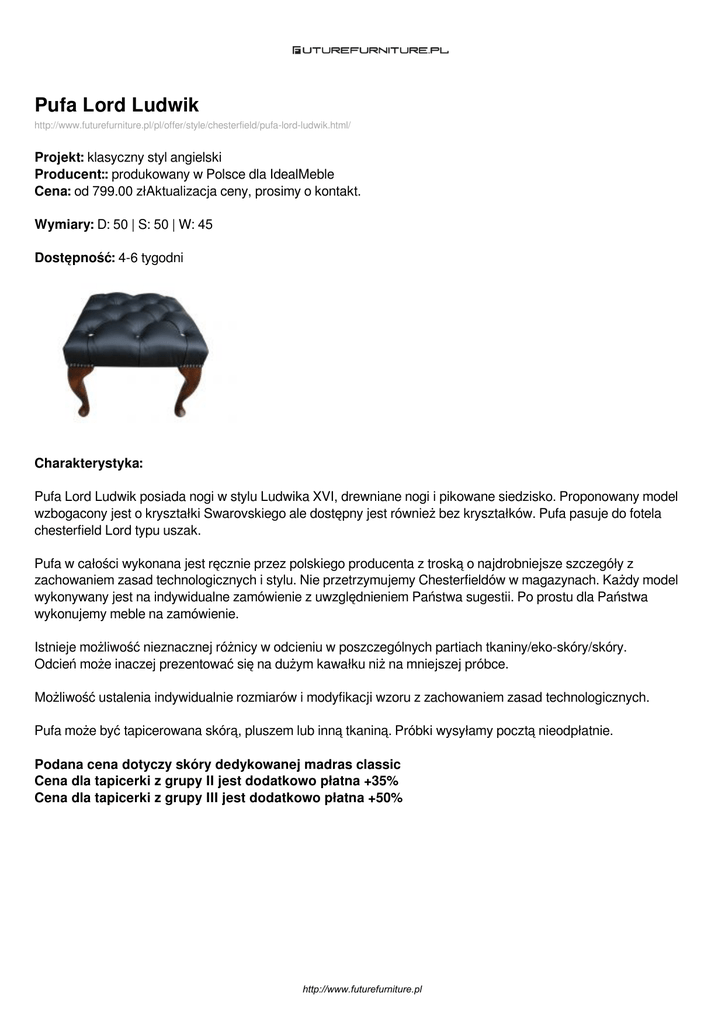 Pufa Lord Ludwik http://www.futurefurniture.pl/pl/offer/style/chesterfield/pufa-lord-ludwik.html/ Projekt: klasyczny styl angielski Producent:: produkowany w Polsce dla IdealMeble Cena: od 799.00 złAktualizacja ceny, prosimy o kontakt. Wymiary: D: 50 | S: 50 | W: 45 Dostępność: 4-6 tygodni Charakterystyka: Pufa Lord Ludwik posiada nogi w stylu Ludwika XVI, drewniane nogi i pikowane siedzisko. Proponowany model wzbogacony jest o kryształki Swarovskiego ale dostępny jest również bez kryształków. Pufa pasuje do fotela chesterfield Lord typu uszak. Pufa w całości wykonana jest ręcznie przez polskiego producenta z troską o najdrobniejsze szczegóły z zachowaniem zasad technologicznych i stylu. Nie przetrzymujemy Chesterfieldów w magazynach. Każdy model wykonywany jest na indywidualne zamówienie z uwzględnieniem Państwa sugestii. Po prostu dla Państwa wykonujemy meble na zamówienie. Istnieje możliwość nieznacznej różnicy w odcieniu w poszczególnych partiach tkaniny/eko-skóry/skóry. Odcień może inaczej prezentować się na dużym kawałku niż na mniejszej próbce. Możliwość ustalenia indywidualnie rozmiarów i modyfikacji wzoru z zachowaniem zasad technologicznych. Pufa może być tapicerowana skórą, pluszem lub inną tkaniną. Próbki wysyłamy pocztą nieodpłatnie. Podana cena dotyczy skóry dedykowanej madras classic Cena dla tapicerki z grupy II jest dodatkowo płatna +35% Cena dla tapicerki z grupy III jest dodatkowo płatna +50% http://www.futurefurniture.pl Dostępne wersje produktu: nazwa produktu Pufa Lord Ludwik Pufa Lord Ludwik warianty cena Tapicerka skóra 799.00zł naturalna Tapicerka skóra 1040.00zł naturalna + kryształki Swarovskiego http://www.futurefurniture.pl dostępne Na zamówienie Na zamówienie Zdjęcia produktu: http://www.futurefurniture.pl Powered by TCPDF (www.tcpdf.org)