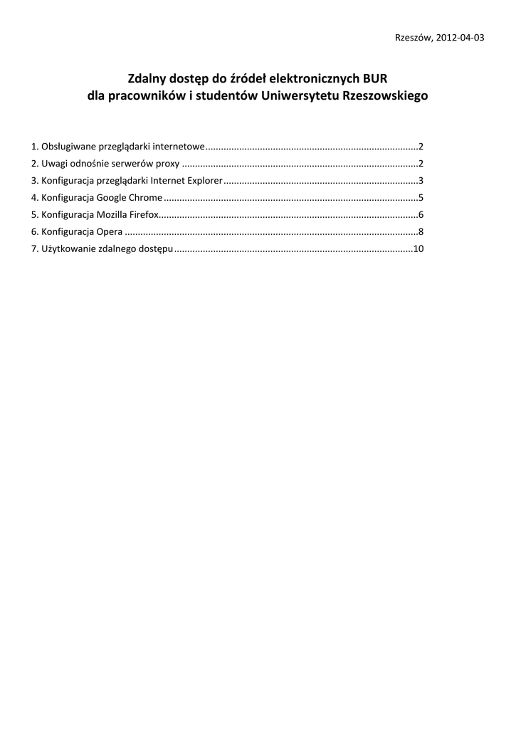 Rzeszów, 2012-04-03 Zdalny dostęp do źródeł elektronicznych BUR dla pracowników i studentów Uniwersytetu Rzeszowskiego 1. Obsługiwane przeglądarki internetowe ..................................................................................2 2. Uwagi odnośnie serwerów proxy ...........................................................................................2 3. Konfiguracja przeglądarki Internet Explorer ...........................................................................3 4. Konfiguracja Google Chrome ..................................................................................................5 5. Konfiguracja Mozilla Firefox....................................................................................................6 6. Konfiguracja Opera .................................................................................................................8 7. Użytkowanie zdalnego dostępu ............................................................................................10 W celu uzyskania zdalnego dostępu do polskich i zagranicznych baz pełnotekstowych, bibliograficznych i abstraktowych wymienionych na stronie http://bur.univ.rzeszow.pl/bazy-dostepne-w-sieci-ur niezbędna jest właściwa konfiguracja przeglądarki internetowej oraz posiadanie konta dostępowego koniecznego do autoryzacji użytkownika. 1. Obsługiwane przeglądarki internetowe Zdalny dostęp można uzyskać używając następujących przeglądarek internetowych: Internet Explorer (IE) – w wersji nie niższej niż IE6, Mozilla Firefox – w wersji nie niższej niż 2.x Google Chrome Opera – w wersji nie niższej niż 7.x Użycie innych przeglądarek nie było testowane, ale jest możliwe, o ile przeglądarka obsługuje skrypty zdalnej konfiguracji. 2. Uwagi odnośnie serwerów proxy Omówione w punktach 3. do 6. czynności zmieniają ustawienia proxy połączenia przeglądarki. Jeżeli używana jest indywidualna konfiguracja proxy, zdalny dostęp do zasobów BUR może nie działać. Jeżeli indywidualna konfiguracja proxy zostanie zastąpiona konfiguracją omawianą w tej instrukcji, to po zakończeniu korzystania z zasobów BUR należy przywrócić własne ustawienia proxy. 3. Konfiguracja przeglądarki Internet Explorer Instrukcja dotyczy przeglądarki IE8, w poprzednich wersjach wygląd i układ poszczególnych okien może się różnić. 3.1 W otwartym oknie przegląd rozwijamy listę „Narzędzia” i wybieramy pozycję „Opcje Internetowe”. 3.2 Następnie wybieramy zakładkę „Połączenia” i wybieramy „Ustawienia sieci LAN”. 3.3 Zaznaczamy pole „Użyj skryptu automatycznej konfiguracji” a w polu „Adres” wpisujemy: http://bur.univ.rzeszow.pl/bur.pac 3.4 Zatwierdzamy zmiany klikając przyciski „OK” i powracamy do głównego okna przeglądarki. 4. Konfiguracja Google Chrome Przeglądarka Google Chrome korzysta z tych samych ustawień co Internet Explorer. Jeżeli ustawienia zostały skonfigurowane w IE nie ma potrzeby powtarzania czynności w Chrome. 4.1 Rozwijamy listę „Ustawienia Google Chrome” i wybieramy „Ustawienia”. 4.2 Przechodzimy do zakładki „Dla zaawansowanych” i wybieramy „Zmień ustawienia serwera proxy” 4.3 Następnie wykonujemy czynności 3.2 do 3.4 z konfiguracji Internet Explorer. Na koniec klikamy „Zamknij” aby powrócić do okna przeglądarki. 4.4 Ostatnim krokiem jest zamknięcie przeglądarki i uruchomienie jej ponownie. 5. Konfiguracja Mozilla Firefox 5.1 Rozwijamy listę „Opcje” i wybieramy ponownie „Opcje”. 5.2 Wybieramy zakładkę „Zaawansowane”, następnie „Sieć” i w polu Połączenie wybieramy „Ustawienia”. 5.3 Zaznaczamy „Adres URL automatycznej http://bur.univ.rzeszow.pl/bur.pac konfiguracji proxy” 5.4 Zatwierdzamy zmiany przyciskami „OK” aby powrócić do okna przeglądarki. i w pole wpisujemy: 6. Konfiguracja Opera 6.1 Rozwijamy listę „Ustawienia” i wybieramy pozycję „Preferencje”. 6.2 Przechodzimy do zakładki „Zaawansowane” i z listy po lewej stronie wybieramy „Sieć”. Następnie wybieramy „Serwer Proxy…”. 6.3 Zaznaczamy „Użyj automatycznej http://bur.univ.rzeszow.pl/bur.pac konfiguracji proxy”, a w polu 6.4 Zatwierdzamy zmiany klikając przyciski „OK” i powracamy do głównego okna przeglądarki. wpisujemy: 7. Użytkowanie zdalnego dostępu 7.1 W prawidłowo skonfigurowanej przeglądarce przechodzimy na stronę http://bur.univ.rzeszow.pl/bazy-dostepne-w-sieci-ur a następnie wybieramy żądaną bazę. 7.2 W oknie logowania podajemy login (Użytkownik) oraz hasło do niego. 7.3 Po zalogowaniu uzyskujemy dostęp, taki jak z sieci komputerów uniwersyteckich, do wszystkich zasobów wymienionych na stronie. Po dwóch godzinach użytkowania, lub po zamknięciu przeglądarki będzie konieczne ponowne zalogowanie.