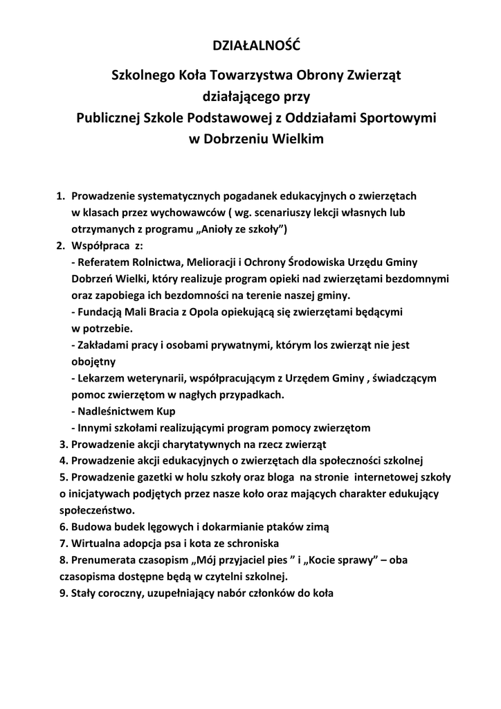 DZIAŁALNOŚĆ Szkolnego Koła Towarzystwa Obrony Zwierząt działającego przy Publicznej Szkole Podstawowej z Oddziałami Sportowymi w Dobrzeniu Wielkim 1. Prowadzenie systematycznych pogadanek edukacyjnych o zwierzętach w klasach przez wychowawców ( wg. scenariuszy lekcji własnych lub otrzymanych z programu „Anioły ze szkoły”) 2. Współpraca z: - Referatem Rolnictwa, Melioracji i Ochrony Środowiska Urzędu Gminy Dobrzeń Wielki, który realizuje program opieki nad zwierzętami bezdomnymi oraz zapobiega ich bezdomności na terenie naszej gminy. - Fundacją Mali Bracia z Opola opiekującą się zwierzętami będącymi w potrzebie. - Zakładami pracy i osobami prywatnymi, którym los zwierząt nie jest obojętny - Lekarzem weterynarii, współpracującym z Urzędem Gminy , świadczącym pomoc zwierzętom w nagłych przypadkach. - Nadleśnictwem Kup - Innymi szkołami realizującymi program pomocy zwierzętom 3. Prowadzenie akcji charytatywnych na rzecz zwierząt 4. Prowadzenie akcji edukacyjnych o zwierzętach dla społeczności szkolnej 5. Prowadzenie gazetki w holu szkoły oraz bloga na stronie internetowej szkoły o inicjatywach podjętych przez nasze koło oraz mających charakter edukujący społeczeństwo. 6. Budowa budek lęgowych i dokarmianie ptaków zimą 7. Wirtualna adopcja psa i kota ze schroniska 8. Prenumerata czasopism „Mój przyjaciel pies ” i „Kocie sprawy” – oba czasopisma dostępne będą w czytelni szkolnej. 9. Stały coroczny, uzupełniający nabór członków do koła