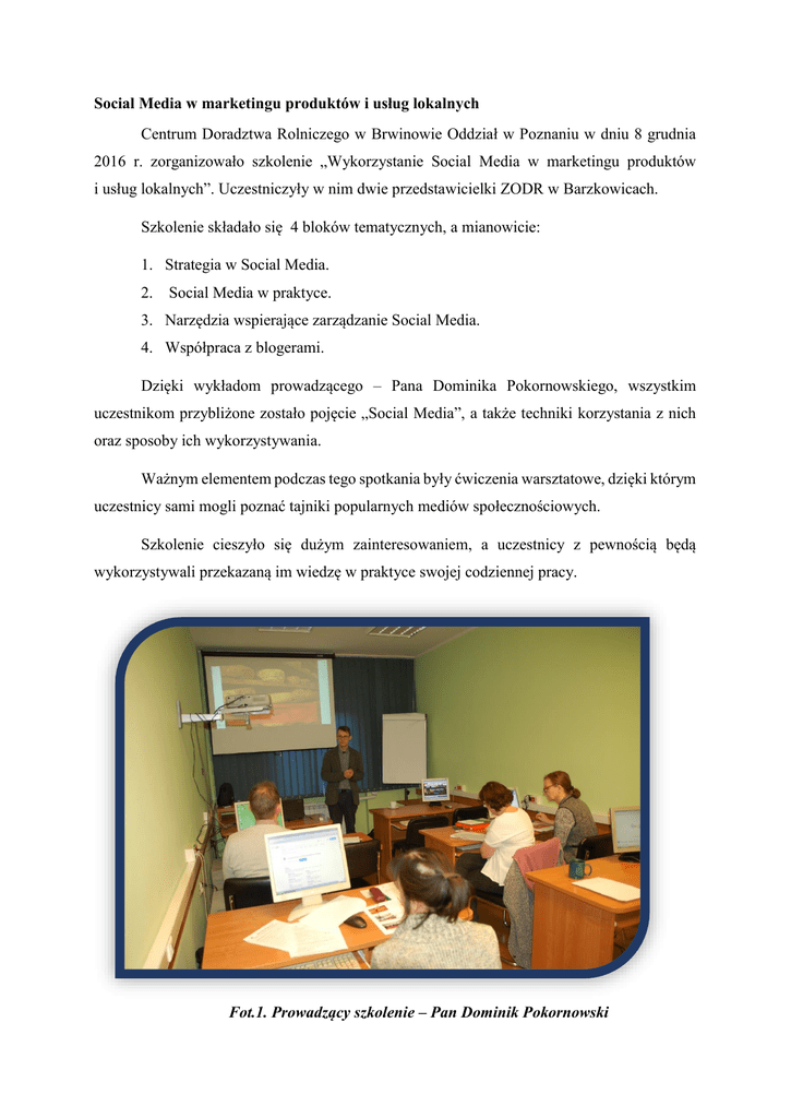 Social Media w marketingu produktów i usług lokalnych Centrum Doradztwa Rolniczego w Brwinowie Oddział w Poznaniu w dniu 8 grudnia 2016 r. zorganizowało szkolenie „Wykorzystanie Social Media w marketingu produktów i usług lokalnych”. Uczestniczyły w nim dwie przedstawicielki ZODR w Barzkowicach. Szkolenie składało się 4 bloków tematycznych, a mianowicie: 1. Strategia w Social Media. 2. Social Media w praktyce. 3. Narzędzia wspierające zarządzanie Social Media. 4. Współpraca z blogerami. Dzięki wykładom prowadzącego – Pana Dominika Pokornowskiego, wszystkim uczestnikom przybliżone zostało pojęcie „Social Media”, a także techniki korzystania z nich oraz sposoby ich wykorzystywania. Ważnym elementem podczas tego spotkania były ćwiczenia warsztatowe, dzięki którym uczestnicy sami mogli poznać tajniki popularnych mediów społecznościowych. Szkolenie cieszyło się dużym zainteresowaniem, a uczestnicy z pewnością będą wykorzystywali przekazaną im wiedzę w praktyce swojej codziennej pracy. Fot.1. Prowadzący szkolenie – Pan Dominik Pokornowski Fot.2. Uczestnicy szkolenia podczas ćwiczeń warsztatowych Fot.3. Ćwiczenia warsztatowe