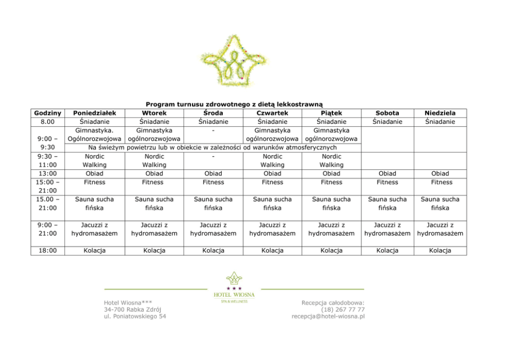 Godziny 8.00 9:00 – 9:30 9:30 – 11:00 13:00 15:00 – 21:00 15.00 – 21:00 Program turnusu zdrowotnego z dietą lekkostrawną Poniedziałek Wtorek Środa Czwartek Piątek Śniadanie Śniadanie Śniadanie Śniadanie Śniadanie Gimnastyka. Gimnastyka Gimnastyka Gimnastyka Ogólnorozwojowa ogólnorozwojowa ogólnorozwojowa ogólnorozwojowa Na świeżym powietrzu lub w obiekcie w zależności od warunków atmosferycznych Nordic Nordic Nordic Nordic Walking Walking Walking Walking Obiad Obiad Obiad Obiad Obiad Fitness Fitness Fitness Fitness Fitness Sobota Śniadanie Niedziela Śniadanie Obiad Fitness Obiad Fitness Sauna sucha fińska Sauna sucha fińska Sauna sucha fińska Sauna sucha fińska Sauna sucha fińska Sauna sucha fińska Sauna sucha fińska 9:00 – 21:00 Jacuzzi z hydromasażem Jacuzzi z hydromasażem Jacuzzi z hydromasażem Jacuzzi z hydromasażem Jacuzzi z hydromasażem Jacuzzi z hydromasażem Jacuzzi z hydromasażem 18:00 Kolacja Kolacja Kolacja Kolacja Kolacja Kolacja Kolacja