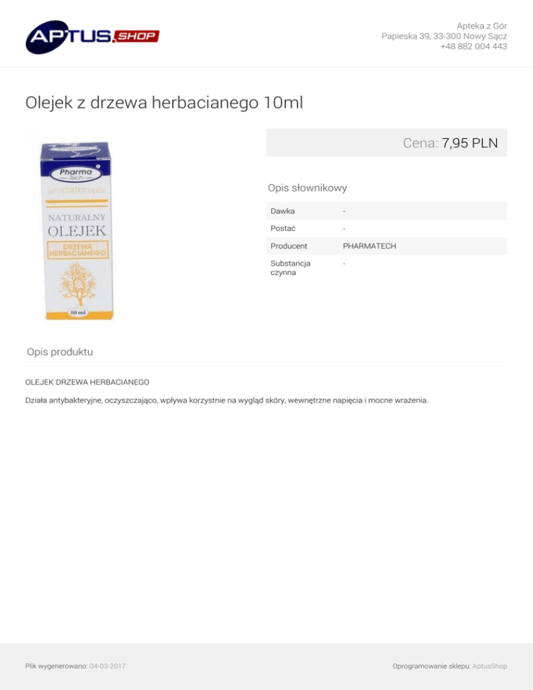 Apteka z Gór Papieska 39, 33-300 Nowy Sącz +48 882 004 443 Olejek z drzewa herbacianego 10ml Cena: 7,95 PLN Opis słownikowy Dawka - Postać - Producent PHARMATECH Substancja czynna - Opis produktu OLEJEK DRZEWA HERBACIANEGO Działa antybakteryjne, oczyszczająco, wpływa korzystnie na wygląd skóry, wewnętrzne napięcia i mocne wrażenia. Plik wygenerowano: 04-03-2017 Powered by TCPDF (www.tcpdf.org) Oprogramowanie sklepu: AptusShop