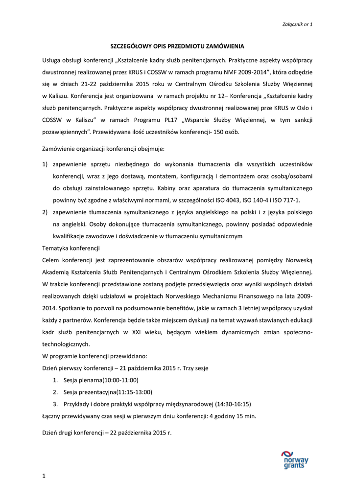 Załącznik nr 1 SZCZEGÓŁOWY OPIS PRZEDMIOTU ZAMÓWIENIA Usługa obsługi konferencji „Kształcenie kadry służb penitencjarnych. Praktyczne aspekty współpracy dwustronnej realizowanej przez KRUS i COSSW w ramach programu NMF 2009-2014”, która odbędzie się w dniach 21-22 października 2015 roku w Centralnym Ośrodku Szkolenia Służby Więziennej w Kaliszu. Konferencja jest organizowana w ramach projektu nr 12– Konferencja „Kształcenie kadry służb penitencjarnych. Praktyczne aspekty współpracy dwustronnej realizowanej prze KRUS w Oslo i COSSW w Kaliszu” w ramach Programu PL17 „Wsparcie Służby Więziennej, w tym sankcji pozawięziennych”. Przewidywana ilość uczestników konferencji- 150 osób. Zamówienie organizacji konferencji obejmuje: 1) zapewnienie sprzętu niezbędnego do wykonania tłumaczenia dla wszystkich uczestników konferencji, wraz z jego dostawą, montażem, konfiguracją i demontażem oraz osobą/osobami do obsługi zainstalowanego sprzętu. Kabiny oraz aparatura do tłumaczenia symultanicznego powinny być zgodne z właściwymi normami, w szczególności ISO 4043, ISO 140-4 i ISO 717-1. 2) zapewnienie tłumaczenia symultanicznego z języka angielskiego na polski i z języka polskiego na angielski. Osoby dokonujące tłumaczenia symultanicznego, powinny posiadać odpowiednie kwalifikacje zawodowe i doświadczenie w tłumaczeniu symultanicznym Tematyka konferencji Celem konferencji jest zaprezentowanie obszarów współpracy realizowanej pomiędzy Norweską Akademią Kształcenia Służb Penitencjarnych i Centralnym Ośrodkiem Szkolenia Służby Więziennej. W trakcie konferencji przedstawione zostaną podjęte przedsięwzięcia oraz wyniki wspólnych działań realizowanych dzięki udziałowi w projektach Norweskiego Mechanizmu Finansowego na lata 20092014. Spotkanie to pozwoli na podsumowanie benefitów, jakie w ramach 3 letniej współpracy uzyskał każdy z partnerów. Konferencja będzie także miejscem dyskusji na temat wyzwań stawianych edukacji kadr służb penitencjarnych w XXI wieku, będącym wiekiem dynamicznych zmian społecznotechnologicznych. W programie konferencji przewidziano: Dzień pierwszy konferencji – 21 października 2015 r. Trzy sesje 1. Sesja plenarna(10:00-11:00) 2. Sesja prezentacyjna(11:15-13:00) 3. Przykłady i dobre praktyki współpracy międzynarodowej (14:30-16:15) Łączny przewidywany czas sesji w pierwszym dniu konferencji: 4 godziny 15 min. Dzień drugi konferencji – 22 października 2015 r. 1 Załącznik nr 1 1. Przedstawienie skutecznych i efektywnych metod w szkoleniu zawodowym (9:00-10:45) 2. Doskonalenie zawodowe i rozwój zawodowy funkcjonariuszy zgodnie z ideami kształcenia ustawicznego (11:00-12:45) 3. Sesja zamykająca konferencję (12:45-13:00) Łączny przewidywany czas sesji w drugim dniu konferencji: 3 godziny 45 min. Tematyka konferencji obejmuje zagadnienia metodyki szkolenia osób dorosłych, szkolenia zawodowego funkcjonariuszy służby więziennej w Polsce, w Norwegii a także innych państw europejskich oraz ogólnie rozumieniach zagadnień penitencjarnych. 2