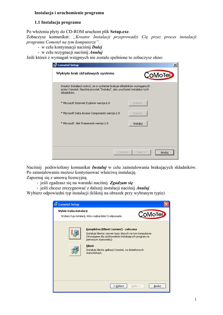 Instalacja i uruchomienie programu 1.1 Instalacja programu Po włożeniu płyty do CD-ROM uruchom plik Setup.exe. Zobaczysz komunikat: „Kreator Instalacji przeprowadzi Cię przez proces instalacji programu Comotel na tym komputerze”. - w celu kontynuacji naciśnij Dalej - w celu rezygnacji naciśnij Anuluj Jeśli któreś z wymagań wstępnych nie zostało spełnione to zobaczysz okno: Naciśnij podświetlony komunikat Instaluj w celu zainstalowania brakujących składników. Po zainstalowaniu możesz kontynuować właściwą instalację. Zapoznaj się z umową licencyjną - jeśli zgadzasz się na warunki naciśnij Zgadzam się - jeśli chcesz zrezygnować z dalszej instalacji naciśnij Anuluj Wybierz odpowiedni typ instalacji (kliknij na obrazek przy wybranym typie) 1 Kompletna (Klient i serwer) – zalecana Instaluje klienta i serwer bazy danych na tym komputerze. Wymagana dla użytkowników instalujących program na pierwszym stanowisku. Klient Instaluje klienta na dodatkowych stanowiskach. Po wybraniu rodzaju instalacji zobaczysz komunikat o gotowości do instalacji. - jeśli chcesz kontynuować naciśnij Instaluj - jeśli chcesz cofnąć się naciśnij Wstecz - jeśli chcesz przerwać instalację naciśnij Anuluj Czekaj aż program zainstaluje się – to może potrwać kilka minut Po zakończeniu instalacji zobaczysz komunikat: „Zakończono I etap instalacji. Wybierz dalej, aby przejść do II etapu”. Po wybraniu przycisku Dalej uruchomi się Instalator bazy danych (dotyczy instalacji Kompletnej). Program zdefiniuje pola w bazie danych, zapisze dane oraz skonfiguruje menu. - jeśli chcesz kontynuować naciśnij Dalej - jeśli chcesz zakończyć pracę naciśnij Anuluj Teraz pojawi się okno parametrów połączenia z bazą. Nazwę bazy można zmienić – nie używaj wówczas polskich liter ani innych znaków specjalnych! UWAGA! Jeśli instalujesz program po raz kolejny i nie zmienisz nazwy bazy pojawi się komunikat 2 Jeśli akceptujesz wybierz Tak, jeśli chcesz samodzielnie zmienić nazwę bazy wybierz Nie Jeśli wszystkie parametry są poprawne pojawi się komunikat o potwierdzeniu parametrów - wybierz Dalej aby kontynuować instalację - wybierz Wstecz aby zmienić parametry - wybierz Anuluj w celu rezygnacji Czekaj – dane ładują się do bazy, to może potrwać kilka minut. Gdy pojawi się informacja o zakończeniu konfiguracji bazy naciśnij Zakończ. Logując się po raz pierwszy oraz pracując na wersji demo programu należy wpisać: Użytkownik: A (A, B lub C) Hasło: 123 Jeśli pojawi się komunikat: Oznacza to, że prawdopodobnie zmieniałeś nazwę bazy podczas instalacji, bądź instalator samodzielnie ją zmienił. Należy wówczas wybrać w okienku logowania przycisk Ustawienia, wybrać prawidłową nazwę bazy i ponownie zalogować się. 3