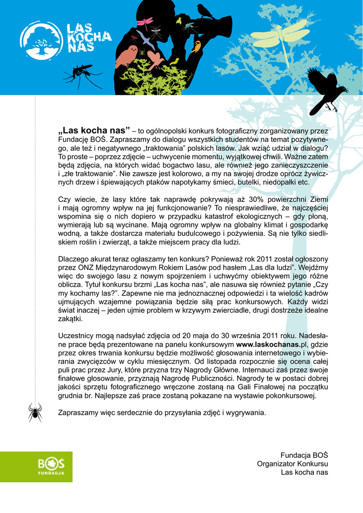 „Las kocha nas” – to ogólnopolski konkurs fotograficzny zorganizowany przez Fundację BOŚ. Zapraszamy do dialogu wszystkich studentów na temat pozytywnego, ale też i negatywnego „traktowania” polskich lasów. Jak wziąć udział w dialogu? To proste – poprzez zdjęcie – uchwycenie momentu, wyjątkowej chwili. Ważne zatem będą zdjęcia, na których widać bogactwo lasu, ale również jego zanieczyszczenie i „złe traktowanie”. Nie zawsze jest kolorowo, a my na swojej drodze oprócz żywicznych drzew i śpiewających ptaków napotykamy śmieci, butelki, niedopałki etc. Czy wiecie, że lasy które tak naprawdę pokrywają aż 30% powierzchni Ziemi i mają ogromny wpływ na jej funkcjonowanie? To niesprawiedliwe, że najczęściej wspomina się o nich dopiero w przypadku katastrof ekologicznych – gdy płoną, wymierają lub są wycinane. Mają ogromny wpływ na globalny klimat i gospodarkę wodną, a także dostarcza materiału budulcowego i pożywienia. Są nie tylko siedliskiem roślin i zwierząt, a także miejscem pracy dla ludzi. Dlaczego akurat teraz ogłaszamy ten konkurs? Ponieważ rok 2011 został ogłoszony przez ONZ Międzynarodowym Rokiem Lasów pod hasłem „Las dla ludzi”. Wejdźmy więc do swojego lasu z nowym spojrzeniem i uchwyćmy obiektywem jego różne oblicza. Tytuł konkursu brzmi „Las kocha nas”, ale nasuwa się również pytanie „Czy my kochamy las?”. Zapewne nie ma jednoznacznej odpowiedzi i ta wielość kadrów ujmujących wzajemne powiązania będzie siłą prac konkursowych. Każdy widzi świat inaczej – jeden ujmie problem w krzywym zwierciadle, drugi dostrzeże idealne zakątki. Uczestnicy mogą nadsyłać zdjęcia od 20 maja do 30 września 2011 roku. Nadesłane prace będą prezentowane na panelu konkursowym www.laskochanas.pl, gdzie przez okres trwania konkursu będzie możliwość głosowania internetowego i wybierania zwycięzców w cyklu miesięcznym. Od listopada rozpocznie się ocena całej puli prac przez Jury, które przyzna trzy Nagrody Główne. Internauci zaś przez swoje finałowe głosowanie, przyznają Nagrodę Publiczności. Nagrody te w postaci dobrej jakości sprzętu fotograficznego wręczone zostaną na Gali Finałowej na początku grudnia br. Najlepsze zaś prace zostaną pokazane na wystawie pokonkursowej. Zapraszamy więc serdecznie do przysyłania zdjęć i wygrywania. Fundacja BOŚ Organizator Konkursu Las kocha nas