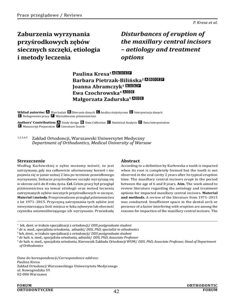Prace przeglądowe / Reviews P. Kresa et al. Disturbances of eruption of the maxillary central incisors – aetiology and treatment options Zaburzenia wyrzynania przyśrodkowych zębów siecznych szczęki, etiologia i metody leczenia Paulina Kresa1 a b d e f Barbara Pietrzak-Bilińska2 a b d e Joanna Abramczyk3 b d e f Ewa Czochrowska4 A d e Małgorzata Zadurska5 A d e f Wkład autorów: A Plan badań B Zbieranie danych C Analiza statystyczna D Interpretacja danych E Redagowanie pracy F Wyszukiwanie piśmiennictwa Authors’ Contribution: A Study design B Data Collection C Statistical Analysis D Data Interpretation E Manuscript Preparation F Literature Search Zakład Ortodoncji, Warszawski Uniwersytet Medyczny Department of Orthodontics, Medical University of Warsaw 1,2,3,4,5 Streszczenie Według Karłowskiej o zębie możemy mówić, że jest zatrzymany, gdy ma całkowicie uformowany korzeń i nie pojawia się w jamie ustnej 2 lata po terminie prawidłowego wyrzynania. Siekacze przyśrodkowe szczęki wyrzynają się w okresie od 6 do 8 roku życia. Cel. Celem pracy był przegląd piśmiennictwa na temat etiologii oraz metod leczenia zatrzymanych zębów siecznych przyśrodkowych w szczęce. Materiał i metody. Przeprowadzono przegląd piśmiennictwa z lat 1971–2015. Przyczyną zatrzymania tych zębów jest niewystarczająca ilość miejsca w łuku zębowym lub obecność czynnika uniemożliwiającego ich wyrzynanie. Przeszkodę Abstract According to a definition by Karłowska a tooth is impacted when its root is completely formed but the tooth is not observed in the oral cavity 2 years after its typical eruption time. The maxillary central incisors erupt in the period between the age of 6 and 8 years. Aim. The work aimed to review literature regarding the aetiology and treatment options for impacted maxillary central incisors. Material and methods. A review of the literature from 1971–2015 was conducted. Insufficient space in the dental arch or presence of a factor interfering with eruption are among the reasons for impaction of the maxillary central incisors. The lek. dent. w trakcie specjalizacji z ortodoncji/ DDS postgraduate student dr n. med., specjalista ortodonta, adiunkt/ DDS, PhD, specialist in othodontics 3 lek. dent., w trakcie specjalizacji z ortodoncji/ DDS postgraduate student 4 dr hab. n. med., specjalista ortodonta, adiunkt/ DDS, PhD, Associate Professor 5 dr hab. n. med., specjalista ortodonta, Kierownik Zakładu Ortodoncji WUM/ DDS, PhD, Associate Professor, Head of Department of Orthodontics 1 2 Dane do korespondencji/correspondence address: Paulina Kresa Zakład Ortodoncji Warszawskiego Uniwersytetu Medycznego ul. Nowogrodzka 59 02-006 Warszawa ForumOrthodontic Ortodontyczneforum 42 Prace przeglądowe / Reviews Disturbances of eruption of the maxillary central incisors – aetiology and treatment options w wyrzynaniu mogą stanowić: ząb nadliczbowy, guz zębopochodny lub torbiel. Uraz zęba mlecznego we wczesnym dzieciństwie może spowodować dilacerację korzenia stałego następcy. Metody leczenia zatrzymanych zębów siecznych przyśrodkowych szczęki dzielimy na: ortodontyczne, chirurgiczne i ortodontyczno-chirurgiczne. Wyniki. Najlepsze efekty leczenia, jak do tej pory, są uzyskiwane wtedy, gdy zabieg chirurgiczny jest przeprowadzony techniką zamkniętą. Leczenie ortodontyczne zębów zatrzymanych może być prowadzone za pomocą aparatów zdejmowanych lub stałych. W przypadku nasilonych nieprawidłowości zębowych lepsze rezultaty uzyskuje się, stosując stałe aparaty ortodontyczne. (Kresa P, Pietrzak-Bilińska B, Abramczyk J, Czochrowska E, Zadurska M. Zaburzenia wyrzynania przyśrodkowych zębów siecznych szczęki, etiologia i metody leczenia. Forum Ortod 2016; 12: 42-51). Nadesłano: 25.01.2016 Przyjęto do druku: 14.03.2016 following factors may inhibit tooth eruption: supernumerary tooth, odontogenic tumour or a cyst. A trauma to a deciduous tooth in the early childhood may cause dilaceration of a root of its permanent successor. Methods to treat impacted maxillary central incisors include orthodontic, surgical and orthodontic-surgical methods. Results. So far, the best treatment outcomes are obtained when a surgical procedure is performed with a closed technique. Orthodontic treatment of impacted teeth may be performed with mobile or permanent appliances. In case of more advanced dental abnormalities permanent appliances allow to obtain better outcomes. (Kresa P, Pietrzak-Bilińska B, Abramczyk J, Czochrowska E, Zadurska M. Disturbances of eruption of the maxillary central incisors – aetiology and treatment options. Orthod Forum 2016; 12: 42-51). Received: 25.01.2016 Accepted: 14.03.2016 Wstęp Introduction Słowa kluczowe: zatrzymany ząb, siekacz centralny, leczenie zębów zatrzymanych, dilaceracja, ankyloza, autotransplantacja Na podstawie wielu badań ankietowych wykazano, że główną motywacją do podjęcia leczenia ortodontycznego wśród dzieci i nastolatków jest estetyka uśmiechu. Natomiast ich rodzice poszukują pomocy ortodontycznej, aby zapobiec w przyszłości potencjalnym problemom w obrębie układu stomatognatycznego (1, 2). Brak zębów siecznych w wieku, kiedy mają je już rówieśnicy, motywuje młodego pacjenta do leczenia ortodontycznego dużo bardziej, niż jakakolwiek wada zgryzu. W związku z tym zaburzenia wyrzynania siekaczy przyśrodkowych szczęki wymagają pilnego rozpoczęcia leczenia ortodontycznego nie tylko ze względów medycznych, ale także psychospołecznych. Według definicji Karłowskiej ząb jest zatrzymany, gdy ma całkowicie uformowany korzeń i nie pojawia się w jamie ustnej 2 lata po terminie prawidłowego wyrzynania (3). Ząb całkowicie zatrzymany jest w całości otoczony kością, natomiast ząb częściowo zatrzymany jest umiejscowiony w kości szczęk, a jego koronę pokrywa tylko błona śluzowa lub jej fragment widoczny w jamie ustnej (4). Becker wykazał, że ząb rozpoczyna proce