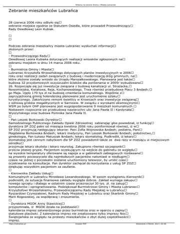 Witamy na stronie Gminy i Miasta Lubraniec Zebranie mieszkańców Lubrańca 28 czerwca 2006 roku odbyło się zebranie miejskie zgodnie ze Statutem Osiedla, które prowadził Przewodniczący Rady Osiedlowej Leon Kubiak. Podczas zebrania mieszkańcy miasta Lubraniec wysłuchali informacji złożonych przez: - Przewodniczącego Rady Osiedlowej Leona Kubiaka dotyczących realizacji wniosków zgłoszonych na zebraniu miejskim w dniu 14 marca 2006 roku. - Burmistrza Gminy i Miasta Lubraniec Krzysztofa Wrzesińskiego dotyczących planów inwestycyjnych w 2006 roku oraz realizacji zadań związanych z budową i modernizacją dróg gminnych, na które złożone zostały wnioski do Urzędu Marszałkowskiego. Planowana jest także budowa 32 przydomowych oczyszczalni ścieków dla porównania w 2005r wybudowano 26. Rozpoczęła się już inwestycja związana z budową kanalizacji ul. Strażacka, Nowomiejska, Kwiatowa, Reja, Kochanowskiego. Trwa również przebudowa Placu 3 – go Maja. Ujęto 170 tys zł na budowę cmentarza komunalnego. Wspólnie z zaprzyjaźnioną gminą holenderską planowane jest uruchomienie szlaku turystycznego. Zakończono remont świetlicy w Krowicach oraz inwestycje związaną z odnową grobów megalitycznych w Sarnowie. W związku z wyrokami eksmisyjnymi WSM po byłym OHP planowane jest wygospodarowanie 9 mieszkań komunalnych. Niebawem rozpocznie sie przebudowa nawierzchni ulic Jana Pawła II i Kardynała Wyszyńskiego oraz budowa Pomnika Jana Pawła II. - Pan Leszek Borkowski Dyrektor Samodzielnego Publicznego Zakładu Opieki Zdrowotnej zabierając głos powiedział, iż funkcję dyrektora SP ZOZ pełni od miesiąca kwietnia 2006 roku poinformował również, iż w SP ZOZ przyjmują następujący lekarze: Pani Zofia Wojnowska – pediatra, Pani Magdalena Borkowska – lekarz medycyny, Pan Leszek Borkowski – położnictwo, ginekologia, Pan Łukasz Matuszak – lekarz stomatolog. Podkreślił, iż lekarz stomatolog jest cennym nabytkiem dla SP ZOZ powiadomił także ze dwa razy w miesiącu w miejscowym ośrodku przyjmuje lekarz okulista i lekarz neurolog. Zakupiono również szczepionki przeciw ptasiej grypie. Pacjentom oczekującym na wejście do gabinetu ze względu na wysokie temperatury oferowane są napoje a w gabinetach zabiegowych rozdawane są prezenty pocieszyciele dla najmłodszych pacjentów natomiast w niedługim czasie na jednej z poczekalni zostanie uruchomiony telewizor, by umilić czas oczekiwania na konsultacje. Pan dyrektor zachęcał do korzystania z usług SP ZOZ dziękując wszystkim pacjentom za zaufanie. - Kierownika Zakładu Usług Komunalnych w Lubrańcu Mirosława Lewandowskiego. W swoim wystąpieniu Kierownik podkreślił, że sytuacja finansowa zakładu wygląda dobrze. Zakład wymaga zakupu nowego sprzętu i dlatego w ostatnim czasie przeznaczył 30 tys. zł. na zakup komputerów i oprogramowania. Podziękował Burmistrzowi Gminy i Miasta Lubraniec Krzysztofowi Wrzesińskiemu, Przewodniczącemu Rady Miejskiej w Lubrańcu Ryszardowi Czynszakowi, Radnym Rady Miejskiej w Lubrańcu oraz Skarbnik Gminy Marii Rogowskiej, za współpracę i zrozumienie. - Dyrektora MGOK Anny Stawickiej przypomniała, iż MGOK działa na podstawie kalendarza imprez zatwierdzonego przez burmistrza oraz w oparciu o zapisy statutowe placówki. Z kalendarza imprez nie zrealizowano tylko imprezy Noc Świętojańska ze względu na protesty mieszkańców o zbyt dużej częstotliwości imprez. http://lubraniec.pl Kreator PDF Utworzono 4 March, 2017, 02:46 Witamy na stronie Gminy i Miasta Lubraniec - Omówiono także działalność Rady Osiedlowej, Zarządu Rady Osiedlowej, Przewodniczącego Rady Osiedlowej oraz Komitetu Pomocy Potrzebującym Mieszkańcom Gminy i Miasta Lubraniec pomiędzy zebraniami miejskimi. Wnioski zgłoszone na zebraniu miejskim: - naprawa nawierzchni drogi i chodnika przy ulicy Sienkiewicza posesji nr 24 - zgłoszony został także problem braku cieplej wody w bloku 34 przy ul. Brzeskiej - problem dojazdu do garaży na ul Lipowej - problem piratów drogowych utrudniających wypoczynek mieszkańcom osiedla szczególnie w godzinach nocnych - brak patrolów policyjnych przy ul. 3-go Maja Przewodniczący zebrania Leon Kubiak podziękował wszystkim za przybycie i udział w zebraniu i o godz. 21:00 zebranie zakończył. http://lubraniec.pl Kreator PDF Utworzono 4 March, 2017, 02:46