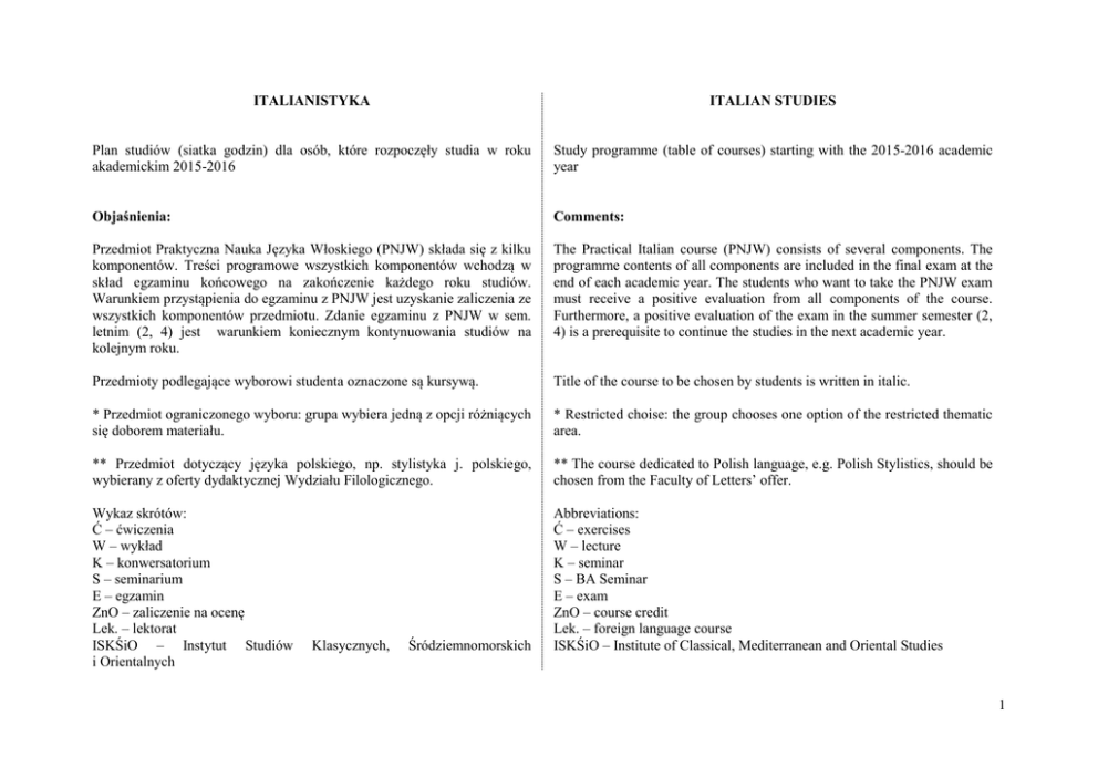 ITALIANISTYKA ITALIAN STUDIES Plan studiów (siatka godzin) dla osób, które rozpoczęły studia w roku akademickim 2015-2016 Study programme (table of courses) starting with the 2015-2016 academic year Objaśnienia: Comments: Przedmiot Praktyczna Nauka Języka Włoskiego (PNJW) składa się z kilku komponentów. Treści programowe wszystkich komponentów wchodzą w skład egzaminu końcowego na zakończenie każdego roku studiów. Warunkiem przystąpienia do egzaminu z PNJW jest uzyskanie zaliczenia ze wszystkich komponentów przedmiotu. Zdanie egzaminu z PNJW w sem. letnim (2, 4) jest warunkiem koniecznym kontynuowania studiów na kolejnym roku. The Practical Italian course (PNJW) consists of several components. The programme contents of all components are included in the final exam at the end of each academic year. The students who want to take the PNJW exam must receive a positive evaluation from all components of the course. Furthermore, a positive evaluation of the exam in the summer semester (2, 4) is a prerequisite to continue the studies in the next academic year. Przedmioty podlegające wyborowi studenta oznaczone są kursywą. Title of the course to be chosen by students is written in italic. * Przedmiot ograniczonego wyboru: grupa wybiera jedną z opcji różniących się doborem materiału. * Restricted choise: the group chooses one option of the restricted thematic area. ** Przedmiot dotyczący języka polskiego, np. stylistyka j. polskiego, wybierany z oferty dydaktycznej Wydziału Filologicznego. ** The course dedicated to Polish language, e.g. Polish Stylistics, should be chosen from the Faculty of Letters’ offer. Wykaz skrótów: Ć – ćwiczenia W – wykład K – konwersatorium S – seminarium E – egzamin ZnO – zaliczenie na ocenę Lek. – lektorat ISKŚiO – Instytut Studiów i Orientalnych Abbreviations: Ć – exercises W – lecture K – seminar S – BA Seminar E – exam ZnO – course credit Lek. – foreign language course ISKŚiO – Institute of Classical, Mediterranean and Oriental Studies Klasycznych, Śródziemnomorskich 1 I rok 1 semestr / I year, semester 1 Przedmiot Moduł PNJW I Typ zajęć Course Title Sprawności zintegrowane A Sprawności zintegrowane B Practical Italian I (modular course) Integrated Skills A Ć Integrated Skills B Ć Tryb uk. ZnO Godzi ny 60 60 ECT S 12 Historia Włoch History of Italy W ZnO 30 3 Gramatyka opisowa języka włoskiego - fonetyka Descriptive Grammar of Italian – Phonetics K ZnO 30 2 Zarys historii literatury włoskiej z elementami teorii literatury Introduction to History of Italian Literature with Elements of Literary Theory W ZnO 30 4 Język łaciński Latin K ZnO 30 2 Wiedza o Włoszech - historia sztuki Italian Studies – History of Art K ZnO 30 3 Wstęp do językoznawstwa Introduction to Linguistics K ZnO 30 2 Przedmiot do wyboru z oferty ISKŚO Course to be chosen from the ISKŚO offer K ZnO 30 2 Razem/Total: 330 30 Typ zajęć Godzi ny ECT S I rok 2 semestr / I year, semester 2 Przedmiot Moduł PNJW I Course Title Sprawności zintegrowane A Sprawności zintegrowane B Practical Italian I (modular course) Integrated Skills A Ć Integrated Skills B Ć Tryb uk. E 60 60 13 Historia Włoch History of Italy W E 30 4 Gramatyka opisowa języka włoskiego - morfologia Descriptive Grammar of Italian – Morphology K ZnO 30 2 Zarys historii literatury włoskiej z elementami teorii literatury Introduction to History of Italian Literature with Elements of Literary Theory W E 30 5 Język łaciński Latin K ZnO 30 2 Wiedza o Włoszech - geografia Italian Studies – Geography K ZnO 30 2 2 Kultura Włoch - warsztaty*: np. Kino włoskie Italian Culture – Workshop*: e.g. Italian Cinema K ZnO 30 2 Razem/Total: 300 30 Typ zajęć Godzi ny ECT S II rok 3 semestr / II year, semester 3 Przedmiot Moduł PNJW II Course Title Sprawności zintegrowane Konwersacje i rozumienie ze słuchu Practical Italian II (modular course) Pisanie Integrated Skills Ć Speaking & Listening Ć Writing Ć Tryb uk. 60 ZnO 30 12 30 Gramatyka opisowa języka włoskiego - składnia Descriptive Grammar of Italian – Syntax K E 30 3 Język łaciński Latin K E 30 3 Przedmiot do wyboru - język polski** Course to be chosen - Polish Language** Ć/K ZnO 30 2 Drugi język romański Second Romance Language lek. ZnO 60 4 Literatura włoska* Italian Literature* K ZnO 30 4 Kultura Włoch - warsztaty*: np. Sztuka kulinarna Italian Culture – Workshop*: e.g. Art of Cuisine K ZnO 30 2 Razem/Total: 330 30 Typ zajęć Godzi ny ECT S II rok 4 semestr / II year, semester 4 Przedmiot Moduł PNJW II Course Title Sprawności zintegrowane Tłumaczenie Practical Italian II (modular course) Pisanie Integrated Skills Ć Translation Ć Writing Ć Tryb uk. 60 E 30 13 30 Język łaciński Latin K ZnO 30 2 Filozofia* Philosophy* K ZnO 30 2 3 Drugi język romański Second Romance Language lek. E 60 5 Literatura włoska* Italian Literature* K ZnO 30 4 Kultura Włoch - warsztaty*: np. Włoski jako język ekspresji artystycznej Italian Culture – Workshop*: e.g. Artistic Expression in Italian K ZnO 30 2 Językoznawstwo*: Metodologia albo Współczesne badania językoznawcze Linguistics*: Methodology of Linguistics or Modern Linguistic Theories K ZnO 30 2 Razem/Total: 330 30 Typ zajęć Godzi ny ECT S III rok 5 semestr / III year, semester 5 Przedmiot Course Title Sprawności zintegrowane Moduł PNJW III Praca z tekstem Tłumaczenie Practical Italian III (modular course) Pisanie Integrated Skills Ć Work with Text Ć Translation Ć Writing Ć Tryb uk. 30 Zno 30 30 10 30 Język łaciński Latin K E 30 3 Drugi język romański Second Romance Language lek. ZnO 60 4 Seminarium licencjackie BA Seminar S ZnO 30 5 Literatura włoska* Italian Literature* K ZnO 30 4 Kultura Włoch – warsztaty* Italian Culture – Workshop* K ZnO 30 2 Podstawy przedsiębiorczości Introduction to business management e-learning E 15 2 Razem/Total: 315 30 Typ zajęć Godzi ny ECT S III rok 6 semest