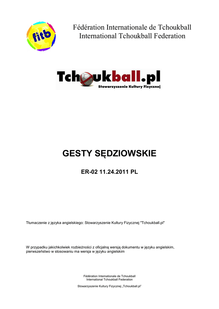 Fédération Internationale de Tchoukball International Tchoukball Federation GESTY SĘDZIOWSKIE ER-02 11.24.2011 PL Tłumaczenie z języka angielskiego: Stowarzyszenie Kultury Fizycznej "Tchoukball.pl" W przypadku jakichkolwiek rozbieżności z oficjalną wersją dokumentu w języku angielskim, pierwszeństwo w stosowaniu ma wersja w języku angielskim Fédération Internationale de Tchoukball International Tchoukball Federation Stowarzyszenie Kultury Fizycznej „Tchoukball.pl” FITB-PRC GESTY SĘDZIOWSKIE GESTY SĘDZIOWSKIE Słowo wstępne 1 Niniejszy dokument jest zasadniczym dodatkiem do oficjalnych przepisów gry w tchoukball , wydanych przez Międzynarodową Federację Tchoukballu (FITB). Definiuje on gesty stosowane przez sędziów w celu sygnalizacji podejmowanych przez nich decyzji zawodnikom, trenerom oraz publiczności. Aby przezwyciężyć bariery językowe i uniknąć rozwlekłych wyjaśnień, sędzia musi używać wyraźnie widocznych gestów (opisanych poniżej) ilustrujących jego decyzje. Gesty sędziowskie powinny być pokazywane przez co najmniej 3 sekundy, tak aby każdy mógł je zobaczyć i zrozumieć. Sędzia musi także wskazać miejsce, z którego powinna zostać wznowiona gra po błędzie. Aby nie zwalniać tempa gry, zalecana jest natępująca kolejność: gwizdek, pokazanie gestu odpowiadającego przewinieniu zawodnika – przez ok. 1 sekundę; wskazanie miejsca, z którego powinna zostać wznowiona gra – przez ok. 1 sekundę; ponowne pokazanie gestu odpowiadającego przewinieniu zawodnika – do momentu wznowienia gry. Po zdobyciu punktu przez jedną z drużyn, odpowiedni gest powinien być utrzymywany do momentu wznowienia gry, tak aby przedstawiciele obsługujący stanowisko sędziowskie (odpowiadający za pomiar czasu gry oraz liczenie punktów) mogli odnotować decyzję sędziego. Sędziowie muszą być stale przygotowani do użycia gwizdka oraz pokazania odpowiedniego gestu wymagającego zastosowania obu rąk. W rezultacie, gwizdek powinien być nieprzerwanie trzymany w ustach w czasie trwania gry, nawet jeżeli akcja toczy się po przeciwnej stronie boiska lub w pobliżu jego środka. Istotne jest, aby gwizdać głośno, jednocześnie dostosowując siłę i poziom dźwięku gwizdka do otoczenia i sytuacji. Ważne jest pamiętanie o tym, że sędziowie nie gwiżdżą jedynie dla zawodników znajdujących się w ich pobliżu. Gwizdek jest przeznaczony dla wszystkich zawodników, sędziów, stanowiska sędziowskiego oraz publiczności. Czysty i słyszalny dźwięk jest zatem wymagany przez cały czas gry. Sędziowie muszą używać gwizdka i pokazywać gesty odpowiadające wszystkim zdefiniowanym sytuacjom, błędom gry i przewinieniom, nawet tym najbardziej oczywistym. 1 ER-01 The Official Tchoukball Rules (Tchoukball. Oficjalne przepisy gry). ER-02_V2_OfficialTchoukballRefereeHandSignal_pl.pdf 2 FITB-PRC GESTY SĘDZIOWSKIE Gesty sędziowskie 1. Nieprawidłowa zmiana (zasady 4.2.4 i 4.2.5) Dłonie otwarte, palce ułożone wzdłuż przedramion. Przedramiona poruszane naprzemiennie w górę i w dół, prostopadle do klatki piersiowej, naśladując wejście na boisko i jego opuszczenie przez zawodników dokonujących zmiany. 2. Czas (zasada 6.2.2) Dłonie otwarte, palce ułożone wzdłuż przedramion. Obie dłonie ponad głową tworzą kształt litery „T” (ang. ‘timeout’). 3. Koniec czasu gry (zasada 6.3) Przedramiona skrzyżowane przed klatką piersiową. Dłonie otwarte, palce ułożone wzdłuż przedramion. 4. Dotknięcie piłki nogą poniżej kolana (zasada 7.1.1) Jedna noga zgięta w kolanie ku górze, udo równolegle do podłoża, przeciwległa ręka dotyka łydki. ER-02_V2_OfficialTchoukballRefereeHandSignal_pl.pdf 3 FITB-PRC GESTY SĘDZIOWSKIE 5. Kroki (zasada 7.1.2) Dłonie otwarte, palce ułożone wzdłuż przedramion. Przedramiona poziomo na wysokości klatki piersiowej, obracają się wokół siebie ruchem okrężnym. 6. Przetrzymanie piłki ponad 3 sekundy (zasada 7.1.3) Jedna ręka uniesiona w górę, wyciągnięty kciuk, palec wskazujący i środkowy. Palce serdeczny i mały schowane. Druga ręka trzyma pierwszą za nadgarstek. 7. Powyżej 3 kolejnych podań (zasada 7.1.4) Jedna ręka uniesiona w górę, wyciągnięty kciuk, palec wskazujący i środkowy. Palce serdeczny i mały schowane. 8. Poza polem gry (zasada 7.1.5) Dłonie otwarte, palce ułożone wzdłuż przedramion ustawionych pionowo na wysokości barków. Wewnętrzna część dłoni skierowana za siebie, poza pole gry. Ręce i ramiona poruszają się równocześnie w przód i w tył (trzykrotnie). ER-02_V2_OfficialTchoukballRefereeHandSignal_pl.pdf 4 FITB-PRC GESTY SĘDZIOWSKIE 9. Faul (zasady 7.1.7, 7.1.8 i 7.1.9) Ręce oparte na biodrach wykonują nieznaczne ruchy do i od bioder. 10. Czwarty strzał na bramkę (zasada 7.1.10) Jedna ręka uniesiona w górę, 4 palce wyciągnięte i rozchylone, kciuk schowany. 11. Nastąpienie na linię pola bramkowego (zasada 7.1.11) Jedna ręka wyciągnięta, wskazuje na miejsce popełnienia błędu wszystkimi palcami, wewnętrzna część dłoni skierowana ku dołowi. Druga dłoń nakrywa nadgarstek ręki wskazującej miejsce popełnienia przewinienia. 12. Lądowanie (zasada 7.1.12) Jedna ręka wyciągnięta do przodu z wewnętrzną częścią dłoni skierowaną ku dołowi. Druga dłoń otwarta, skierowana ku dołowi, wykonuje ruch falujący w przód i tył pod odpowiednim kątem nad pierwszą ręką. ER-02_V2_OfficialTchoukballRefereeHandSignal_pl.pdf 5 FITB-PRC GESTY SĘDZIOWSKIE 13. Strzał przed przekroczeniem przez piłkę linii środkowej (zasada 7.1.13) Obie ręce wyciągnięte w przód z otwartymi dłońmi i końcami palców wskazującymi na podłoże, poruszane poziomo w przeciwnych kierunkach. 14. Wskazanie miejsca popełnienia błędu lub wznowienia gry po błędzie (zasady 7.2.1 i 7.2.3 (w nieprawidłowym miejscu)) Jedna ręka wyciągnięta, z wewnętrzną częścią dłoni skierowaną ku górze, wskazuje miejsce popełnie