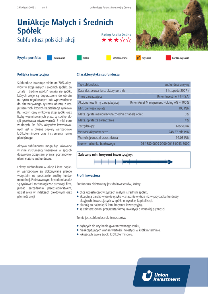 29 kwietnia 2016 r. str. 1 UniFundusze Fundusz Inwestycyjny Otwarty UniAkcje Małych i Średnich Spółek Subfundusz polskich akcji Ryzyko portfela: minimalne Polityka inwestycyjna Subfundusz inwestuje minimum 70% aktywów w akcje małych i średnich spółek. Za „małe i średnie spółki” uważa się spółki, których akcje są dopuszczone do obrotu na rynku regulowanym lub wprowadzone do alternatywnego systemu obrotu, z wyjątkiem tych, których kapitalizacja rynkowa (tj. iloczyn ceny rynkowej akcji spółki oraz liczby wyemitowanych przez tę spółkę akcji) przekracza równowartość 5 mld euro w złotych. Do 30% aktywów inwestowanych jest w dłużne papiery wartościowe krótkoterminowe oraz instrumenty rynku pieniężnego. Aktywa subfunduszu mogą być lokowane w inne instrumenty finansowe w sposób dozwolony przepisami prawa i postanowieniami statutu subfunduszu. Lokaty subfunduszu w akcje i inne papiery wartościowe są dokonywane przede wszystkim na podstawie analizy fundamentalnej. Podstawowymi kryteriami analiz są rynkowe i technologiczne przewagi firm, jakość zarządzania przedsiębiorstwem, udział akcji w indeksach giełdowych oraz płynność akcji. niskie umiarkowane wysokie bardzo wysokie Charakterystyka subfunduszu Typ subfunduszu subfundusz akcyjny Data dostosowania struktury portfela 1 listopada 2007 r. Firma zarządzająca Union Investment TFI S.A. Akcjonariusz firmy zarządzającej Union Asset Management Holding AG – 100% Min. pierwsza wpłata 100 PLN Maks. opłata manipulacyjna zgodnie z tabelą opłat 5% Maks. opłata za zarządzanie 4% Zarządzający Maciej Kik Wartość aktywów netto 248,57 mln PLN Wartość jednostki uczestnictwa 94,03 PLN Numer rachunku bankowego 26 1880 0009 0000 0013 0053 5000 Zalecany min. horyzont inwestycyjny: 5 lat Profil inwestora Subfundusz skierowany jest do inwestorów, którzy: •chcą uczestniczyć w zyskach małych i średnich spółek, •akceptują bardzo wysokie ryzyko – znacznie wyższe niż w przypadku funduszy akcyjnych, inwestujących w spółki o wysokiej kapitalizacji, •planują co najmniej 5-letni horyzont inwestycyjny, •są zainteresowani przejrzystą formą inwestycji o wysokiej płynności. To nie jest subfundusz dla inwestorów: • dążących do uzyskania gwarantowanego zysku, • nieakceptujących wahań wartości inwestycji w krótkim terminie, • lokujących swoje środki krótkoterminowo. 29 kwietnia 2016 r. str. 2 UniFundusze Fundusz Inwestycyjny Otwarty UniAkcje Małych i Średnich Spółek Subfundusz polskich akcji Ryzyko portfela: minimalne niskie umiarkowane wysokie bardzo wysokie Wyniki inwestycyjne subfunduszu i benchmarku* 1m 3m 6m 1 rok 2 lata 5 lat 10 lat UniAkcje Małych i Średnich Spółek (%) 2,17 10,51 -0,18 -5,11 Benchmark (%) 0,73 8,21 -0,40 -2,73 4,30 4,02 – 6,65 11,69 – Różnica 1,45 2,30 0,22 -2,37 -2,35 -7,68 – Sie ’14 Lut ’15 * Stopy zwrotu subfunduszu i benchmarku obliczane są na podstawie ostatnich dni roboczych miesiąca. Zmiana wartości jednostki w porównaniu z benchmarkiem UniAkcje Małych i Średnich Spółek Benchmark UniAkcje Małych i Średnich Spółek 116 106 96 86 76 66 Kwi ’11 Lis ’11 Cze ’12 Gru ’12 Lip ’13 Sty ’14 Alokacja aktywów Wrz ’15 Kwi ’16 Benchmark1 Akcje i inne instrumenty udziałowe 100,00% 0 20 40 60 80 100 45% mWIG40 + 45% sWIG80 + 10% WIBID 1M ustalony 2 dni robocze przed ostatnim dniem roboczym poprzedniego miesiąca ¹ Wzorcowy portfel, który stanowi punkt odniesienia do dokonywania oceny wyników zarządzania aktywami funduszu. 29 kwietnia 2016 r. str. 3 UniFundusze Fundusz Inwestycyjny Otwarty UniAkcje Małych i Średnich Spółek Subfundusz polskich akcji Ryzyko portfela: minimalne niskie umiarkowane Alokacja sektorowa portfela akcyjnego Finanse 15,42% Usługi 13,85% Przemysł 32,56% Technologie 9,12% Ochrona zdrowia 7,01% Surowce 6,48% Struktura walutowa PLN TRY 93,04% 6,96% 20 Współczynniki ryzyka 12 m Beta do benchmarku 1,12 Beta do WIG 0,79 Information ratio -0,72 Tracking error 0,03 Współczynnik Sharpe’a -0,54 Odchylenie standardowe 12,16% bardzo wysokie Słowniczek Dobra konsumpcyjne 15,56% 0 wysokie 40 60 80 100 Beta do benchmarku – współczynnik ten pokazuje zależność pomiędzy zmianami wartości jednostki funduszu a benchmarku. Wskaźnik beta wynoszący 1 oznacza, że zmiany wartości jednostki funduszu są takie same jak benchmarku, co sugeruje, że skład instrumentów funduszu jest tożsamy ze składem instrumentów w benchmarku. Beta o wartości mniejszej niż 1 oznacza, że wzrost (spadek) benchmarku o 1% jest zazwyczaj powiązany ze wzrostem (spadkiem) wartości jednostki funduszu o mniej niż 1%. Wartość beta większa niż 1 oznacza, że wzrost (spadek) benchmarku o 1% jest zazwyczaj powiązany ze wzrostem (spadkiem) wartości jednostki funduszu o więcej niż 1%. Beta do WIG – współczynnik ten pokazuje zależność pomiędzy zmianami wartości jednostki funduszu a zmianami indeksu WIG. Wskaźnik beta wynoszący 1 oznacza, że zmiany wartości jednostki funduszu są takie same jak indeksu WIG. Beta o wartości mniejszej niż 1 oznacza, że wzrost (spadek) benchmarku o 1% jest zazwyczaj powiązany ze wzrostem (spadkiem) wartości indeksu WIG o mniej niż 1%. Wartość beta większa niż 1 oznacza, że wzrost (spadek) indeksu WIG o 1% jest zazwyczaj powiązany ze wzrostem (spadkiem) wartości jednostki funduszu o więcej niż 1%. Information ratio – współczynnik ten pokazuje, jak opłacalne jest ryzyko, jakie ponosi fundusz w stosunku do swojego benchmarku. Im wyższy poziom wskaźnika information ratio, tym przy niższym nakładzie ryzyka w stosunku do benchmarku został osiągnięty wynik funduszu. Fundusz, który osiąga information ratio powyżej 0,3, uważany jest za efektywnie zarządzany. Tracking error – współczynnik ten pokazuje, jak ryzykowny jest dany fundusz w stosunku do swojego benchmarku. Im wyższy wskaźnik, tym bardziej agresywnie zarządzany jest