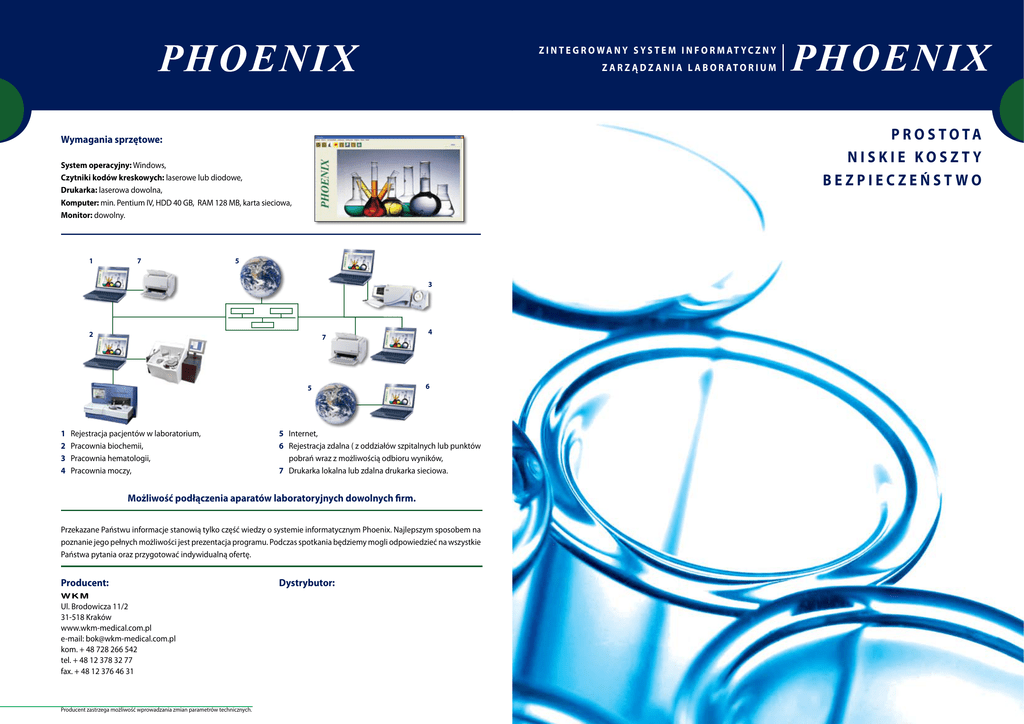 Z I N T E G R O WA N Y S Y S T E M I N F O R M AT Y C Z N Y Z A R Z Ą D Z A N I A L A B O R AT O R I U M P R O S TOTA NISKIE KOSZTY BEZPIECZEŃSTWO Wymagania sprzętowe: System operacyjny: Windows, Czytniki kodów kreskowych: laserowe lub diodowe, Drukarka: laserowa dowolna, Komputer: min. Pentium IV, HDD 40 GB, RAM 128 MB, karta sieciowa, Monitor: dowolny. 1 7 5 3 2 7 5 1 2 3 4 Rejestracja pacjentów w laboratorium, Pracownia biochemii, Pracownia hematologii, Pracownia moczy, 4 6 5 Internet, 6 Rejestracja zdalna ( z oddziałów szpitalnych lub punktów pobrań wraz z możliwością odbioru wyników, 7 Drukarka lokalna lub zdalna drukarka sieciowa. Możliwość podłączenia aparatów laboratoryjnych dowolnych firm. Przekazane Państwu informacje stanowią tylko część wiedzy o systemie informatycznym Phoenix. Najlepszym sposobem na poznanie jego pełnych możliwości jest prezentacja programu. Podczas spotkania będziemy mogli odpowiedzieć na wszystkie Państwa pytania oraz przygotować indywidualną ofertę. Producent: WK M Ul. Brodowicza 11/2 31-518 Kraków www.wkm-medical.com.pl e-mail: [email protected] kom. + 48 728 266 542 tel. + 48 12 378 32 77 fax. + 48 12 376 46 31 Producent zastrzega możliwość wprowadzania zmian parametrów technicznych. Dystrybutor: N O WA , L E P S Z A N asze rozwiązania ORGANIZACJA PRACY są dostosowane do T woic h potrzeb LISTA DOSTĘPNYCH FUNKCJI: Phoenix jest oprogramowaniem wspomagającym pracę laboratorium analitycznego. System stanowi jednostkę centralną, scalającą wszystkie czynności wykonywane w laboratorium. Pełną automatyzację pracy uzyskano dzięki zastosowaniu systemu kodów kreskowych do oznaczenia badań i probówek z materiałem badanym oraz płynnej współpracy z urządzeniami laboratoryjnymi. OBSŁUGA PRACOWNI SPECJALISTYCZNYCH REJESTRACJA • kartotek pacjentów oraz informacji o badaniach do wykonania (obsługa kodów kreskowych zleceń), • zdalna np. punkty pobrań: szpitale, przychodnie, Analityka • Serologia • Mikrobiologia • • poprzez komunikację z innymi systemami informatycznymi, • badań do kontroli jakości. PRACOWNIA ANALITYCZNA • praca z kilkoma pracowniami jednocześnie na jednym komputerze, • pobieranie danych z aparatów jednokierunkowych, • programowanie aparatów z listą roboczą, SUKCES SYSTEMU: • automatyzacja badań, • współpraca z wieloma aparatami jednocześnie, • manualne wprowadzanie wyników badań, • walidacja wyników z uwzględnieniem wieku i płci, • kody kreskowe, • znakowanie wyników poza zakresem dopuszczalnym, • kontrola jakości, • wydruk pojedynczych wyników, • rozliczenia finansowe, • markowanie wyników do wydruków seryjnych, • raporty zbiorcze, • wydruk seryjny wyników, • prosta obsługa, • zatwierdzanie badań do wydruków zbiorczych, • bezpieczeństwo danych, • współpraca z urządzeniami laboratoryjnymi, i diagnostycznymi. • funkcja Delta-Check. WYDRUK I RAPORTY • dzienny z podziałem na pracownię, badanie, kontrahenta, lekarza zlecającego, • rozliczenia ilościowe, wartościowe, ilościowowartościowe z podziałem na lekarzy i kontrahentów. • współpraca z Excel-em. KONTROLA JAKOŚCI • dokładność i powtarzalność, • analizy (Westgarda, wykresy Levey – Jenningsa), • dokumentowanie procedur naprawczych. FAKTURY • faktury dla osób fizycznych przy rejestracji, • faktury dla jednostek kierujących za dowolnie wybrany okres, • korekty faktur, • indywidualne rabaty dla pojedynczych pozycji faktury. 2 Stawiamy na jakość • WK M Stawiamy na jakość • WK M 3