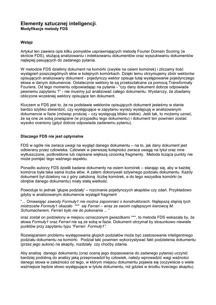 Elementy sztucznej inteligencji. Modyfikacje metody FDS Wstęp Artykuł ten zawiera opis kilku pomysłów usprawniających metodę Fourier Domain Scoring (w skrócie FDS), służącą analizowaniu i indeksowaniu dokumentów oraz wyszukiwaniu dokumentów najlepiej pasujących do zadanego pytania. W metodzie FDS dzielimy dokument na komórki (zwykle na osiem komórek) i zliczamy ilość wystąpień poszczególnych słów w kolejnych komórkach. Dzięki temu otrzymujemy zbiór wektorów opisujących analizowany dokument - pojedynczy wektor opisuje tutaj występowanie pojedynczego słowa w danym dokumencie. Ostatecznie wektory te są przekształcane za pomocą Transformaty Fouriera. Od tego momentu odpowiadając na pytanie - “czy dany dokument dobrze odpowiada pewnemu zapytaniu ?” - nie musimy już analizować całego dokumentu. Wystarczy, że zbadamy obliczone wcześniej wektory opisujące ten dokument. Kluczem w FDS jest to, że na podstawie wektorów opisujących dokument jesteśmy w stanie bardzo szybko stwierdzić, czy występujące w zapytaniu wyrazy występują w analizowanym dokumencie w fazie (mówiąc prościej – czy występują blisko siebie). Jeśli tak, to możemy uznać, że są one ze sobą powiązane (w przypadku tego dokumentu) i dokument ten powinien zostać wysoko oceniony (gdyż dobrze odpowiada zadanemu pytaniu). Dlaczego FDS nie jest optymalne FDS w ogóle nie zwraca uwagi na wygląd danego dokumentu – na to, jak dany dokument jest odbierany przez człowieka. Człowiek w pierwszej kolejności zwraca uwagę na tytuł oraz inne wytłuszczone, podkreślone lub napisane większą czcionką fragmenty. Metoda licząca punkty nie może pomijać tego ważnego aspektu. Ponadto autorzy FDS dzielili badane dokumenty na osiem komórek – starając się, aby w każdej komórce była taka sama liczba słów. A zatem dokonywali sztywnego podziału dokumentu. Każdy dokument był dzielony na z góry założoną liczbę komórek, a do tego wszystkie komórki (w obrębie danego dokumentu) miały stałą wielkość. Powoduje to jednak 'głupie podziały' – rozcinanie pojedynczych akapitów czy zdań. Przykładowo gdyby w analizowanym dokumencie wystąpił fragment “... Omawiając zawody Formuły1 nie można zapomnieć o konstruktorach. Najlepszą stajnią tych mistrzostw Formuły1 okazało *** się Ferrari – wraz ze swoim najlepszym kierowcą M. Schumacherem, Ferrari było nie do pokonania ... ” oraz został on podzielony w miejscu oznaczonym gwiazdkami ***, to metoda FDS wskazała by, że słowa Formuły1 oraz Ferrari nie są ze sobą w fazie. Dokument otrzymał by stosunkowo niewiele punktów przy zapytaniu typu “Ferrari Formuły1”. Rozwiązaniem problemu występowania głupich podziałów może być zastosowanie inteligentnego podziału dokumentu na komórki. Podział taki powinien wykorzystywać fakt podzielenia dokumentu (przez jego autora) na akapity, rozdziały czy choćby zdania. Aby analizę danego dokumentu (oraz ocenę jego dopasowania do zadanego pytania) uczynić bardziej podobną do analizy jaką przeprowadził by człowiek, należy wprowadzić wagi ważności danego słowa w zależności od tego, w którym miejscu dokumentu pojawia się (oczywiście o wiele ważniejsze będzie słowo występujące w tytule dokumentu, niż gdzieś w środku trzeciego akapitu). W tym momencie należy zwrócić uwagę na to, że zastosowanie inteligentnego podziału oraz zróżnicowanego punktowania słów nie wpłynie negatywnie na szybkość działania metody. Jedyne dodatkowe obciążenie wystąpi na etapie analizy dokumentu – jednak jest ona wykonywana tylko raz, a ponadto nie jest zbyt istotne jak szybko przebiega. W momencie odpowiadania na pytanie użytkownika (czyli wtedy, gdy liczy się czas) metoda FDS z inteligentnym podziałem działa tak samo szybko jak zwykłe FDS. Jak dzielić, aby było dobrze Po pierwsze wykorzystywać podział dokumentu na akapity i zdania. Czyli unikać głupich podziałów. Należy zwracać uwagę na występowanie w dokumencie: – pustych linii – wcięć (czasem tak oznaczamy początek akapitu) – kropek (możliwe wykrycie podziału na zdania) – przecinków i myślników (być może okażą się przydatne...) Warto jest także rozpoznawać zdania wyraźnie oddzielone od reszty i zapisane w widoczny sposób (podkreślenie, wytłuszczenie, większa czcionka, kursywa, ...). Prawdopodobnie są to tytuły (możemy rozpoznać tytuł całego dokumentu, oraz tytuły poszczególnych części). Tytuł powinien być analizowany albo jako osobna komórka (mała, ale ważna), albo razem z fragmentem, który po nim następuje. Prawdopodobnie nie należy określać tego na stałe, a w zależności od konkretnego dokumentu. Przykładowo gdy tytuł poprzedza długi fragment tekstu (podzielony na np. 5 innych komórek) to powinien być potraktowany jako osobna komórka. Gdy jednak tytuł poprzedza krótki fragment tekstu, to może warto połączyć go razem z tym tekstem w jednej komórce. Co do ilości komórek na jakie należy starać się podzielić każdy dokument, to myślę, że najlepiej było by uzyskiwać wyniki w okolicach 8. A zatem większość dokumentów (powiedzmy o rozmiarach jednej czy dwóch stron) była by dzielona na mniej więcej 4 do 15 komórek. Zakładam, że istniały by jednak dokumenty dzielone nawet na 30 komórek – gdyby dotyczyło to jakiegoś długiego (np. dziesięć stron) dokumentu, w którym taki podział wynikał by wprost z zastosowanych w nim akapitów. Należy także zauważyć, że po wprowadzeniu inteligentnego dzielenia, różne komórki będą miały różną długość (w standardowym FDS wszystkie osiem komórek miało porównywalną długość – przynajmniej biorąc pod uwagę ilość wyrazów w poszczególnych komórkach). Myślę jednak, że należy się starać, aby komórki miały w obrębie jednego dokumentu podobną długość (tzn. największa komórka nie powinna być więcej niż trzy raz