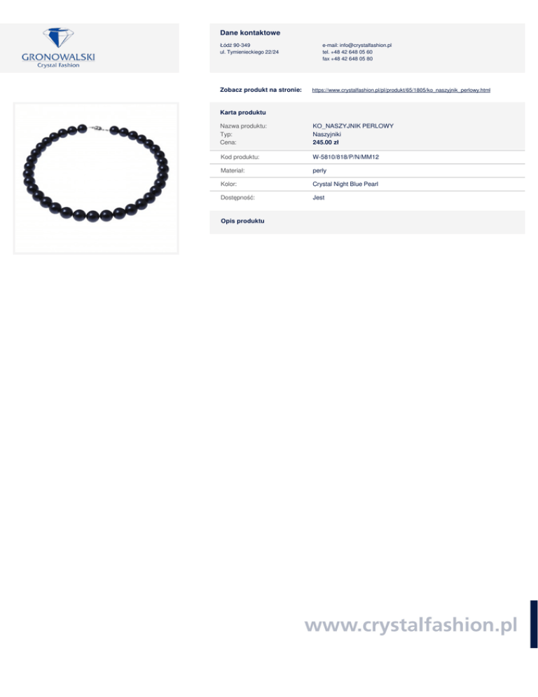 Powered by TCPDF (www.tcpdf.org) Dane kontaktowe Łódź 90-349 ul. Tymienieckiego 22/24 Zobacz produkt na stronie: e-mail: [email protected] tel. +48 42 648 05 60 fax +48 42 648 05 80 https://www.crystalfashion.pl/pl/produkt/65/1805/ko_naszyjnik_perlowy.html Karta produktu Nazwa produktu: Typ: Cena: KO_NASZYJNIK PERLOWY Naszyjniki 245.00 zł Kod produktu: W-5810/818/P/N/MM12 Materiał: perły Kolor: Crystal Night Blue Pearl Dostępność: Jest Opis produktu