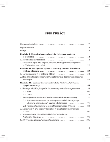 Spis treści Oznaczenie skrótów . . . . . . . . . . . . . . . . . . . . . . . . . . . . . . . . . . . . . . . . . 7 Wprowadzenie ����������������������������������������������������������������������������������������� 9 Wstęp ������������������������������������������������������������������������������������������������������� 12 Rozdział I. Historia dawnego kościoła i klasztoru cysterek w Chełmnie ����������������������������������������������������������������������������������������� 14 1. Historia i dzieje klasztoru �������������������������������������������������������������������� 14 2. Malowidła fryzu nad emporą zakonną dawnego kościoła cysterek w Chełmnie – stan badań �������������������������������������������������������������������� 22 Rozdział II. Per signa ad signata – klasztory, obrazy, ich miejsce i rola za klauzurą ������������������������������������������������������������������������������� 29 1. Cura mulierum w 1. połowie XIII w. ���������������������������������������������������� 34 2. Rola przedstawień obrazowych w kształtowaniu duchowości środowisk zakonnych �������������������������������������������������������������������������������������������� 42 Rozdział III. Systemy ilustrowania tekstu Pieśni nad pieśniami i jego komentarzy ������������������������������������������������������������������������������ 54 1. Ilustracje inicjałów, incipitów i komentarzy do Pieśni nad pieśniami ������ 54 1.1. Tekst ��������������������������������������������������������������������������������������������� 62 1.2. Obraz �������������������������������������������������������������������������������������������� 70 2. Ilustracje tekstu Pieśni nad pieśniami w Biblii Moralizowanej ��������� 71 2.1. Początek formowania się cyklu przedstawień obrazującego „historię oblubieńców” według tekstu księgi ����������������������������� 71 2.2. Pieśń nad pieśniami w Biblii Moralizowanej. Wnioski �������������� 88 3. Malowidła w tzw. kaplicy biskupiej w klasztorze benedyktynek w Göss ������������������������������������������������������������������������������������������������� 91 4. Przedstawienia „historii oblubieńców” w kodeksie Rothschild Canticles ���������������������������������������������������������������������������� 95 5. XV-wieczna edycja Pieśni nad pieśniami ������������������������������������������� 106 Spis treści Rozdział IV. Przedstawienia fryzu nad emporą zakonną w dawnym kościele cysterek w Chełmnie ��������������������������������������� 1. Sceny cyklu dziejów oblubieńców ������������������������������������������������������ 1.1. Identyfikacja tematów przedstawień ������������������������������������������� 1.2. Interpretacja treści programu ������������������������������������������������������ 2. Sceny cyklu pasyjnego i ich kontekst artystyczny ������������������������������ 3. Wzajemna relacja obu cyklów przedstawień ������������������������������������� Rozdział V. Miejsce cyklu chełmińskiego na tle współczesnych mu dzieł malarskich z obszarów Nadrenii, Niderlandów