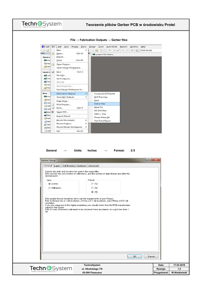 Tworzenie plików Gerber PCB w środowisku Protel File → Fabrication Outputs → Gerber files General → Units: Inches → Format: 2:5 TechnoSystem Data: ul. Okulickiego 7/9 Rewizja: 17.03.2016 1.0 05-500 Piaseczno Przygotował: W.Niedźwiedź Tworzenie plików Gerber PCB w środowisku Protel Layers Drill Drawing Plot Layers → All On Drill Drawing symbols Graphic symbols TechnoSystem Data: ul. Okulickiego 7/9 Rewizja: 17.03.2016 1.0 05-500 Piaseczno Przygotował: W.Niedźwiedź Tworzenie plików Gerber PCB w środowisku Protel Apertures Embedded apertures (RS274x) Advanced Leading / Trailing Zeros: Keep leading and trailing zeros Position on Film: Reference to relative origin Plotter Type: Unsorted (raster) Optimize change location commands Generate DRC Rules export file (RUL) → OK TechnoSystem Data: ul. Okulickiego 7/9 Rewizja: 17.03.2016 1.0 05-500 Piaseczno Przygotował: W.Niedźwiedź Tworzenie plików Gerber PCB w środowisku Protel Pliki wierceń File→ Fabrication Outputs→ NC Drill Files NC Drill Setup Options: Units: Inches Format: 2:3 Leading / Trailing Zeros: Coordinate Positions: Other: Keep leading and trailing zeros Reference to relative origin Optimize change location commands → OK Pliki zostały zapisane w katalogu, w którym znajdował się projekt PCB. TechnoSystem Data: ul. Okulickiego 7/9 Rewizja: 1.0 05-500 Piaseczno Przygotował: W.Niedźwiedź 17.03.2016