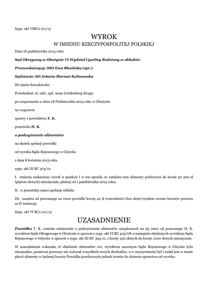 Sygn. akt VIRCa 211/13 WYROK W IMIENIU RZECZYPOSPOLITEJ POLSKIEJ Dnia 18 października 2013 roku Sąd Okręgowy w Olsztynie VI Wydział Cywilny Rodzinny w składzie: Przewodniczący: SSO Ewa Błesińska (spr.) Sędziowie: SO Jolanta Biernat-Kalinowska SO Aneta Szwedowska Protokolant: st. sekr. sąd. Anna Greifenberg-Krupa po rozpoznaniu w dniu 18 Października 2013 roku w Olsztynie na rozprawie sprawy z powództwa T. K. przeciwko H. K. o podwyższenie alimentów na skutek apelacji powódki od wyroku Sądu Rejonowego w Giżycku z dnia 8 kwietnia 2013 roku sygn. akt III RC 374/12 I. zmienia zaskarżony wyrok w punkcie I w ten sposób, że ustalone tam alimenty podwyższa do kwoty po 500 zł (pięćset złotych) miesięcznie, płatnej od 1 października 2013 roku; II. w pozostałej części apelację oddala; III. zasądza od pozwanego na rzecz powódki kwotę 42 zł (czterdzieści dwa złote) tytułem zwrotu kosztów procesu za II instancję. Sygn. akt VI RCa 211/13 UZASADNIENIE Powódka T. K. wniosła ostatecznie o podwyższenie alimentów zasądzonych na jej rzecz od pozwanego H. K. wyrokiem Sądu Okręgowego w Olsztynie w sprawie o sygn. akt VI RC 405/08, a następnie obniżonych wyrokiem Sądu Rejonowego w Giżycku w sprawie o sygn. akt III RC 393/11, z kwoty 250 złotych do kwoty 1000 złotych miesięcznie. W uzasadnieniu wskazała, iż obniżenie alimentów ww. wyrokiem zaocznym Sądu Rejonowego w Giżycku było niezasadne, ponieważ pozwany nie wykazał wszystkich swoich dochodów, a w rzeczywistości był i nadal jest w stanie płacić alimenty w żądanej kwocie Powódka przekroczyła jednak termin do złożenia sprzeciwu od wyroku. Pozwany H. K. wniósł o oddalenie powództwa. Wskazał, iż jest na rencie w kwocie 713 złotych. Jest całkowicie niezdolny do pracy. Powódka korzysta z jego domu i chlewa i nic za to nie płaci. Wyrokiem z dnia 8 kwietnia 2013 r. wydanym w sprawie o sygn. akt III RC 374/12 Sąd Rejonowy w Giżycku podwyższył alimenty zasądzone od pozwanego na rzecz powódki ww. wyrokiem Sądu Rejonowego w Giżycku z kwoty 250 złotych miesięcznie do kwoty 350 złotych miesięcznie, płatne z góry do 10. dnia każdego miesiąca, z ustawowymi odsetkami w przypadku zwłoki w terminie płatności każdej z rat, poczynając od 1 września 2012 r. (punkt I), w pozostałym zakresie powództwo zaś oddalił (punkt II) oraz zwolnił pozwanego od opłaty, od której powódka była zwolniona (punkt III). Wyrokowi w punkcie I nadał rygor natychmiastowej wykonalności (punkt IV) Sąd Rejonowy ustalił, iż T. K. i H. K. byli małżeństwem od 18 lutego 1984 r. do 8 grudnia 2009 r. Wyrokiem Sądu Okręgowego w Olsztynie z dnia 29 czerwca 2009 r. w sprawie o sygn. akt VI RC 405/08 orzeczono rozwód pomiędzy stronami z winy H. K.. Zasądzono też alimenty na rzecz T. K. w kwocie 500 złotych miesięcznie. Z małżeństwa strony posiadają troje dorosłych dzieci. Prawomocnym wyrokiem zaocznym z dnia 15 listopada 2011 r. w sprawie o sygn. akt III RC 393/11 Sąd Rejonowy w Giżycku obniżył zasądzone alimenty do kwoty 250 złotych. H. K. otrzymywał wówczas rentę w kwocie 540 złotych. Był właścicielem nieruchomości o powierzchni 25 ha, którą użytkowała T. K. wypasając na niej bydło. T. K. mieszka w domu stanowiącym własność H. K. wraz z córką, wnuczką i zięciem. Z pozwanym łączy ją w tym zakresie umowa użyczenia powstała jeszcze w czasie małżeństwa. Umowa ta mimo zmiany charakteru stosunków między stronami nie została rozwiązana. T. K. nie jest zobowiązana do płacenia za korzystanie z przedmiotu umowy. Winna uiszczać koszty związane ze zwykłym utrzymaniem użyczonej rzeczy. W wyniku podziału majątku dorobkowego małżonków T. K. otrzymała około 4 ha ziemi, które aktualnie uprawia, korzysta też z nieruchomości pozwanego wypasając na nich zwierzęta. Hoduje kilka sztuk bydła, jednak nie posiada dochodów ze sprzedaży mleka. W ubiegłym roku sprzedała dwie sztuki bydła, za które otrzymała kwotę 1.500 złotych. Z tytułu dopłat w 2012 r. pozyskała 707 złotych. Ponosi koszty prądu w kwocie 100 złotych, gazu w kwocie 120 złotych. Pomaga córce, która uczy się, a koszt szkoły i dojazdu do niej wynosi 200 złotych miesięcznie. H. K. jest osobą całkowicie niezdolną do pracy w gospodarstwie rolnym do listopada 2013 r. Otrzymuje rentę w kwocie 713,52 złotych. Miesięczny koszt leczenia wynosi 200 złotych. Jest właścicielem nieruchomości o powierzchni około 22 ha, jednak ziemi nie uprawia, wydzierżawił ją, zaprzestając działalności w związku z rentą. Jest właścicielem siedliska, w którym mieszka powódka, sam wynajmuje stancję, za którą płaci 500 złotych miesięcznie. Sąd Rejonowy wskazał, iż na skutek rozpadu rodziny stron nastąpiło znaczne pogorszenie sytuacji materialnej T. K., choć nie znajduje się ona w niedostatku. Alimenty od pozwanego w kwocie 250 złotych miesięcznie przy dzisiejszych cenach, w małym stopniu wystarczą na pokrycie usprawiedliwionych potrzeb. Nie można przy tym zarzucić powódce, że niewłaściwie wykorzystuje swoje możliwości zarobkowe. Prowadzi małe gospodarstwo rolne i z niego czerpie wprawdzie niewielkie jednak stałe dochody. Sąd podkreślił, iż powódka żądając alimentów w kwocie 500 złotych wskazała na wzrost kosztów utrzymania nie tylko siebie, ale też córki i zięcia, którzy wraz z nią zamieszkują korzystając z prądu, gazu i innych mediów. Do kosztów utrzymania powódki nie należy też koszt ubezpieczenia córki i wnuczki. H. K. jest właścicielem nieruchomości położonej w obrębie R. o powierzchni 18,2218 ha. Od 2009 r. sprzedaje ziemię i z tego tytułu otrzymał w 2009 r. kwotę 79.060 złotych. Okoliczność ta jednak nie ma większego znaczenia dla niniejszej sprawy, albowiem wtedy jeszcze strony były małżeństwem. W 2010 r. otrzymał kwotę 45.000 złotych, zaś w 2012 r. kwotę 28.000 złotych, z której dokonał sp