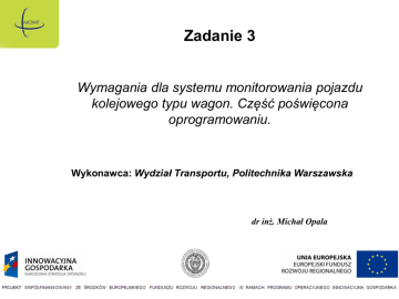 Zadanie 3 Wymagania dla systemu monitorowania pojazdu kolejowego typu wagon. Część poświęcona oprogramowaniu. Wykonawca: Wydział Transportu, Politechnika Warszawska dr inż. Michał Opala Treść • Wstęp - struktura systemu • Wymagania funkcjonalne - Tryby pracy - Typy danych • Algorytmy monitorowania stanu - Algorytmy monitorujące poprawność działania badanego systemu - Algorytmy monitorowania badanego zjawiska - Algorytmy diagnostyczne • Serwer systemu Struktura systemu Czujniki Łącze przewodowe Jednostka Akwizycji Danych Serwer Łącze GSM Wymagania funkcjonalne - Tryby pracy • Rejestracja danych z czujników zamontowanych na pojeździe odbywa się okresowo, tzn. wtedy gdy pojazd znajduje się w ruchu a prędkość jazdy jest większa od przyjętej prędkości minimalnej np. vmin = 20km/h. Pomiary są dokonywane przy stałej prędkości jazdy. • Częstotliwość zbierania danych uzależniona jest od prędkości pojazdu, może być ona obliczona na podstawie przyjętej stałej częstotliwości spacjalnej. Przykład: Jeżeli dane mają być zapisywane co 0.2m przebytej drogi, częstotliwość spacjalna wynosi fs=5m-1, natomiast częstotliwość wynosi f=fs*v [Hz], gdzie fs-częstotliwość spacjalna, v- prędkość pojazdu [m/s]. Przewidywana maksymalna częstotliwość próbkowania jest ok. 500Hz na jeden kanał (dla prędkości pojazdu rzędu 360km/h). Wymagania funkcjonalne c.d. - Typy danych Nagłówek Data Czas Położenie geograficzne Numer pociągu/numer wagonu / jednostki akwizycji danych Prędkość pojazdu Identyfikator bloku danych Liczba kolumn w bloku danych Jakość sygnału GPS (Fix) Blok danych Droga /czas Prędkość pojazdu Kanał_1 … … … Kanał_2 … Kanał_3 … Kanał_N … Tab. 1. Struktura pakietu danych Wymagania funkcjonalne c.d. - Typy danych Wielkość (bajty) Pole danych Nagłówek Blok danych Data 8 Czas 8 Położenie geograficzne 8 Numer pociągu / wagonu / jednostki akwizycji 8 Prędkość pojazdu 2 Identyfikator bloku danych 8 Liczba kolumn w bloku danych 2 Jakość sygnału GPS (Fix) 2 Droga/czas 2 Prędkość jazdy 2 Kanał_1 4 … 4 Kanał_N 4 Tab. 2. Orientacyjne rozmiary pól danych Algorytmy monitorowania stanu - monitorowanie poprawności działania badanego systemu Kontroli podlegają następujące obszary: - wszystkie tory wejściowe i wyjściowe (np. kontrola dopuszczalnych wartości maksymalnych i minimalnych) - komunikacja (utrata komunikacji) - rozmiar wolnej przestrzeni na dysku/pamięci nieulotnej - rozmiar wolnej pamięci RAM -obciążenie CPU W przypadku wystąpienia problemów w którymkolwiek z obszarów, generowane jest i zapisywane do pliku zdarzenie (ostrzeżenie, alarm), zdarzenie to zawiera podstawowe informacje potrzebne do zlokalizowania niesprawności np. numer toru wejściowego podającego niepoprawne wartości oraz wartości przykładowe. Algorytmy monitorowania stanu c.d. - monitorowanie badanego zjawiska Dane z czujników Czekaj… Nie Prędkość jazdy V > Vmin ? Tak Algorytm sprawdzający możliwość zapisu Dopisz dane do bloku Rys. 1. Algorytm monitorowania Nie Maksymalny rozmiar pakietu osiągnięty? Tak Zamknij plik pakietu Algorytm klasyfikacji pakietów Algorytmy monitorowania stanu c.d. - monitorowanie badanego zjawiska Dane Tak Nie Plik pakietu otwarty? Tak Rys. 2. Algorytm sprawdzający możliwość zapisu Czy jest wolne miejsce? Nie Usuń stare pakiety Utwórz nowy pakiet Dopisz dane do bloku Algorytmy monitorowania stanu c.d. - monitorowanie badanego zjawiska Dane z czujników Czekaj… Nie Prędkość jazdy V > Vmin ? Tak Algorytm sprawdzający możliwość zapisu Dopisz dane do bloku Rys. 1. Algorytm monitorowania Nie Maksymalny rozmiar pakietu osiągnięty? Tak Zamknij plik pakietu Algorytm klasyfikacji pakietów Algorytmy monitorowania stanu c.d. - monitorowanie badanego zjawiska Zamknij plik pakietu Rys. 3. Algorytm klasyfikacji pakietów Analiza danych pakietu Generuj ostrzeżenie Tak Nie Warunki brzegowe przekroczone? Umieść pakiet w kolejce do przesłania Inkrementacja licznika pakietów Tak Nie Próba komunikacji, wyślij pakiet Zeruj licznik Licznik osiągnął limit? Wyjście Algorytmy monitorowania stanu c.d. - diagnozowanie Dane z pojedynczego pakietu Obliczenie wartości min., maks., śred., RMS dla przyśpieszeń pionowych i poprzecznych Porównanie z wartościami dopuszczalnymi wg. PN-EN 14363 Utworzenie histogramów rozkładu empirycznego wartości przyśpieszeń pionowych i poprzecznych Porównanie z wartościami dla pojazdu wzorcowego Rys. 4. Algorytm analizy diagnostycznej Porównanie z kurtozą dla pojazdu wzorcowego Tak Tak Warunki brzegowe przekroczone ? Generuj alarm Warunki brzegowe przekroczone ? Generuj ostrzeżenie Serwer systemu Nadchodzące pakiety danych i zdarzenia Nie Czy pliki zdarzeń zawierają alarmy? Tak Sortowanie według numerów wagonów Algorytm analizy diagnostycznej pakietów danych Zapis do bazy danych Przetwarzanie plików zdarzeń Tak Nie Czy analiza wykazała nieprawidłowości? Wyjście do trybu poleceń użytkownika Pokaż ostrzeżenie Rys. 5. Algorytm automatycznego przetwarzania danych nadchodzących do serwera • Koniec
